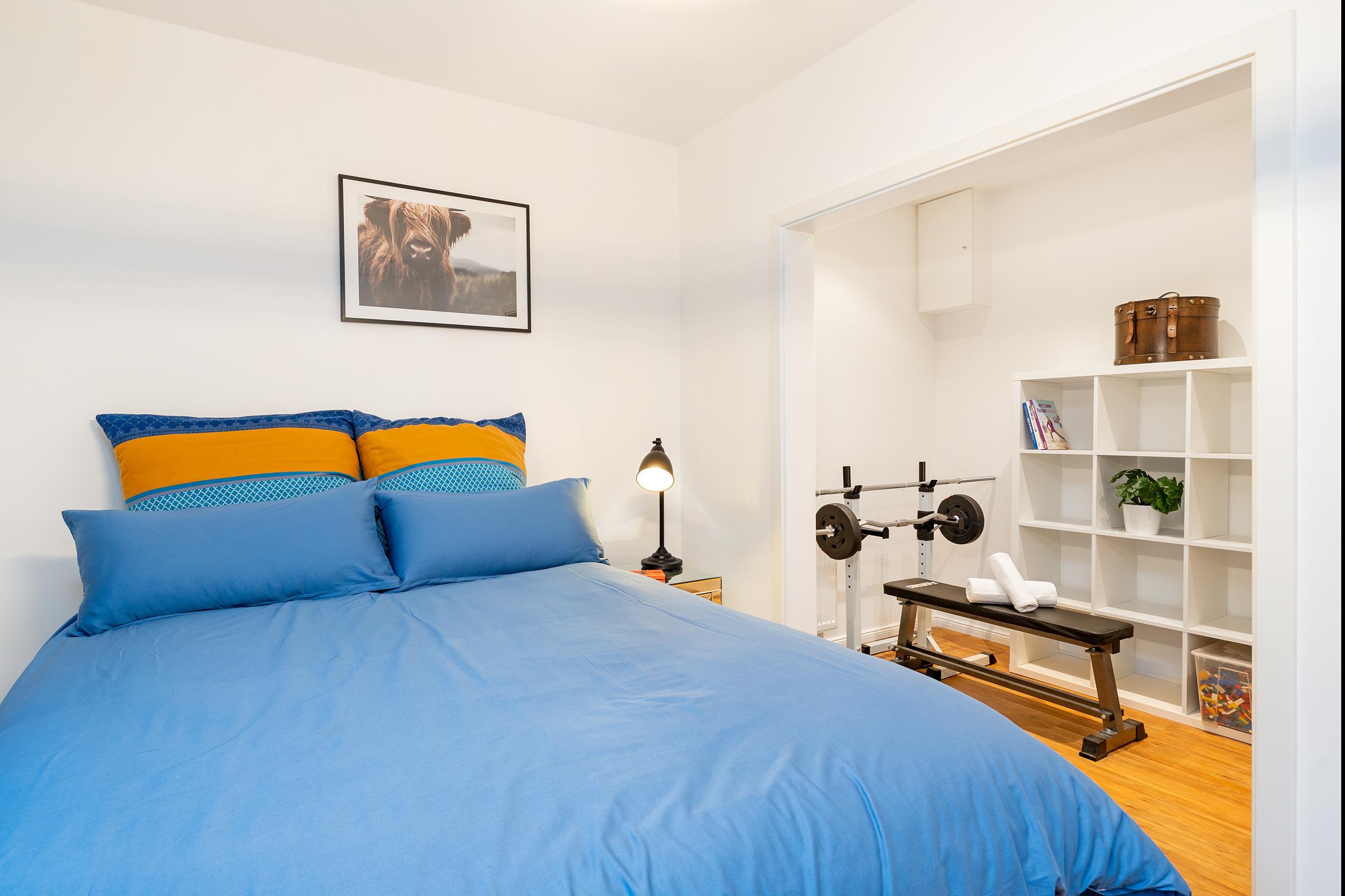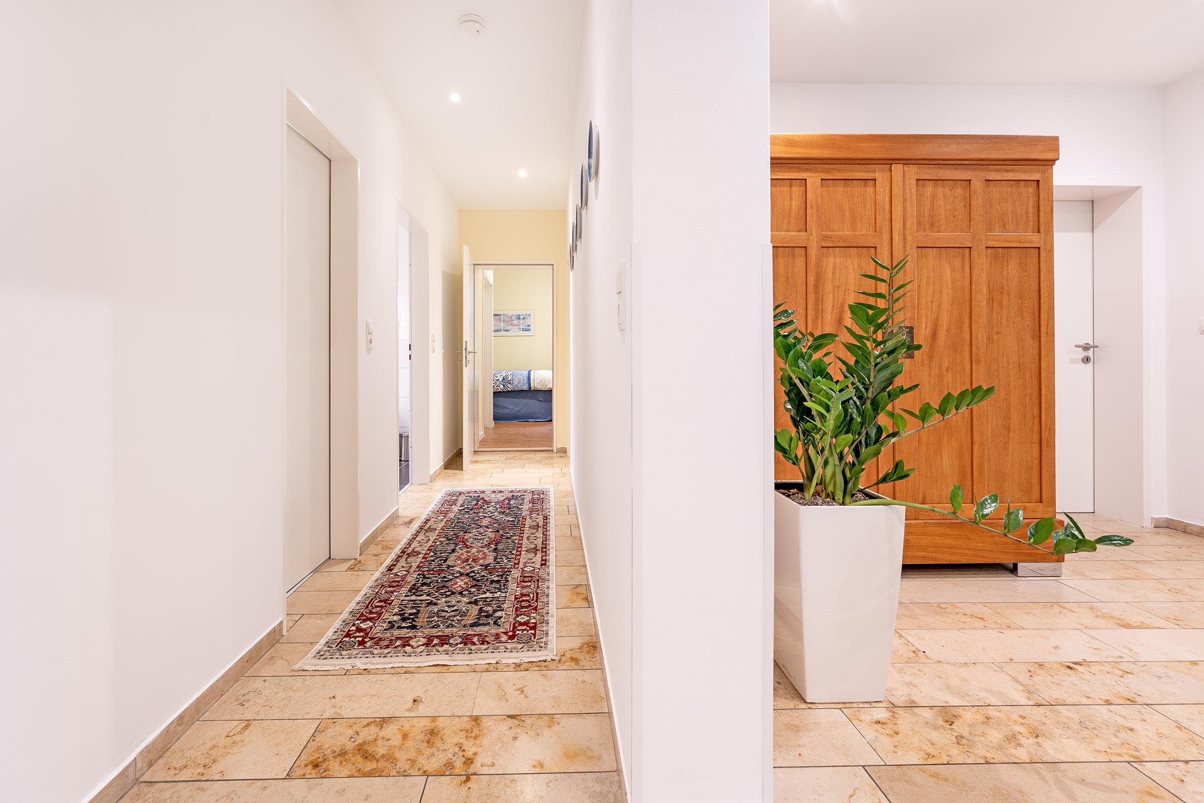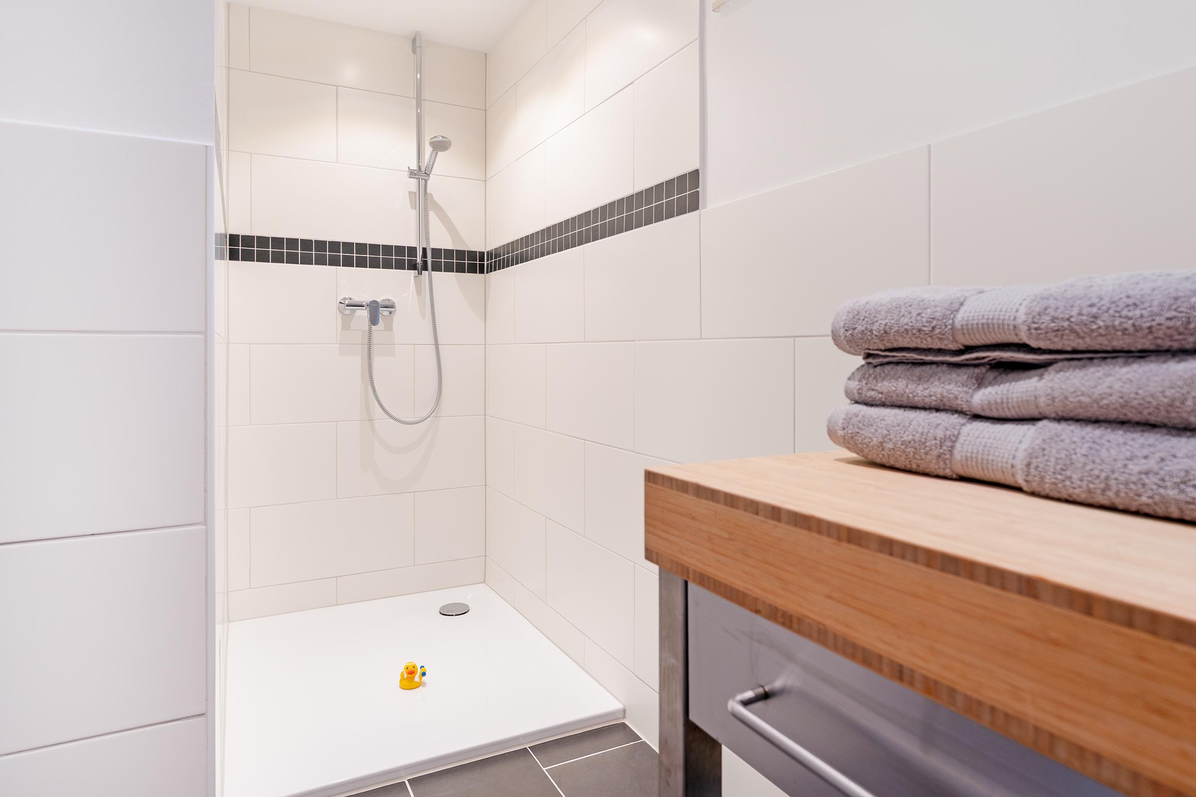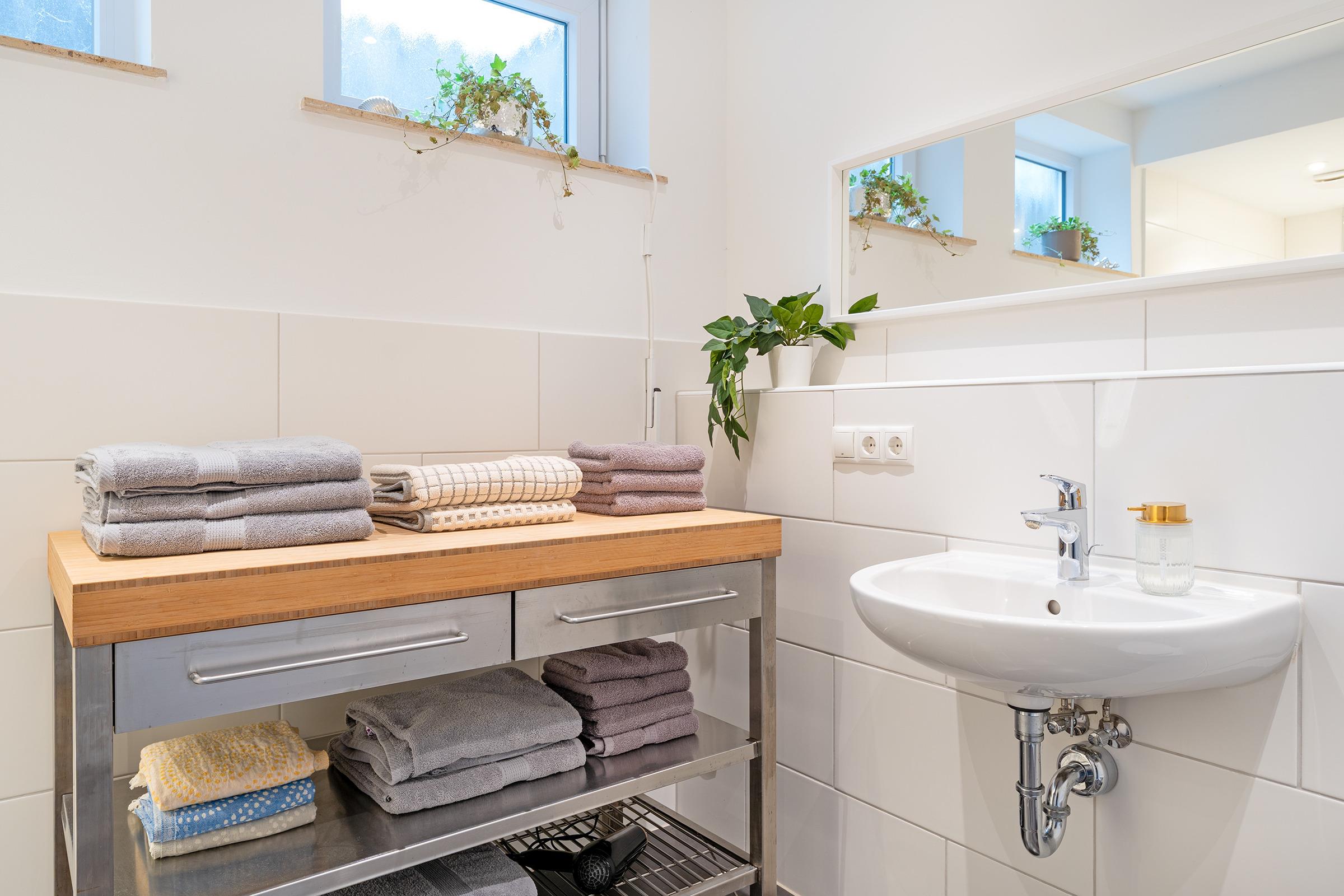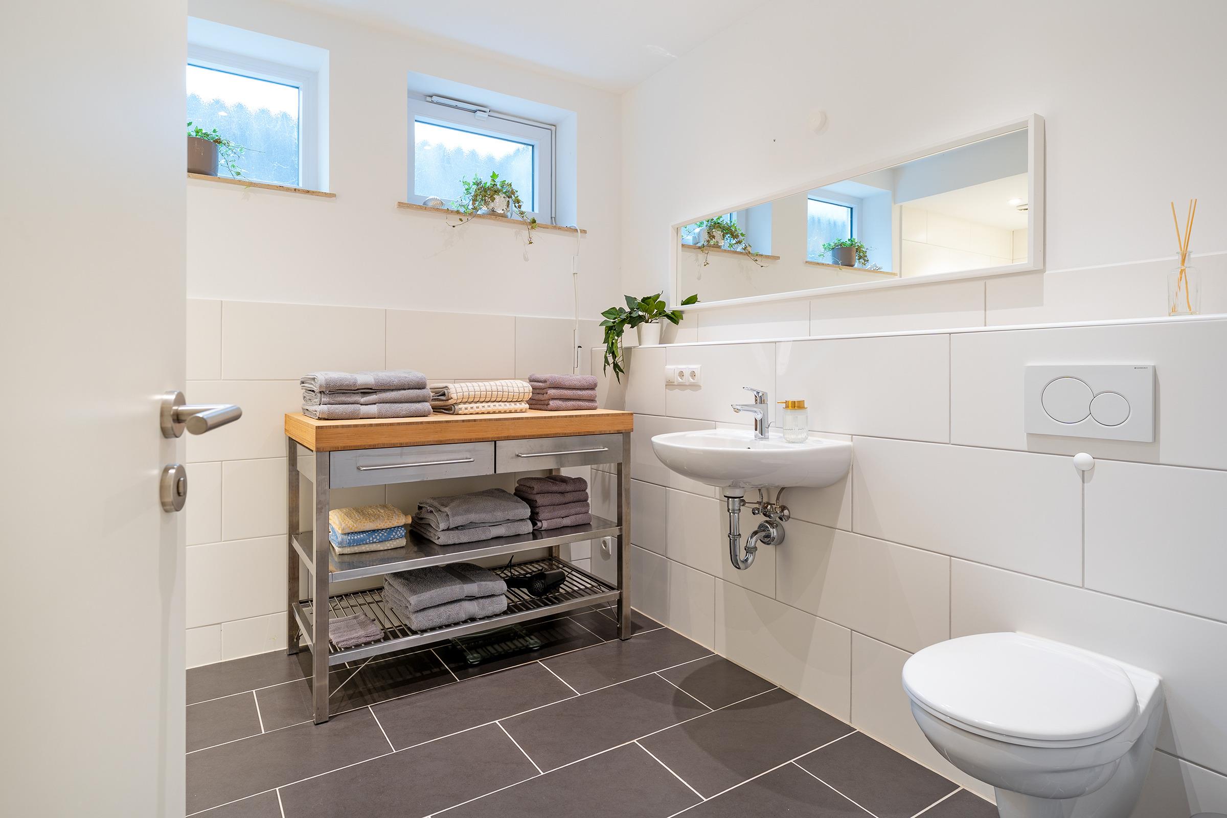 Die Schlafzimmer sind komfortabel eingerichtet – eines mit Doppelbett, eines mit französischem Doppelbett und ein weiteres mit Einzelbett – und bieten erholsame Ruhe. Im modernen Bad erwarten Sie eine bodengleiche Dusche, WC und ein beheizbarer Handtuchheizkörper und das zusätzliche Gäste-WC sorgt für extra Komfort.