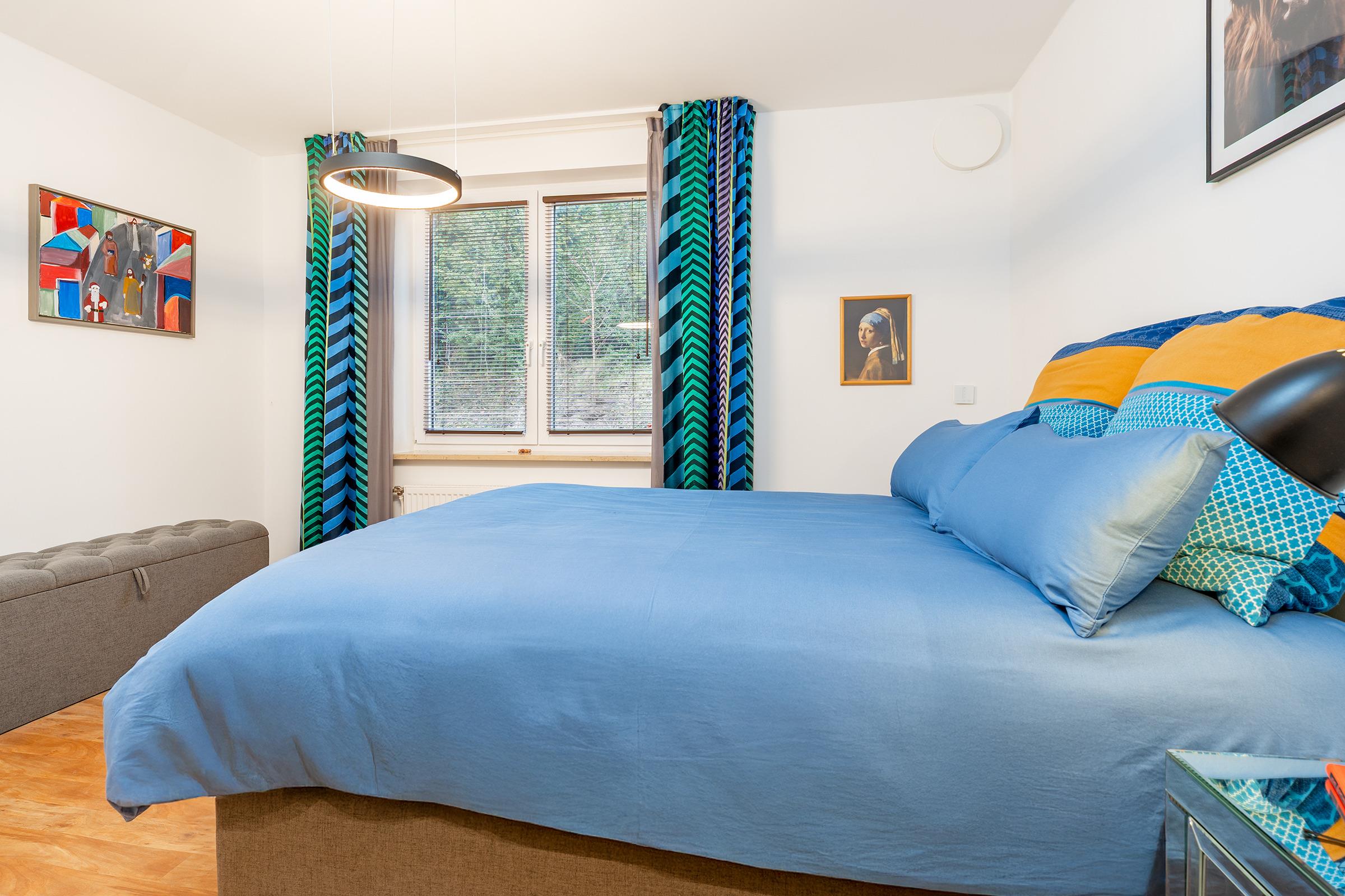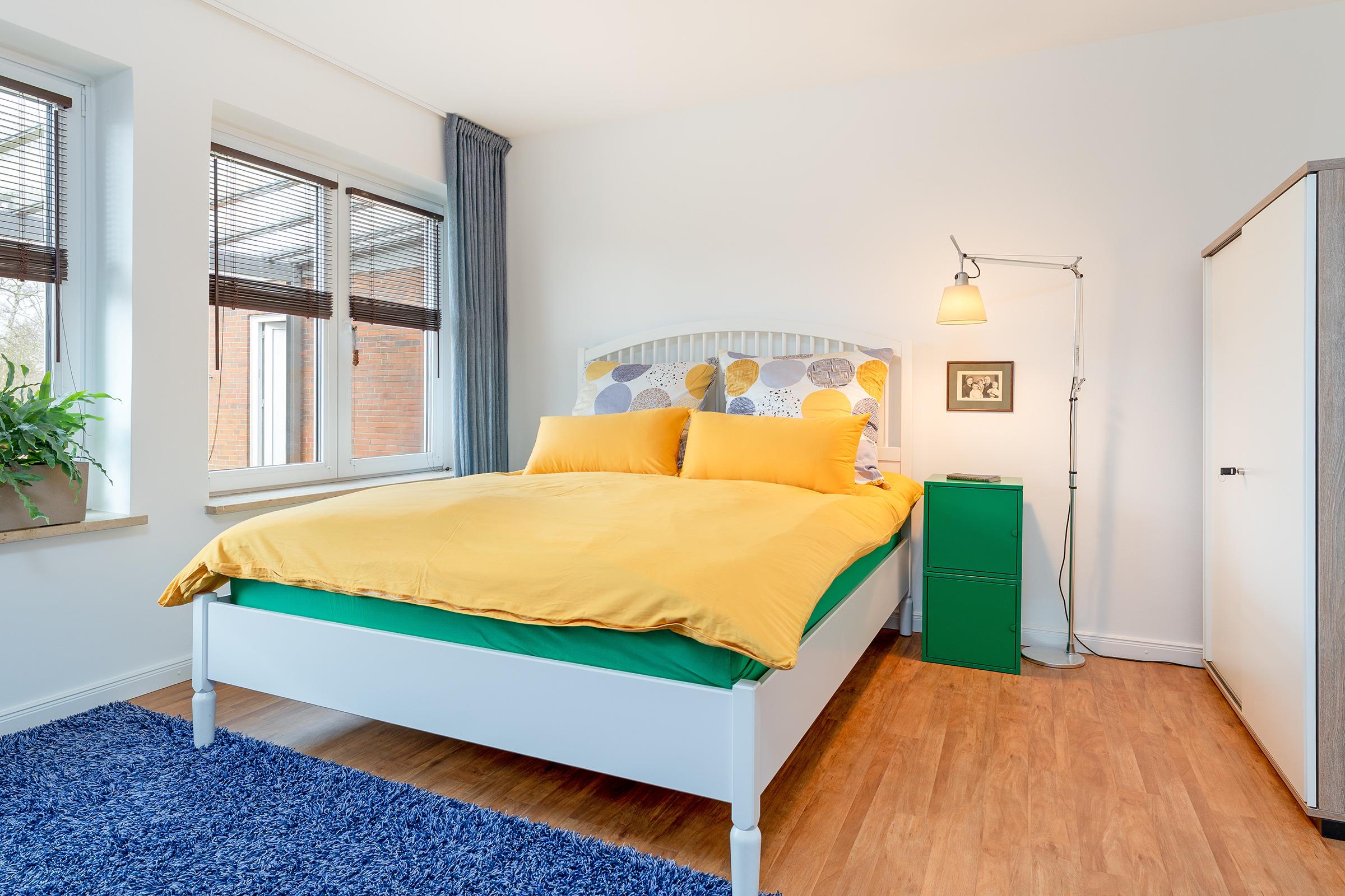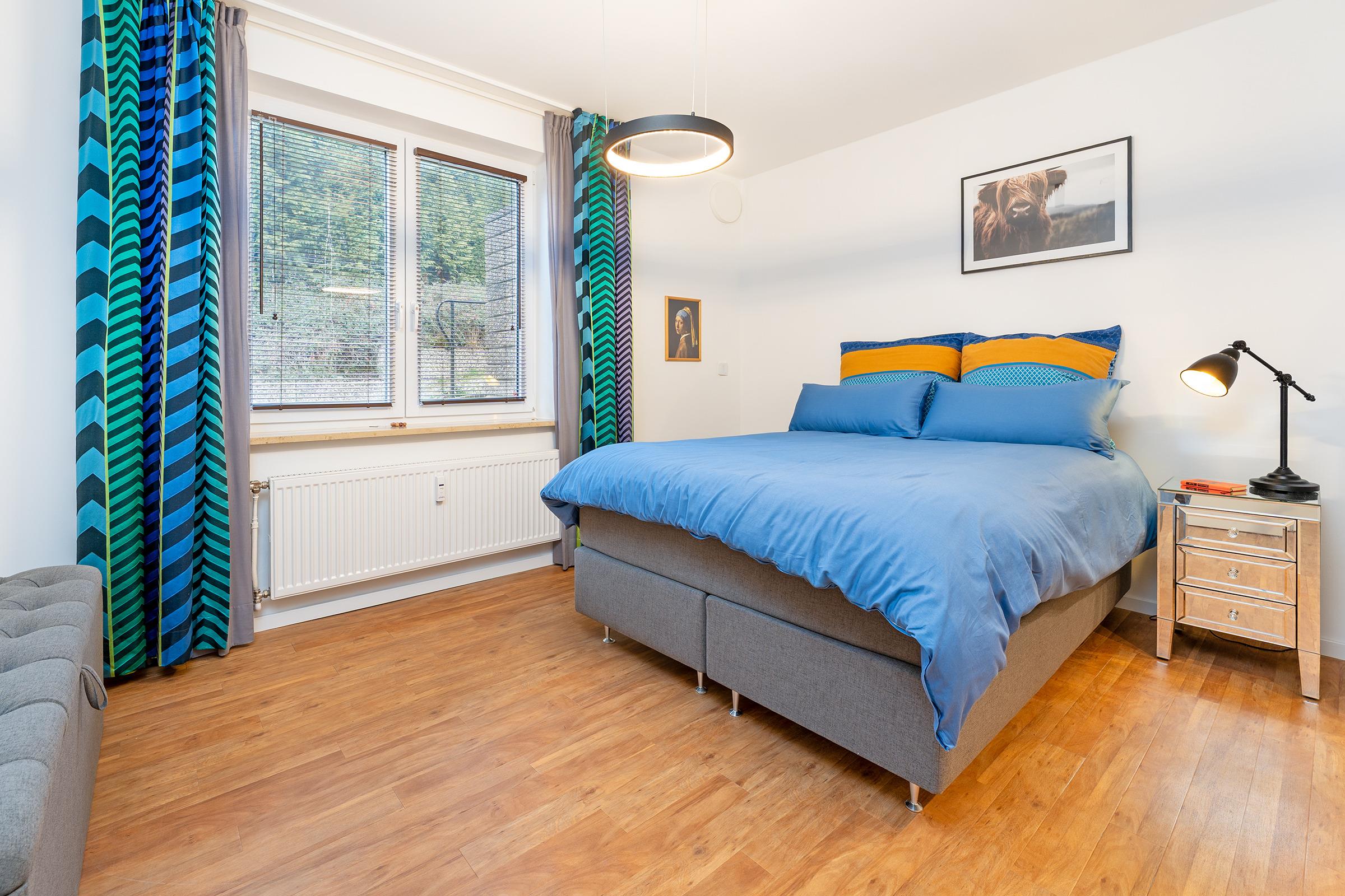 Schlafzimmer 1: 1 Boxspringdoppelbett (2x 80x200 cm, durchgehender Topper), Kleiderschrank, Verdunkelung: Rollo und Vorhang, Platz für ein Babybett vorhanden
