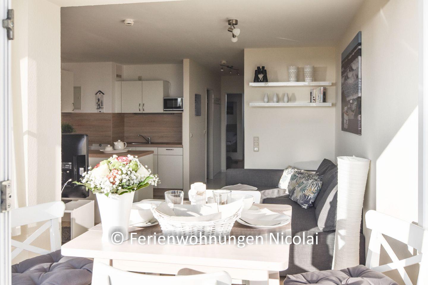 Die Wohnung ist für 2 Erwachsene und eine dritte Person ausgelegt. Die Ferienwohnung hat eine sehr schöne Raumaufteilung mit 2 Loggien. Eine Loggia liegt in Richtung Strand und hat Meerblick, die 2. Logia ist nach Süden ausgerichtet und bietet schönen Sonnenschein. Eine neue, großzügie Einbauküche bietet allen Komfort und ist komplett inkl. Spülmaschine ausgestattet. Die Ferienwohnung hat eine Gesamtwohnfläche von ca. 45qm. In der Nähe befindet sich der Strandabschnitt mit der DLRG-Station und bis zur Seebrücke sind es nur ein paar Meter. Alles ist liebevoll und modern eingerichtet und bei Ihrer Ankunft kann der Urlaub sofort beginnen, denn für die Erstausstattung ist alles vorhanden. Eine schöne, komplett renovierte Ferienwohnung für 3 Personen.
