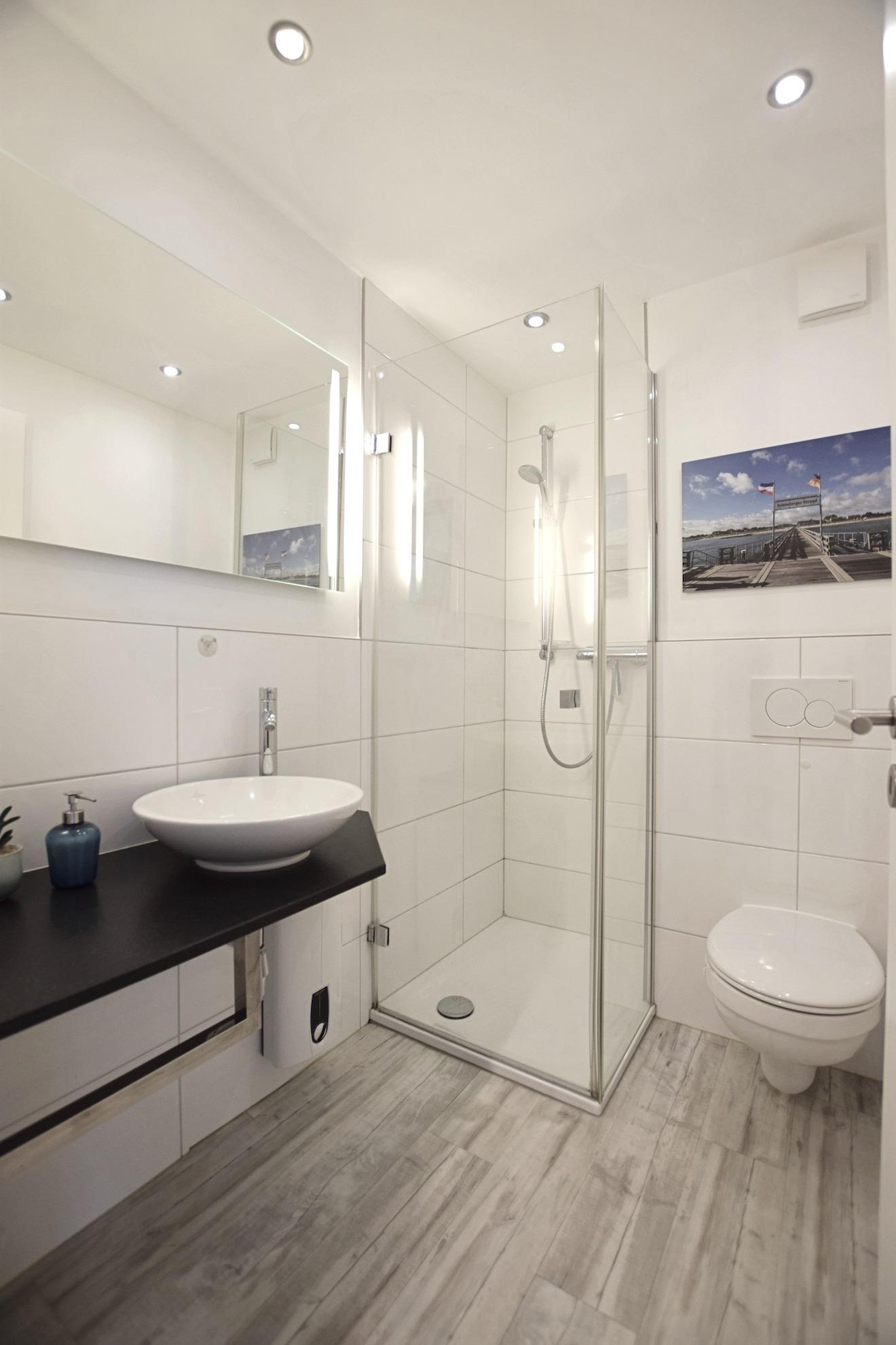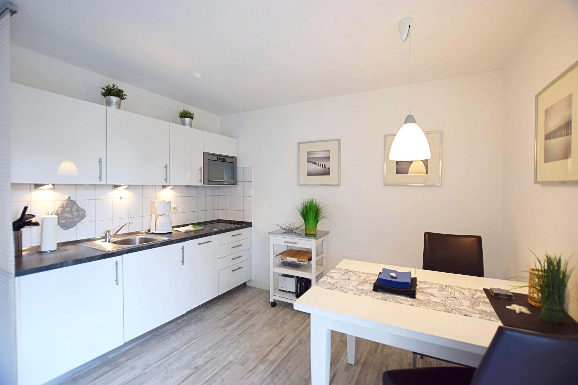 Das Appartement verfügt über ein gemütliches Wohnzimmer mit integrierter Küche, ausgestattet mitsamt einer Geschirrspülmaschine. Das geschmackvoll eingerichtete Schlafzimmer (12,7m²) bietet ein bequemes Boxspringbett sowie einen Kleiderschrank mit ausreichend Stauraum und lässt euch bei geöffnetem Fenster leise die Wellen in der Ostseebrandung hören. Das helle Badezimmer (2,9m²) verfügt über eine bodengleiche Dusche sowie das WC. Es stehen zwei moderne Fernseher zur Verfügung sowie kostenfreies HIGHSPEED-WLAN, um eure Urlaubsgrüße mit der Familie und Freunden teilen zu können.
