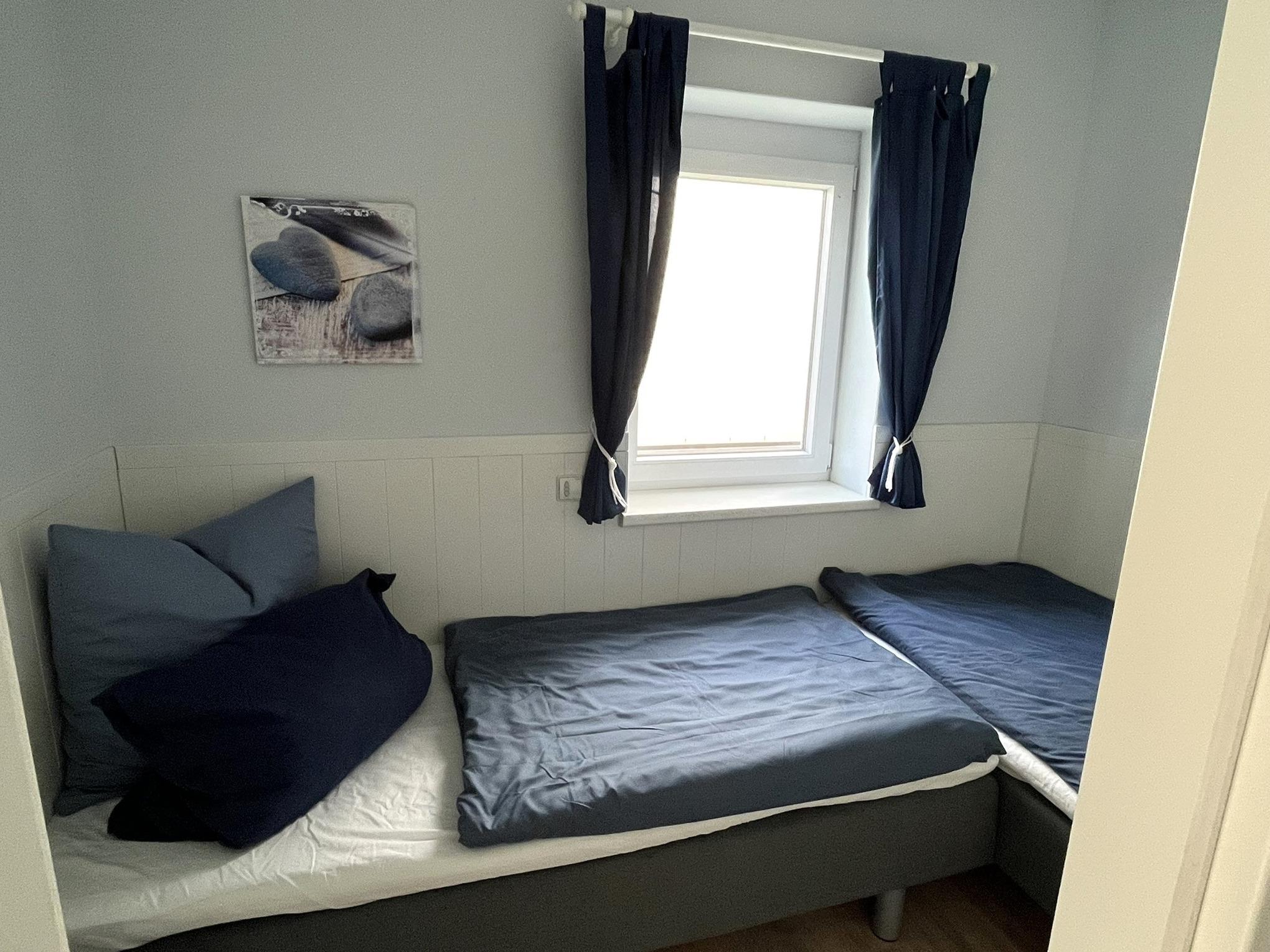 Der Schlafraum ist vom Wohnraum abgetrennt, er beherbergt zwei bequeme Boxspringbetten.