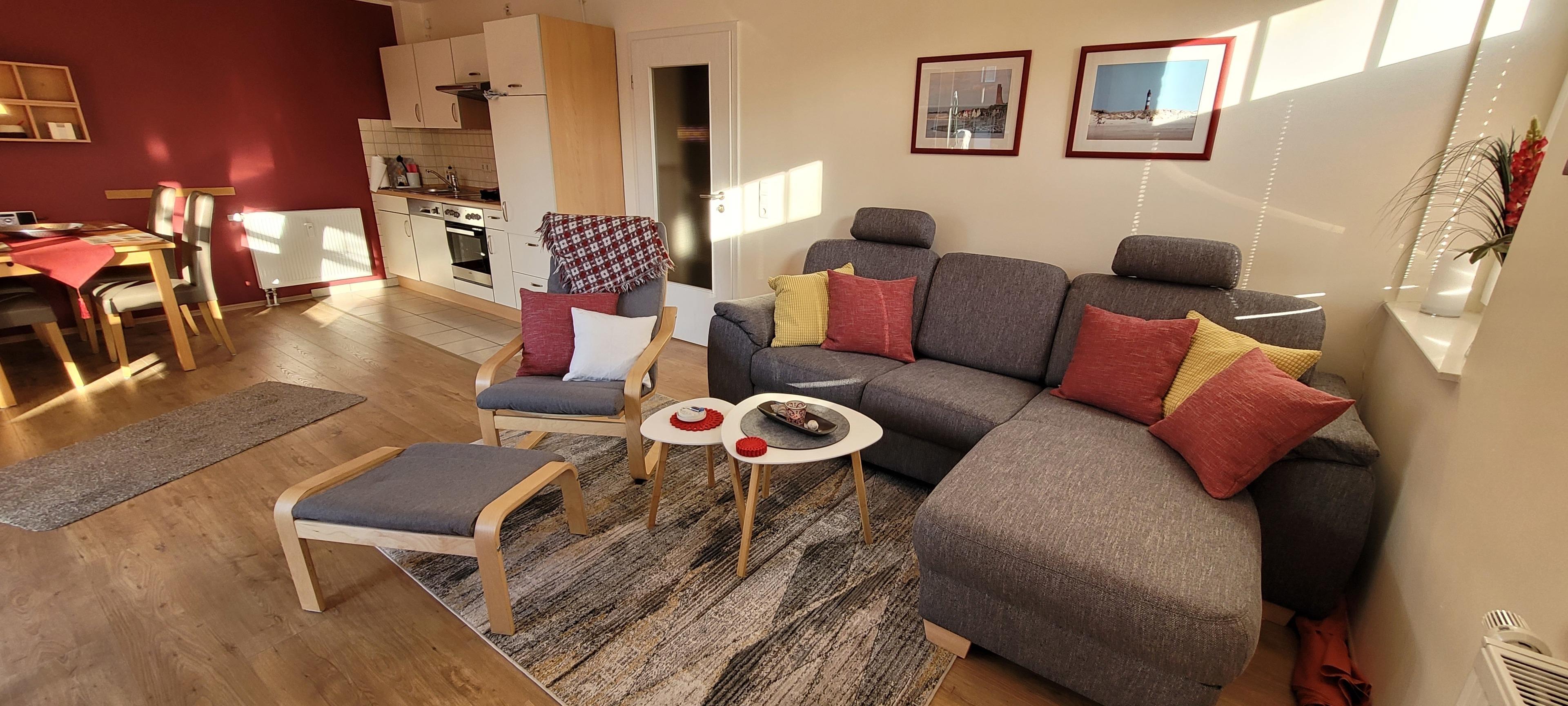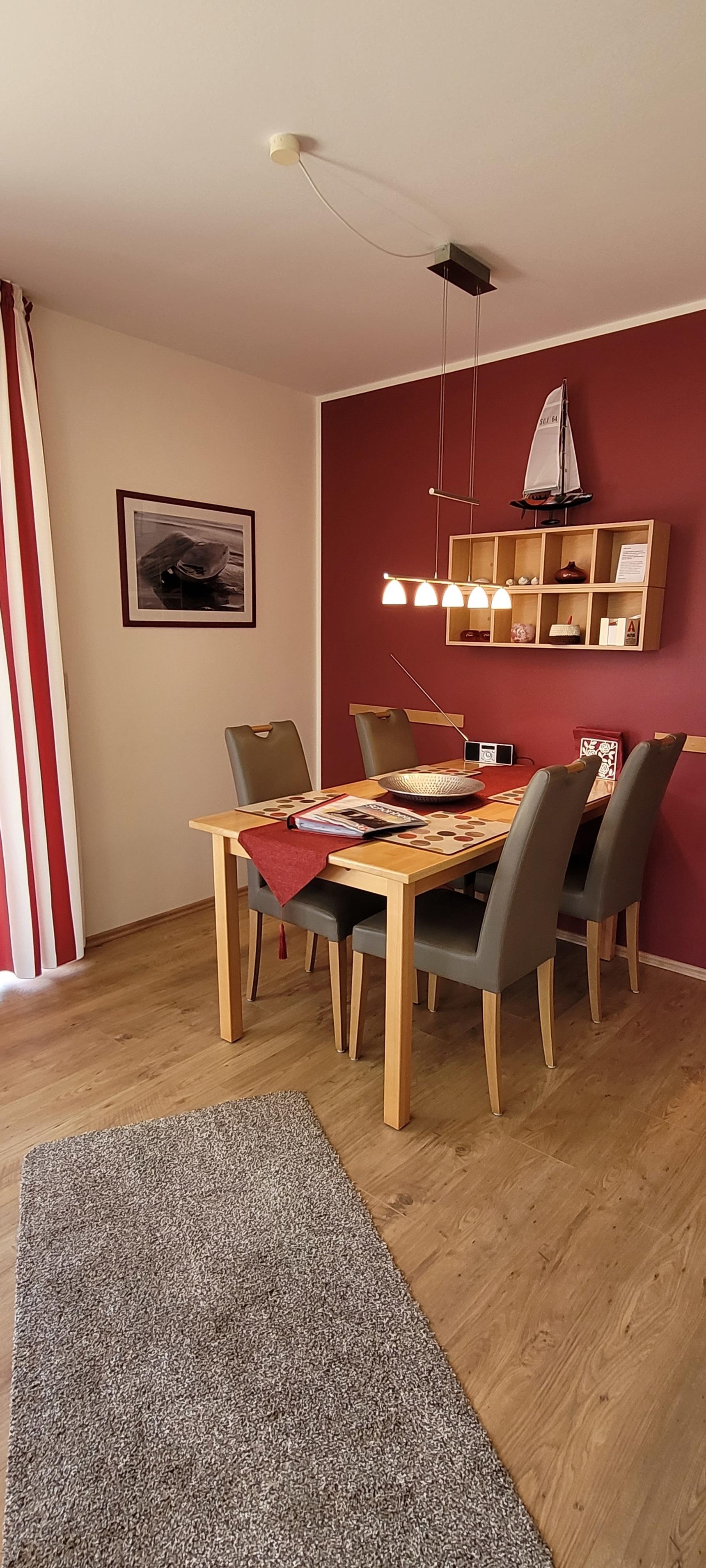 Die in den Wohnraum integrierte Küchenzeile ist mit allen notwendigen Küchengeräten, Utensilien und ausreichend Geschirr ausgestattet. Eine Spülmaschine, Kühlschrank mit Gefrierfach, Herd mit Backofen und Cerankochfeld sind selbstverständlich. Ein großer Esstisch und bequeme Stühle laden zu geselligen Mahlzeiten ein.