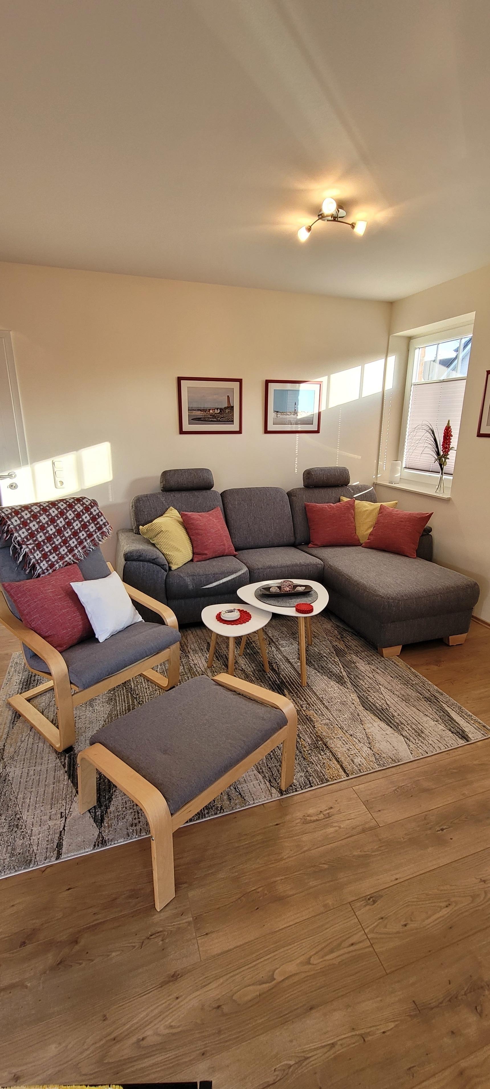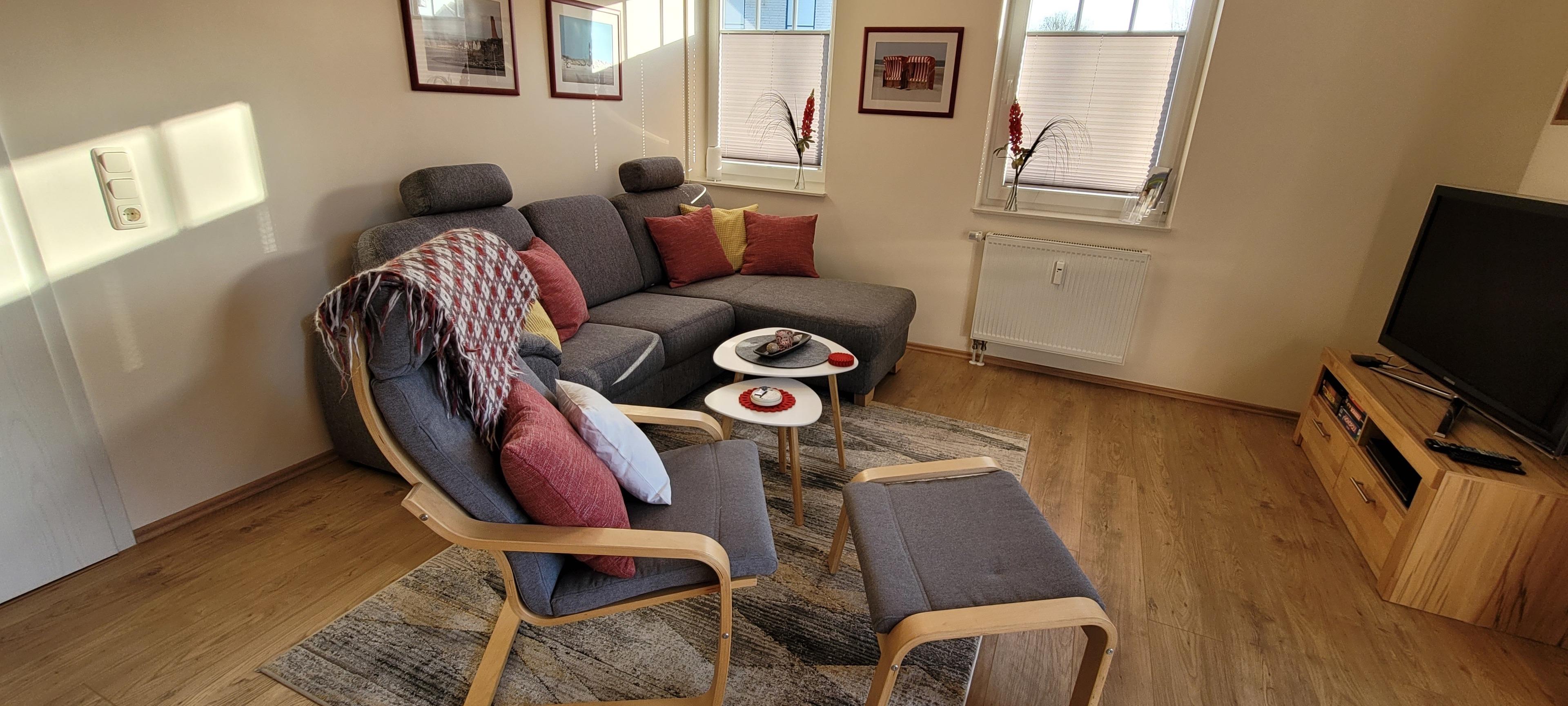 Es gibt ein 9m² großes Schlafzimmer mit einem Doppelbett (160 x 200 cm) und ein weiteres 7,9 m² großes Schlafzimmer mit zwei, über Eck stehenden, Einzelbetten (80 x 200 cm). Schrank- und Ablageflächen sind ausreichend vorhanden. Das Wohnzimmer ist mit bequemen Polstermöbeln ausgestattet und verfügt über einen großen Farb-TV mit Satellitenanlage, DVD- und CD-Player, Radio. Eine kleine Spielesammlung und diverse Bücher überbrücken auch mal einen Regentag.