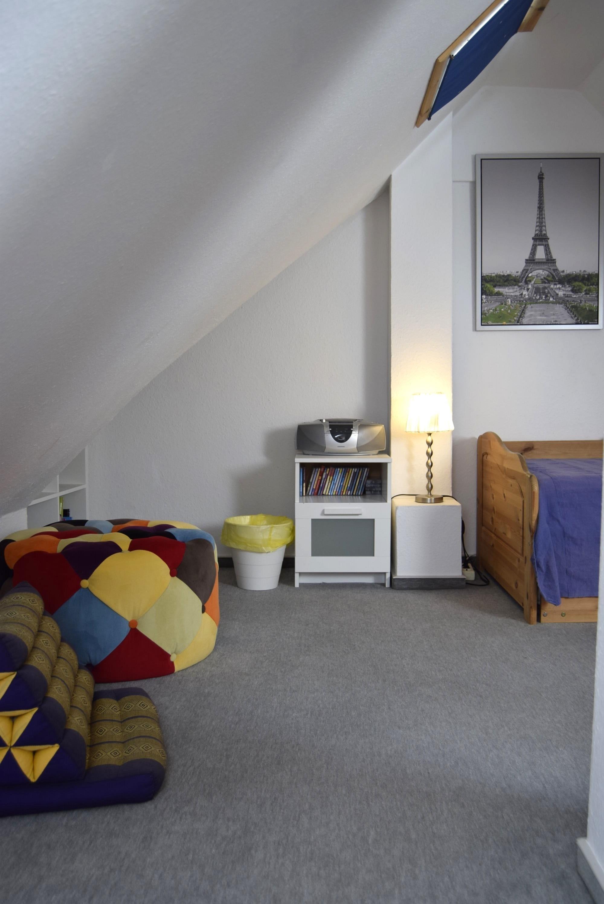 Im unteren Bereich des Appartements befindet sich das Schlafzimmer mit einem Doppelbett (Einzelmatratzen 90 x 200 cm), gemütlich unter der Dachschräge mit Liegefenster und einem neuen, geräumigen Schlafzimmerschrank. Das moderne Dusch-Badezimmer mit Fußbodenheizung wurde in jüngster Vergangenheit komplett saniert.