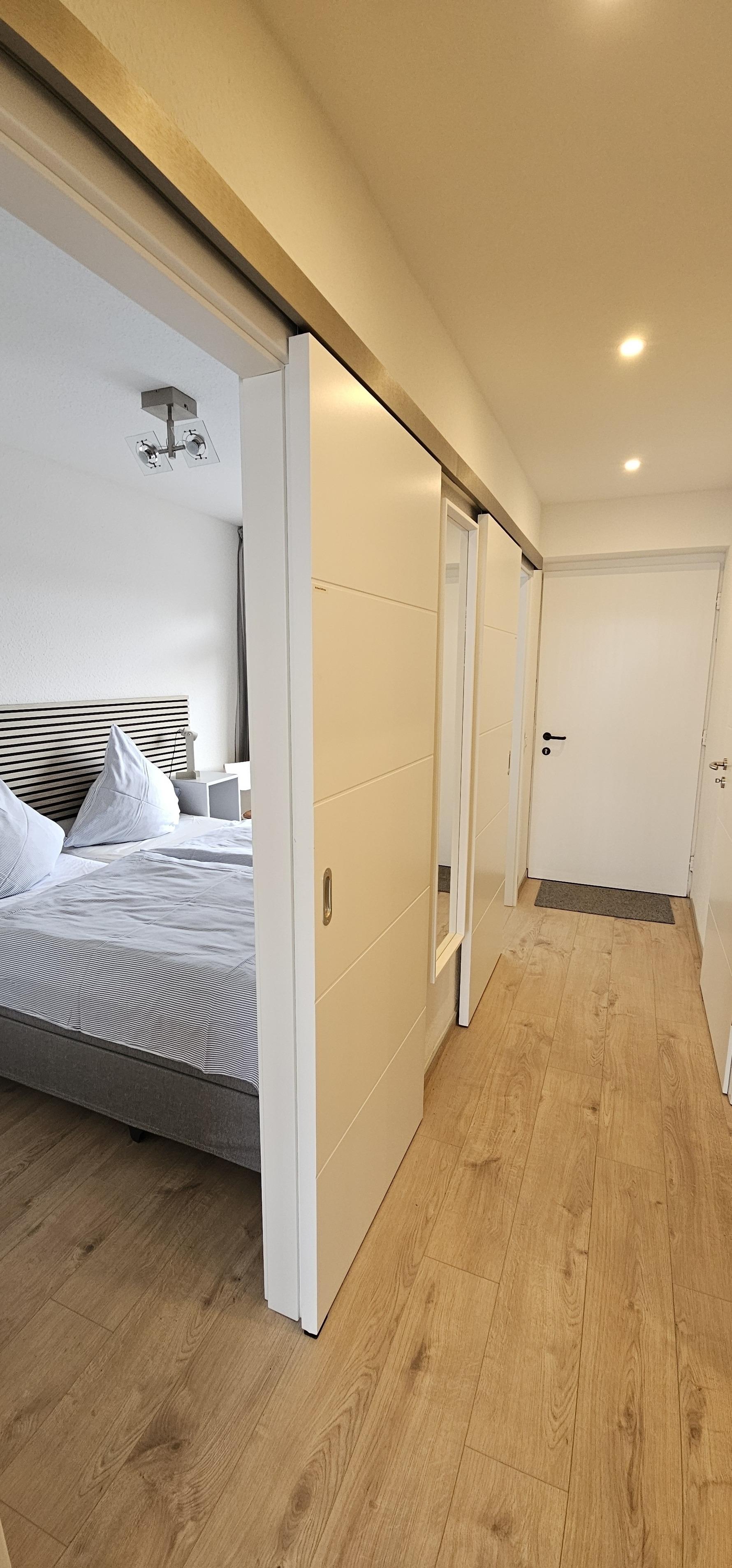 Im Schlafzimmer, das durch 2 Schiebetüren zugänglich ist, befinden sich ein bequemes Doppelbett sowie ein großer Schrank mit ausreichend Stauraum. Ein weiteres Zimmer mit seitlichem Meerblick verfügt über eine gemütliche Schlafcouch sowie einen weiteren Schrank. Das stilvolle Badezimmer ist mit einer Regendusche, einem großzügigen Waschtisch sowie Handtuchwärmer und Föhn ausgestattet.