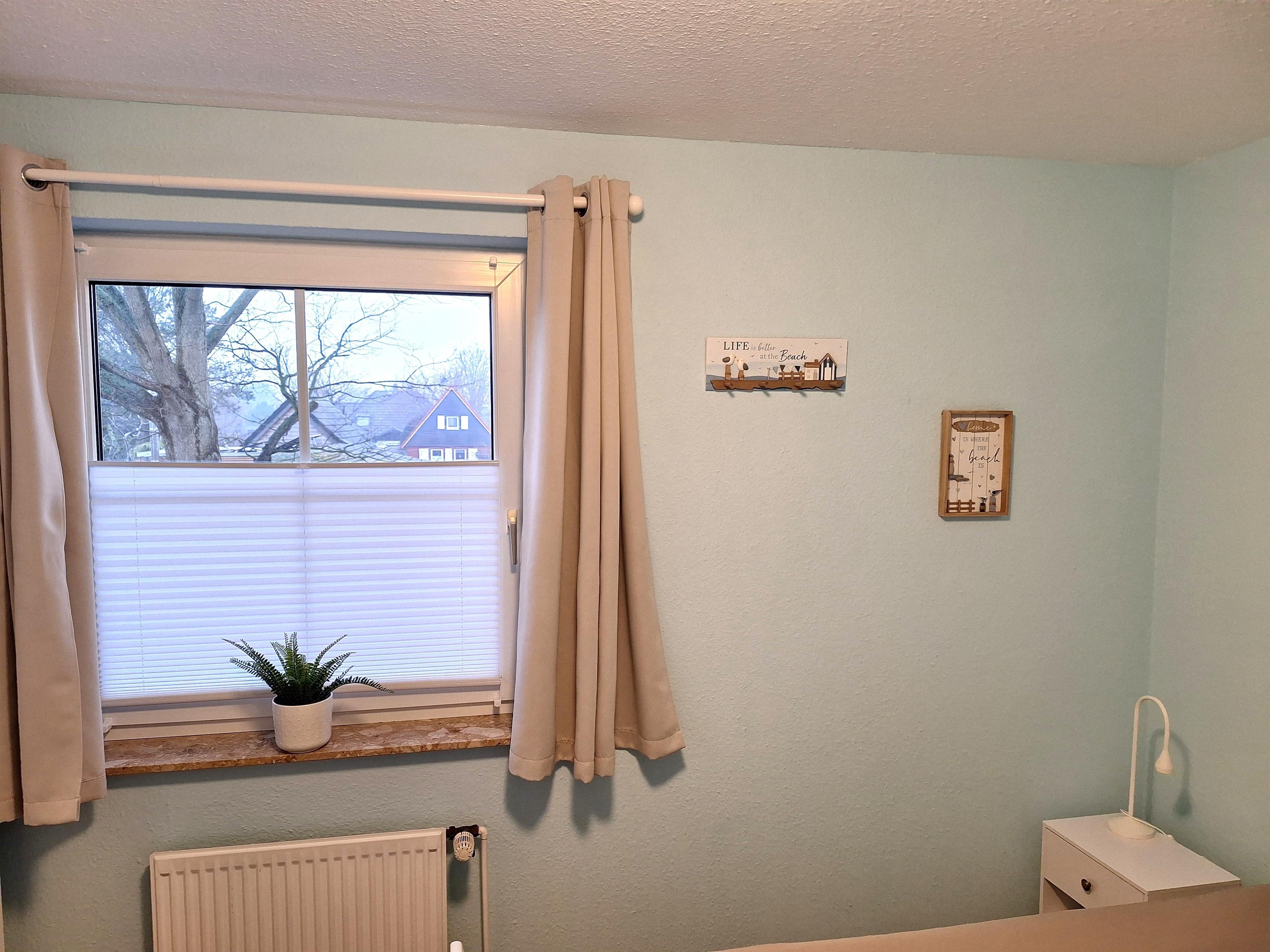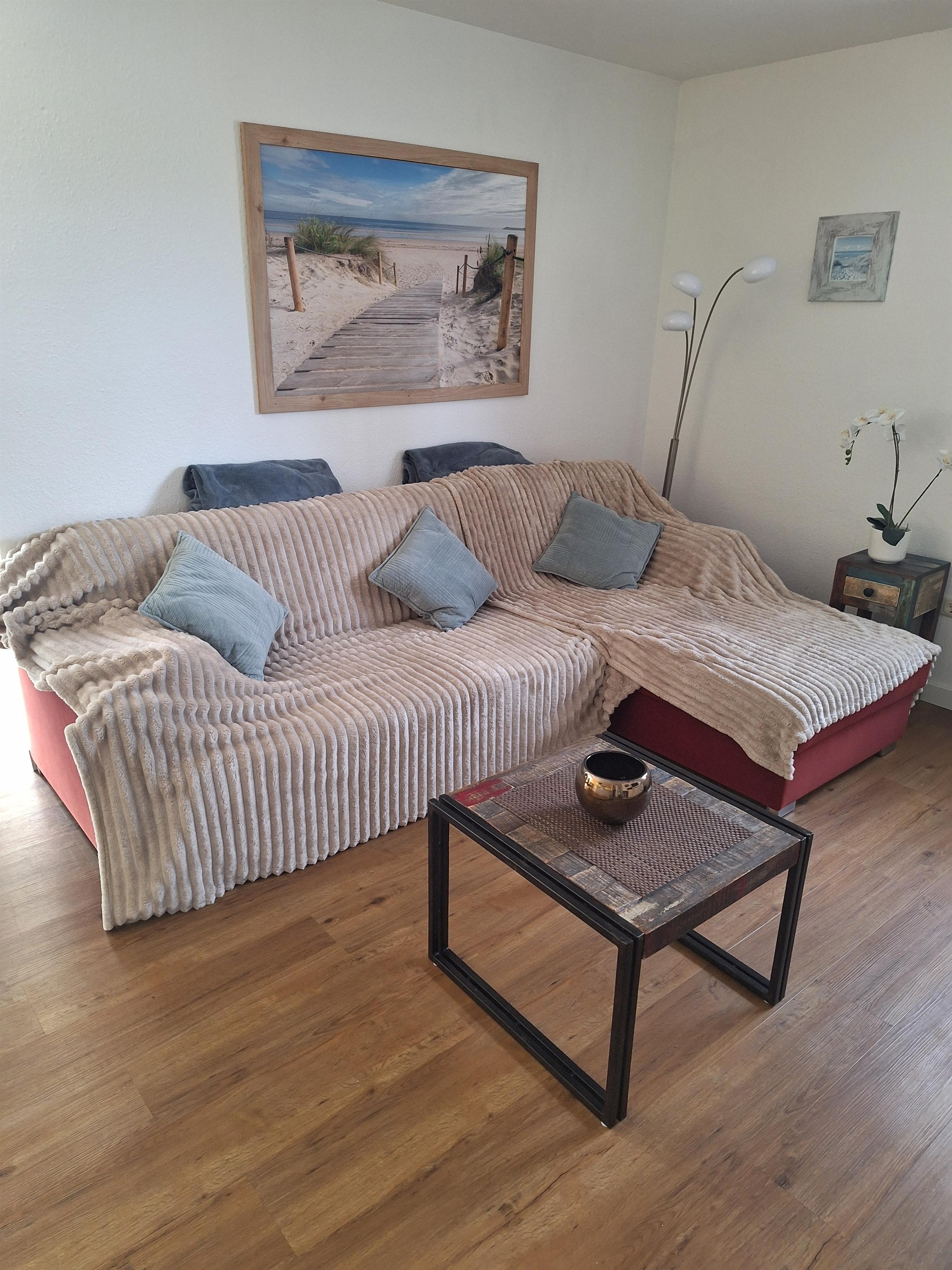 Das Ferienappartement verfügt über 2 helle Zimmer in Südwestlage. Es gibt 1 Schlafzimmer mit Doppelbett (180 x 200 cm) und geräumigem Schrank. Eine gemütliche Sitzecke steht im Wohnbereich. Hier findet sich auch die offene Küchenzeile sowie der Esstisch.