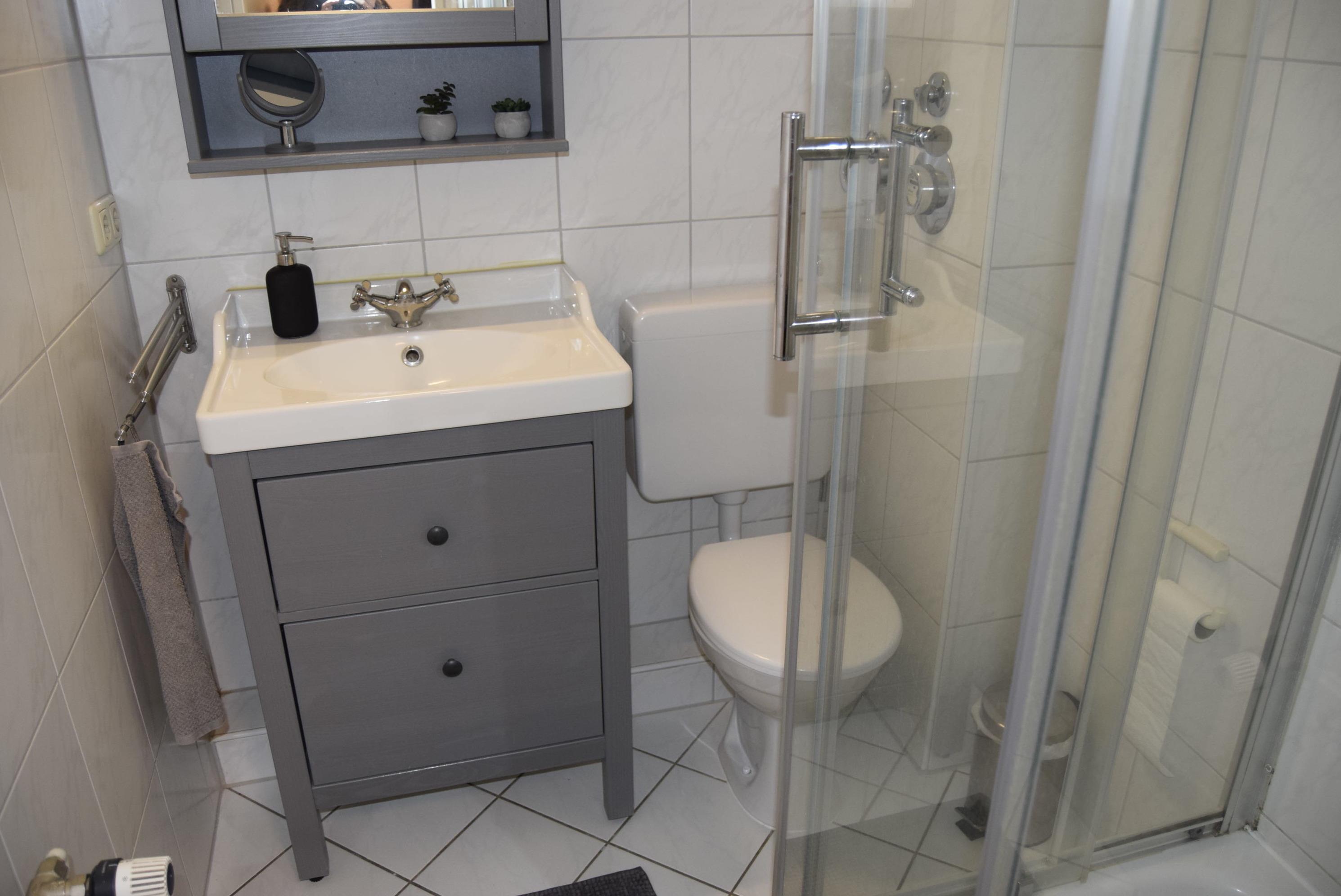 Das Badezimmer ist mit einer Dusche sowie WC ausgestattet. Die Waschmaschine, sowie Bügeleisen und Brett sind im Küchenbereich mit untergebracht.