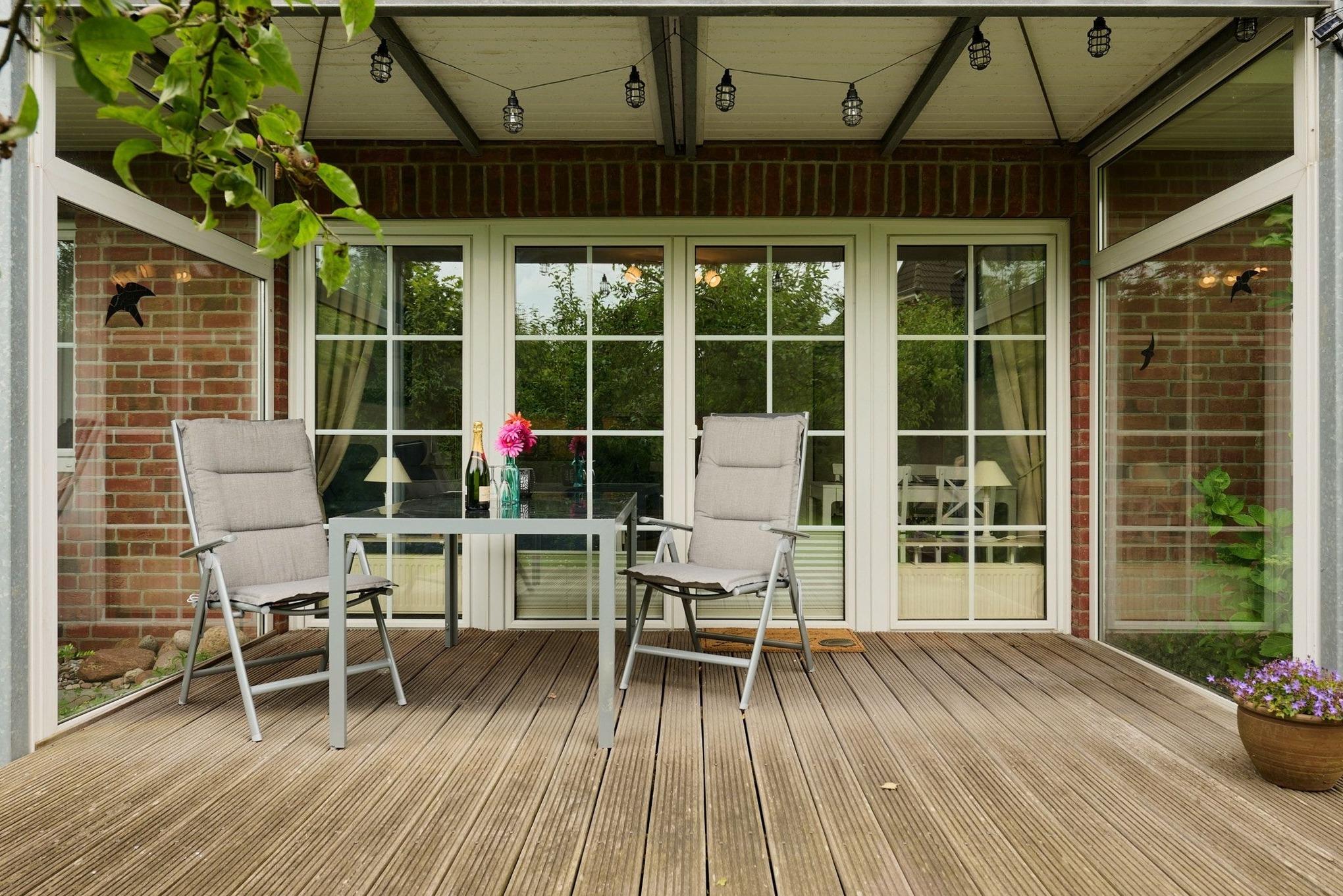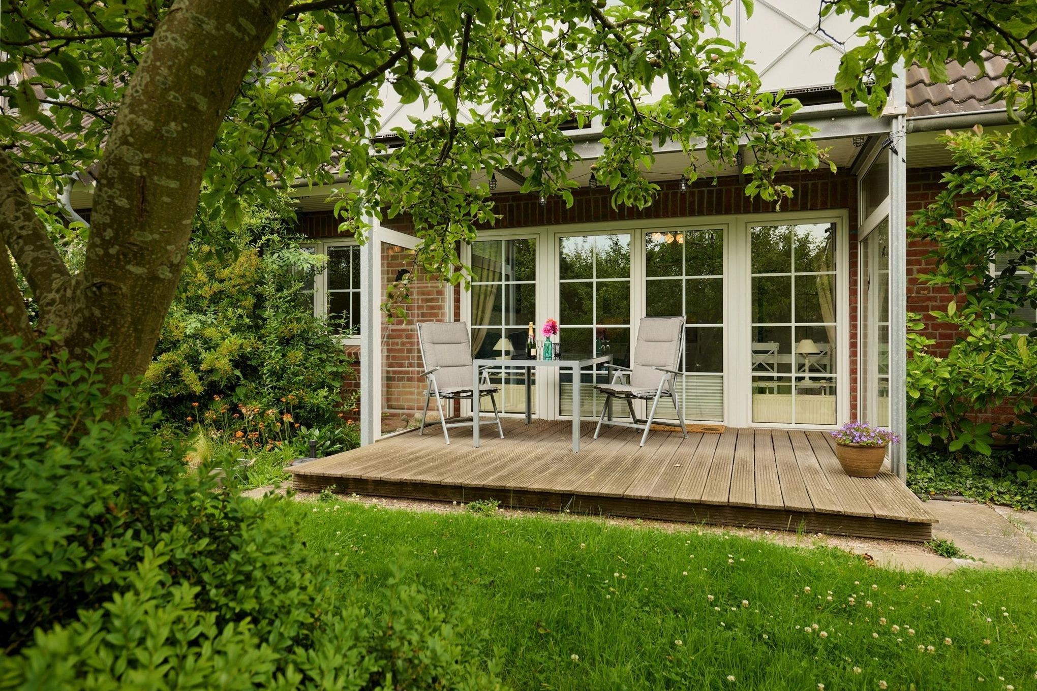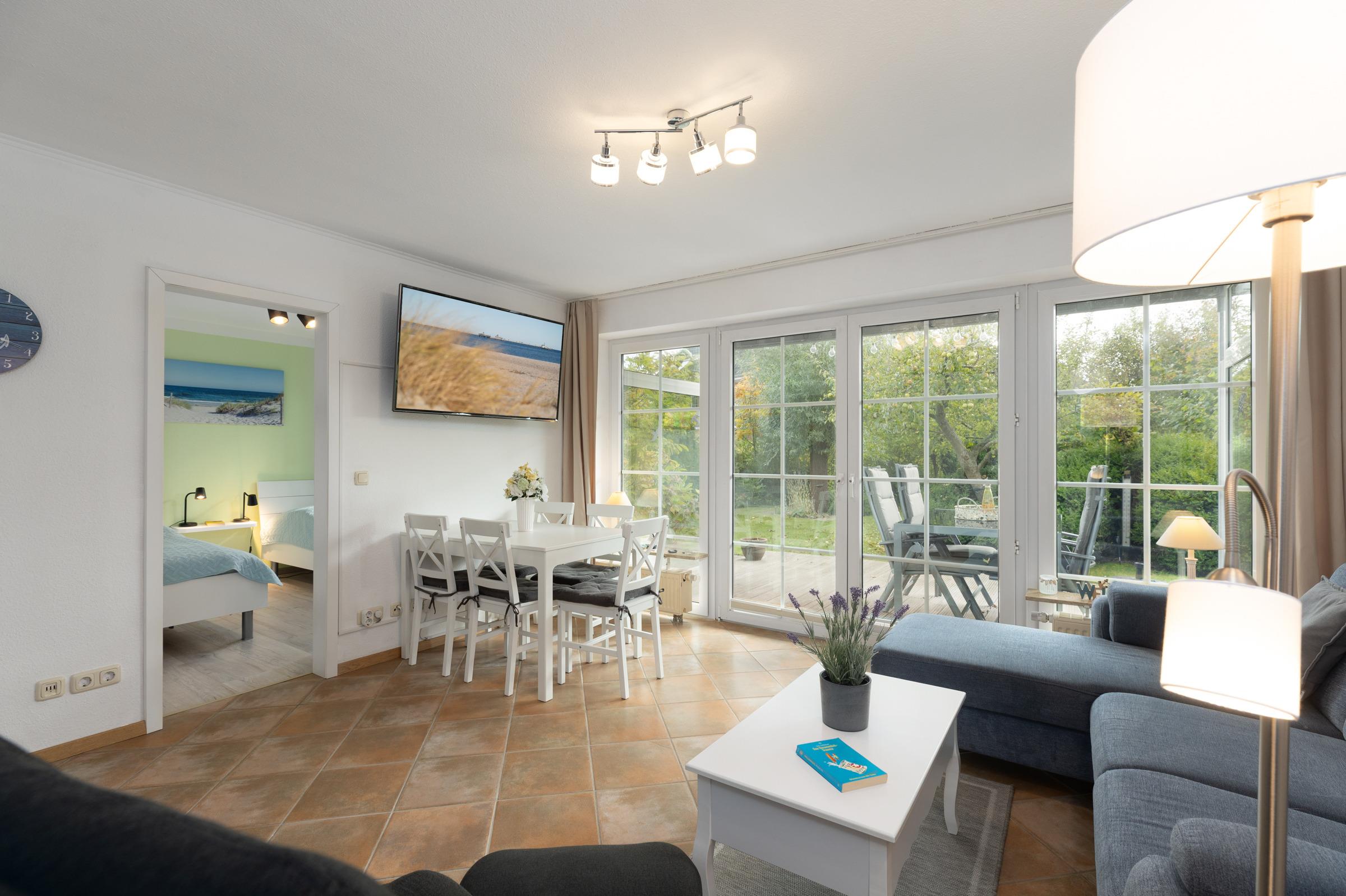 Das Mobiliar und die Ausstattung sind mit viel Geschmack und Liebe zum Detail ausgewählt. Das Zentrum des großzügigen Wohn-Küchen-Bereichs bildet ein großer ausziehbarer Esstisch, der ausreichend Platz zum Essen, Spielen oder Klönen bietet. Ein gemütliches Sofa lädt zum Lesen oder Fernsehen ein. Die moderne Küchenzeile ist mit jeglichem Komfort ausgestattet: Geschirrspülmaschine, Ceran-Kochfeld, Dunstabzug, Backofen, Kühlschrank mit Gefrierfach gehören genauso dazu wie Kaffeemaschine, Toaster, Wasserkocher oder Mixer. Eines der Schlafzimmer bietet mit seinem Doppelbett (180x200 cm) ausreichend Platz für einen erholsamen Schlaf, weitere zwei Personen finden im zweiten Schlafraum in den zwei Einzelbetten (je 90x200 cm) ihre nächtliche Ruhe. Genügend Schrankraum für Ihre Urlaubsgarderobe ist selbstverständlich ebenfalls vorhanden. Das Duschbad ist hell, freundlich und modern ausgestattet. Die Wohnung besticht vor allem auch durch ihren wunderschönen ruhigen Garten. Die gemütliche Terrasse eignet sich hervorragend für ein sonniges Frühstück oder einen Sun-Downer in der Abendsonne. Hochwertige Gartenmöbel sind selbstverständlich vorhanden.