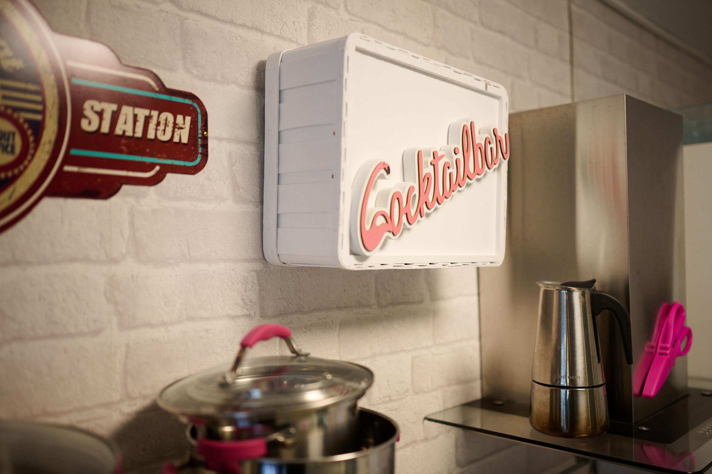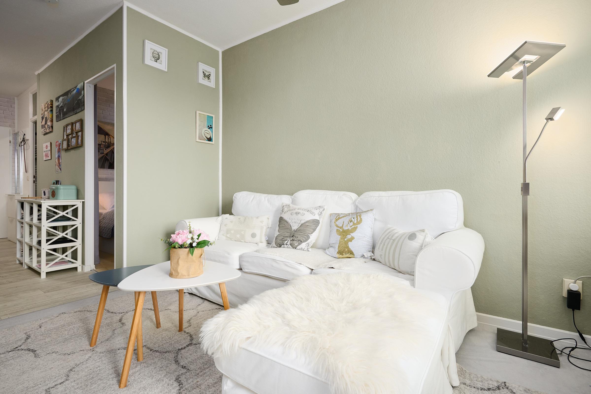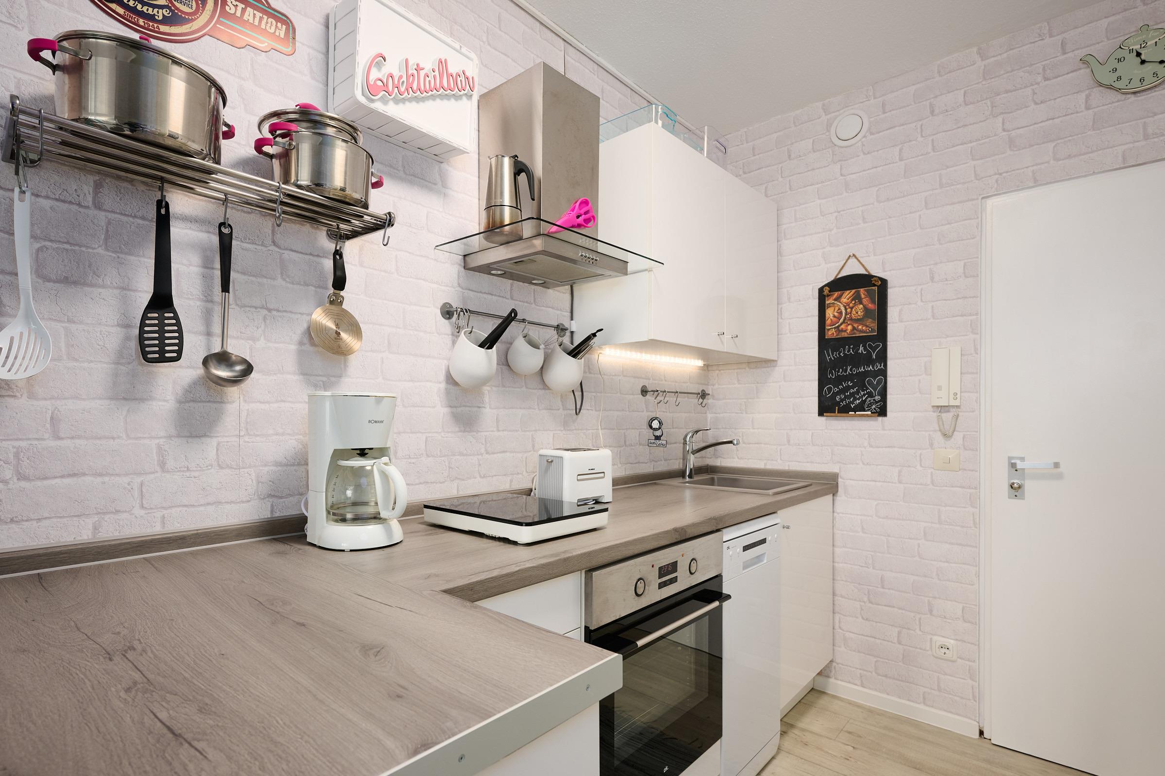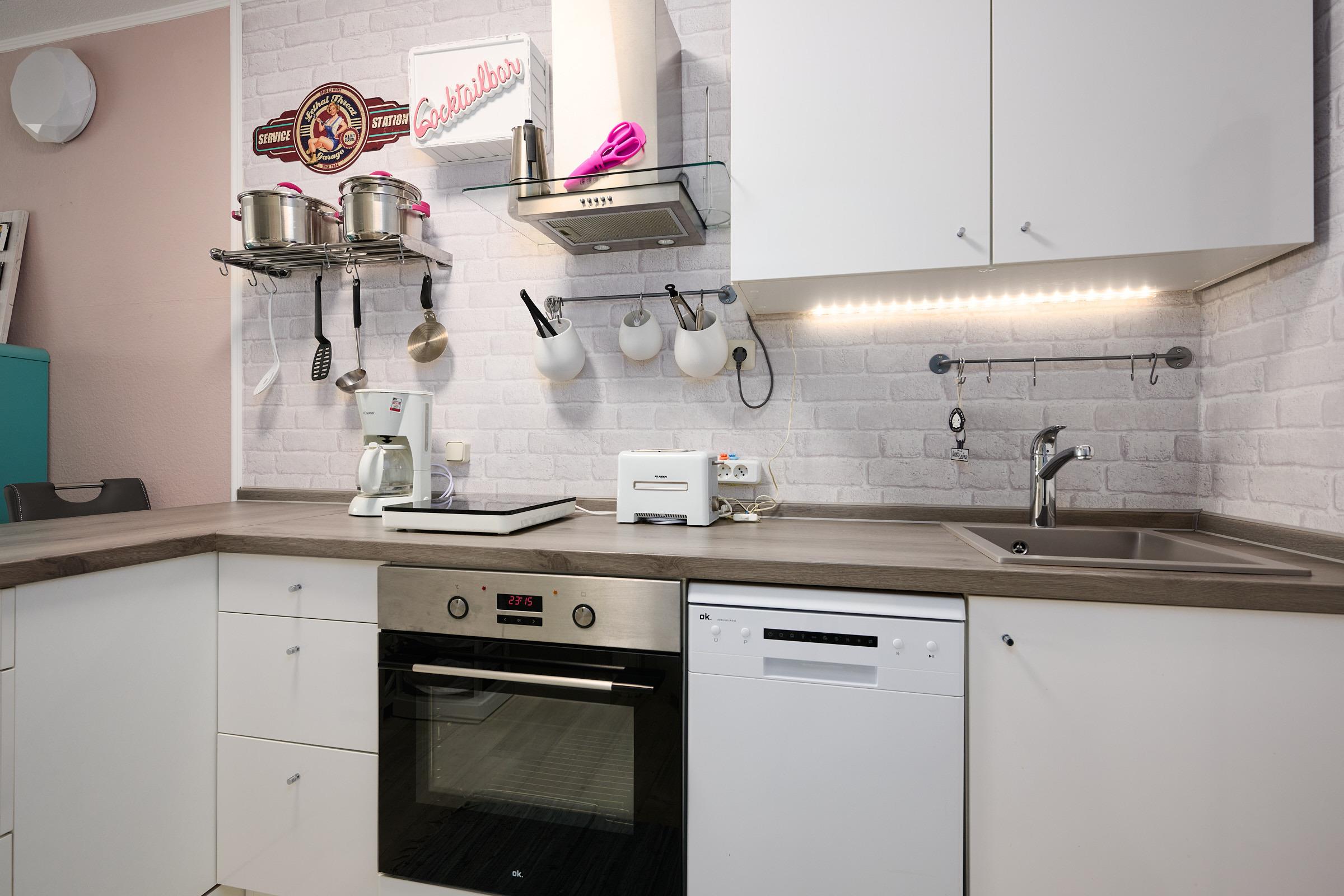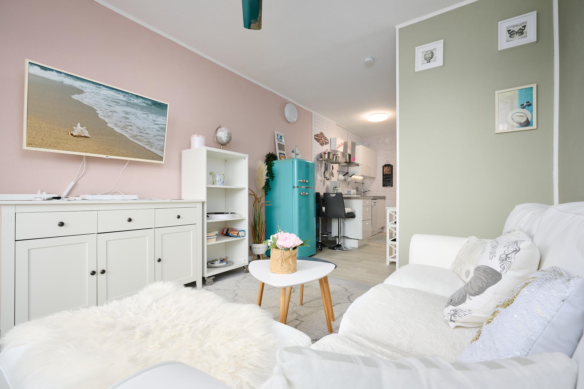 Das Wohnzimmer bietet Ihnen ein gemütliches Sofa mit einem LCD-TV und einer kleinen Kommode. Die Küche ist mit einem Backofen, einem Geschirrspüler und einem 1er-Induktionskochfeld ausgestattet.