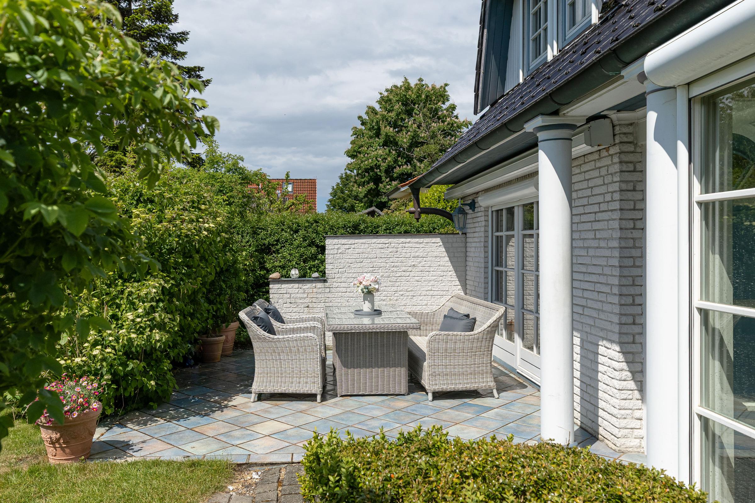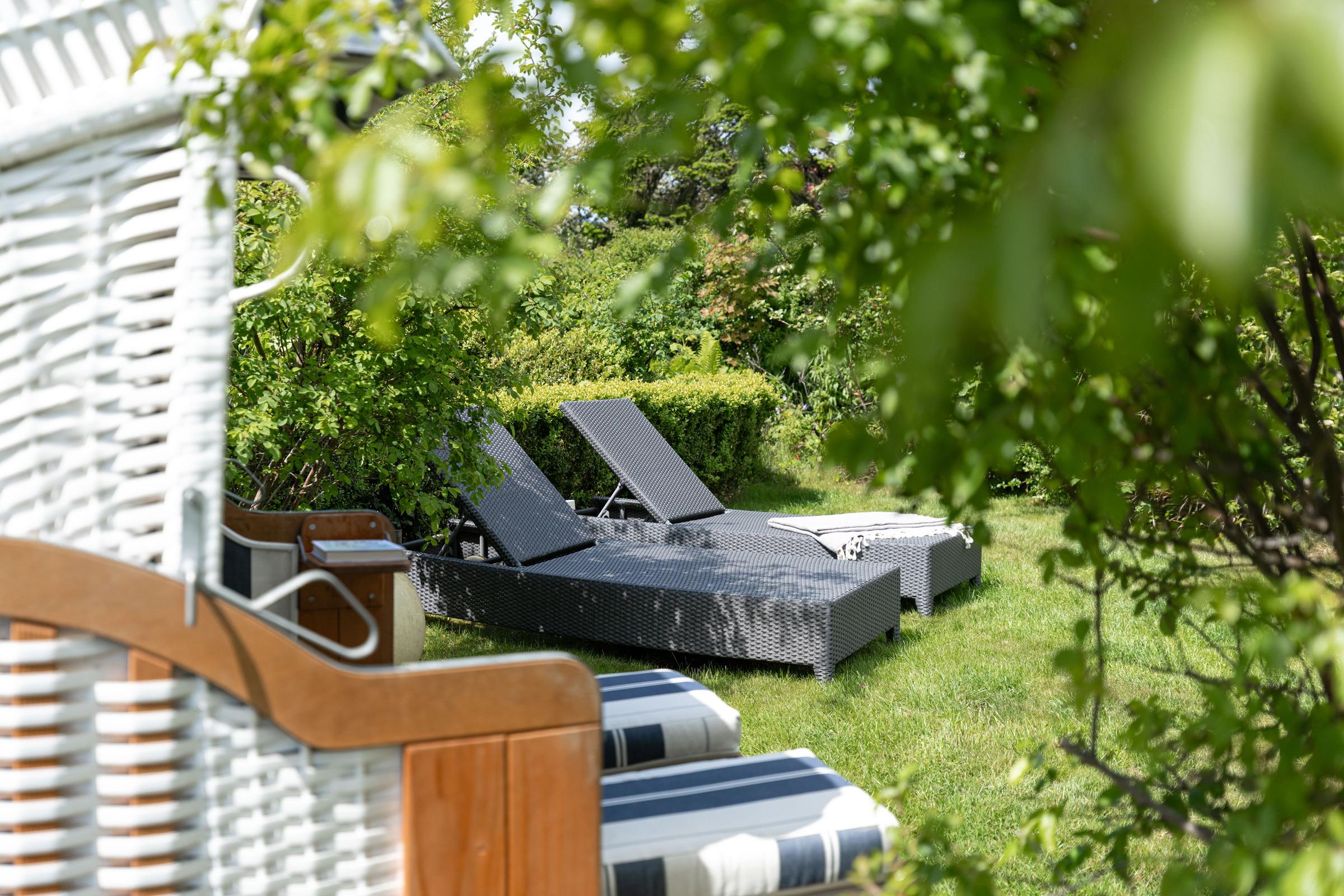 Zwei herrliche Sonnenterrassen mit hochwertigen Gartenmöbeln und der aufwendig gestaltete Garten laden zum verweilen ein. Oder Sie machen es sich im Garten im Strandkorb gemütlich.