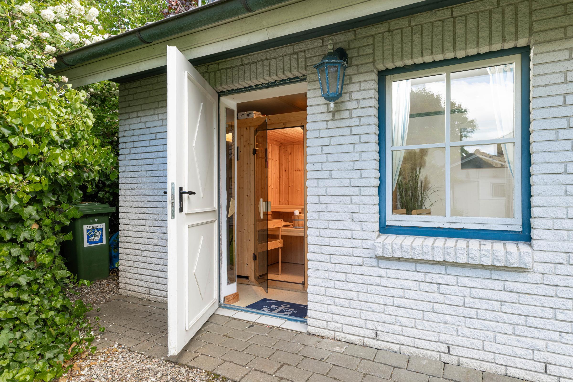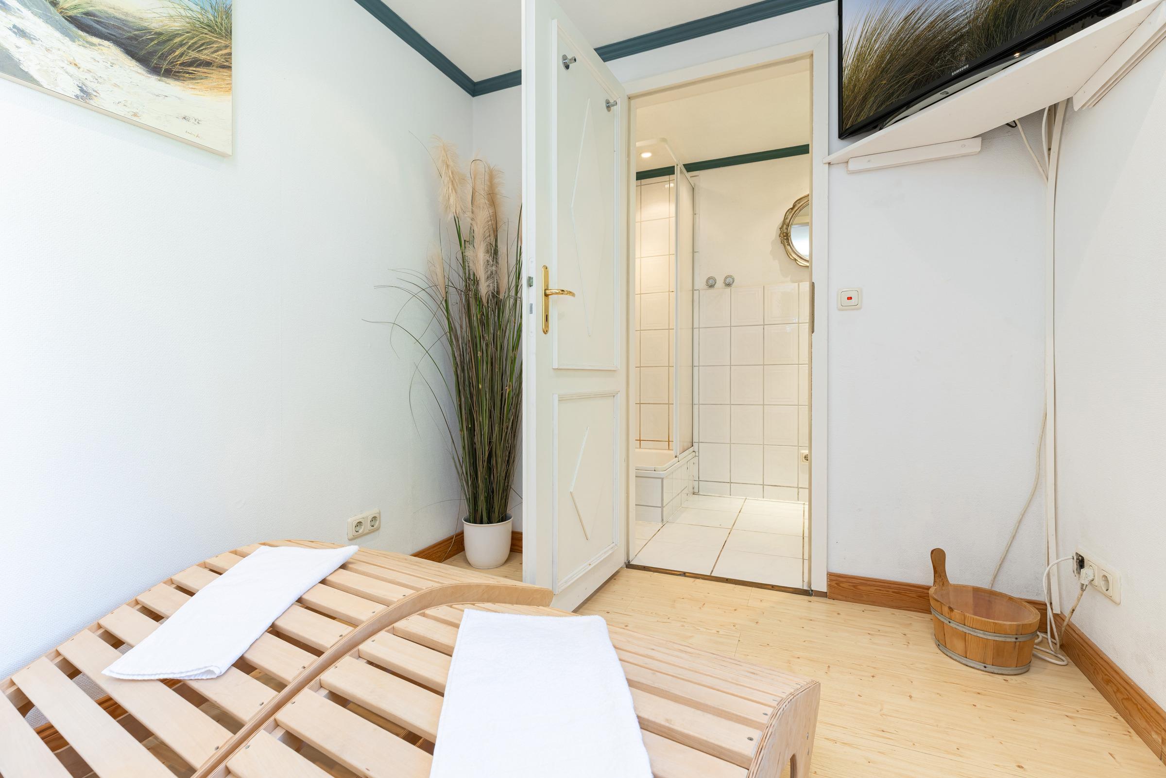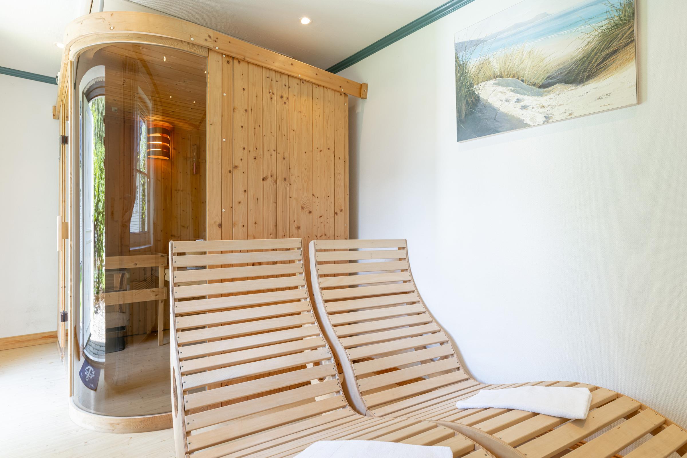 Herrlich relaxen können Sie mit bis zu 4 Personen im Saunahaus (Sauna mit Dampfbad) mit Ruhebereich, TV und Duschbad (mit Fußbodenheizung).