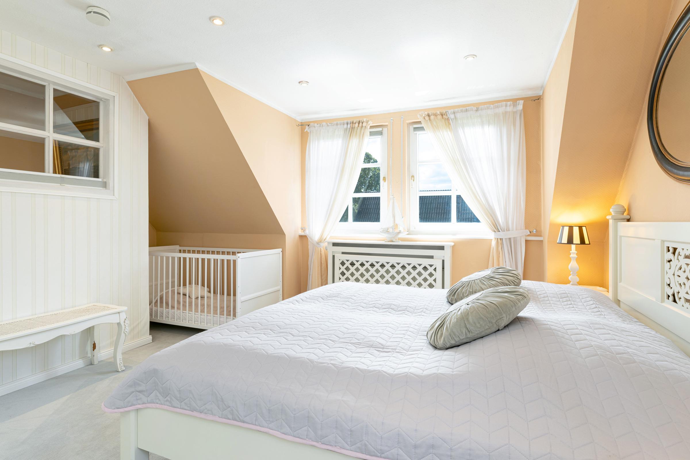 Schlafzimmer 2: 1 Doppelbett (2 x100x200 cm), Kommode, Verdunkelung: Außenrollläden, Kinderbett