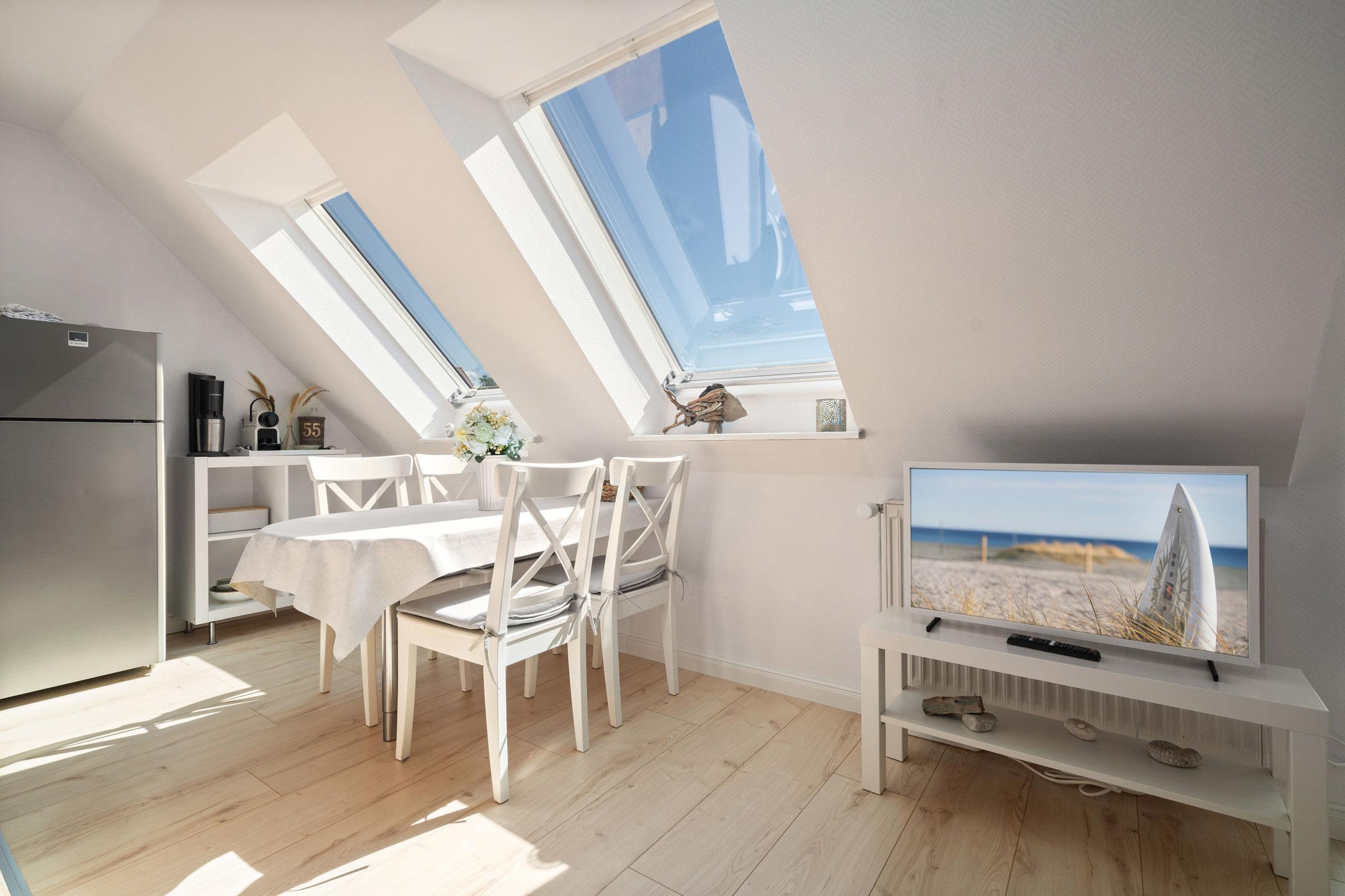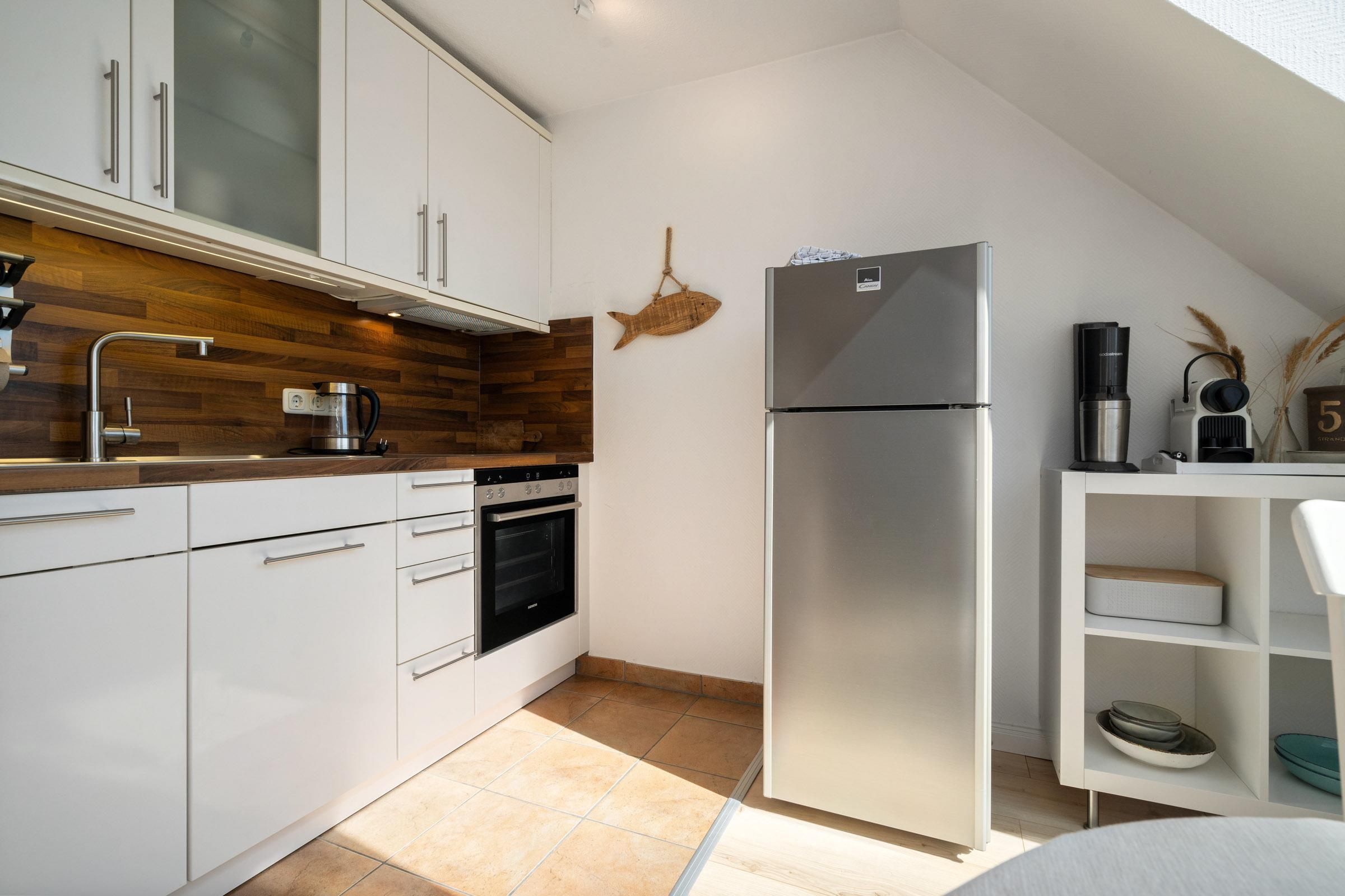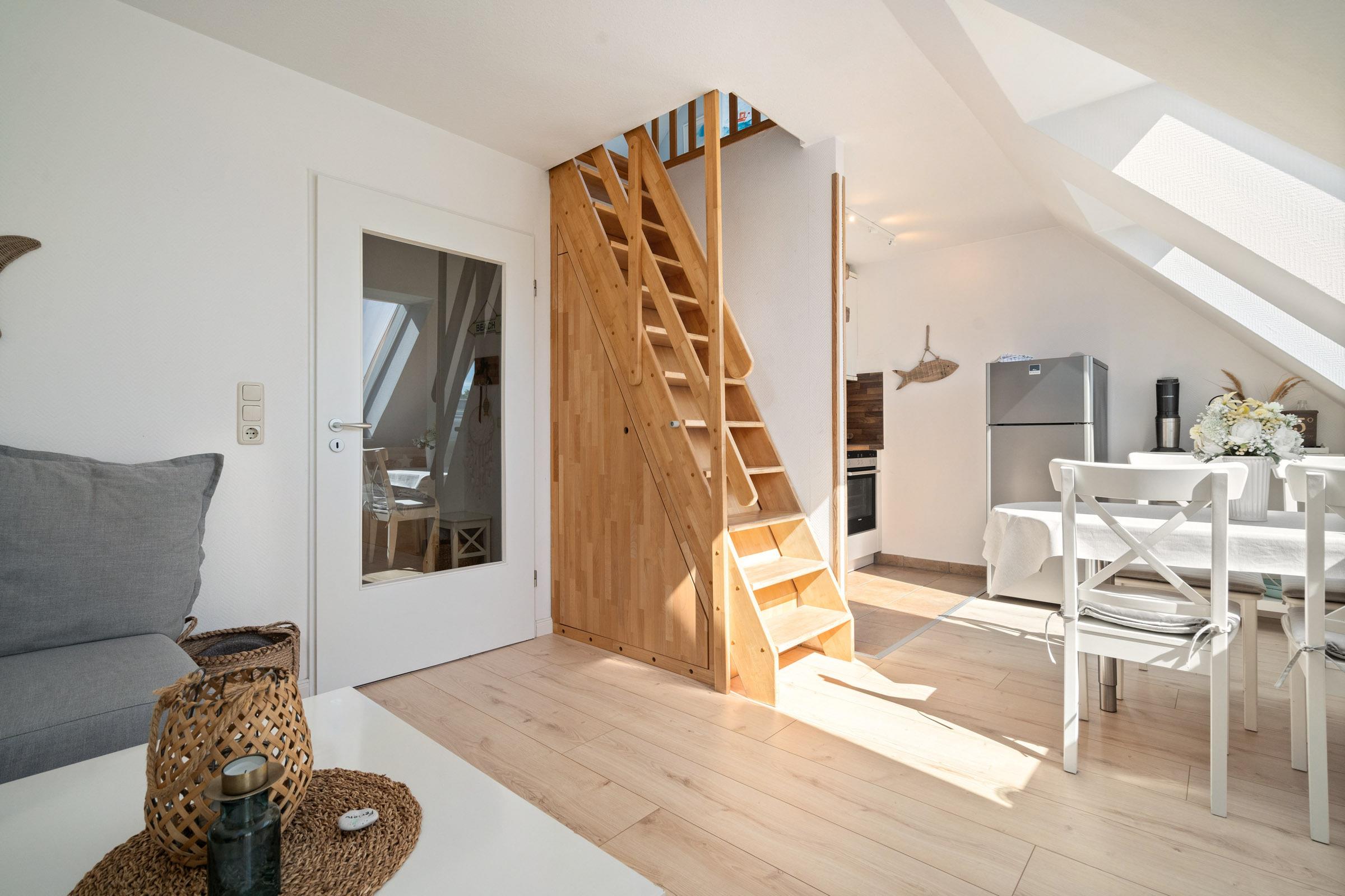Im 2.Obergeschoss befindet sich das Wohnzimmer mit Südbalkon, Küchenzeile mit Essbereich, ein Duschbad und ein Schlafzimmer mit Doppelbett. In der offenen Galerie im Dachgeschoss befindet sich ein weiteres Schlafzimmer, das mit einem Doppelbett (160x200 cm) ausgestattet ist. Die moderne Küche ist mit allen Annehmlichkeiten ausgestattetr ausgestattet und lässt keine Wünsche offen. WLAN ist hier ebnfalls inklusive.