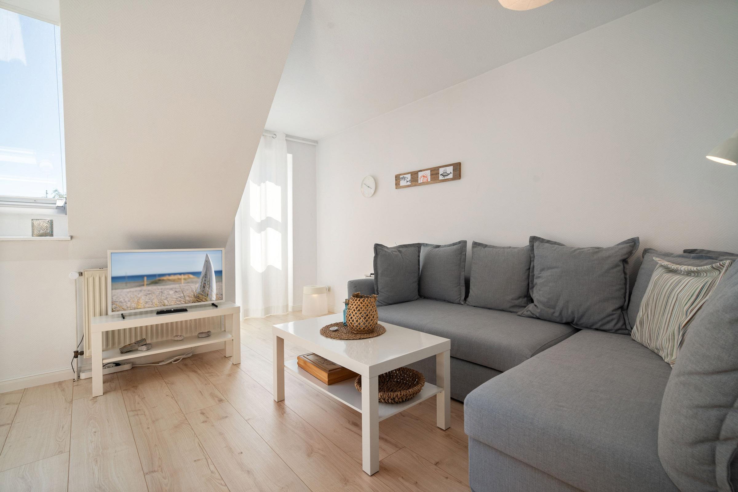 Die helle, moderne 3-Zimmer-Ferienwohnung bietet auf 48 m² bis zu 3 Personen einen erholsamen Urlaub am nur 100 m entfernten Schönberger Ostseestrand.