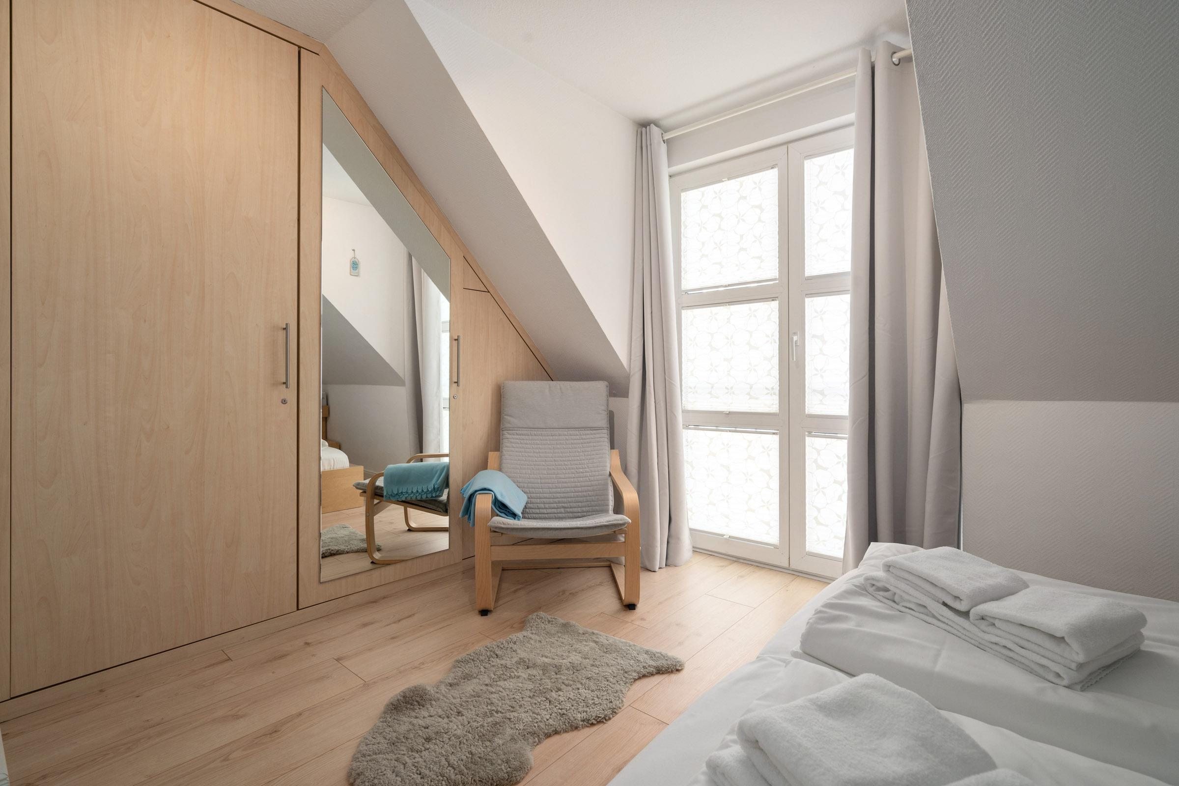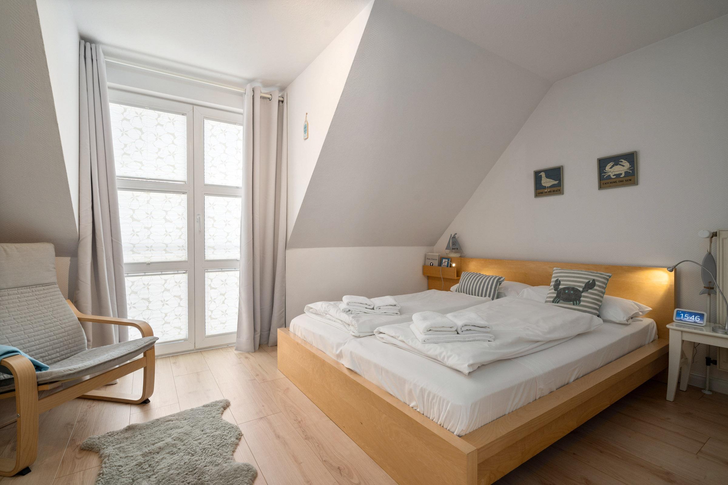 Schlafzimmer 2 (offene Galerie im DG): 1 Doppelbett (160x200 cm), TV, Verdunkelung: Rollos