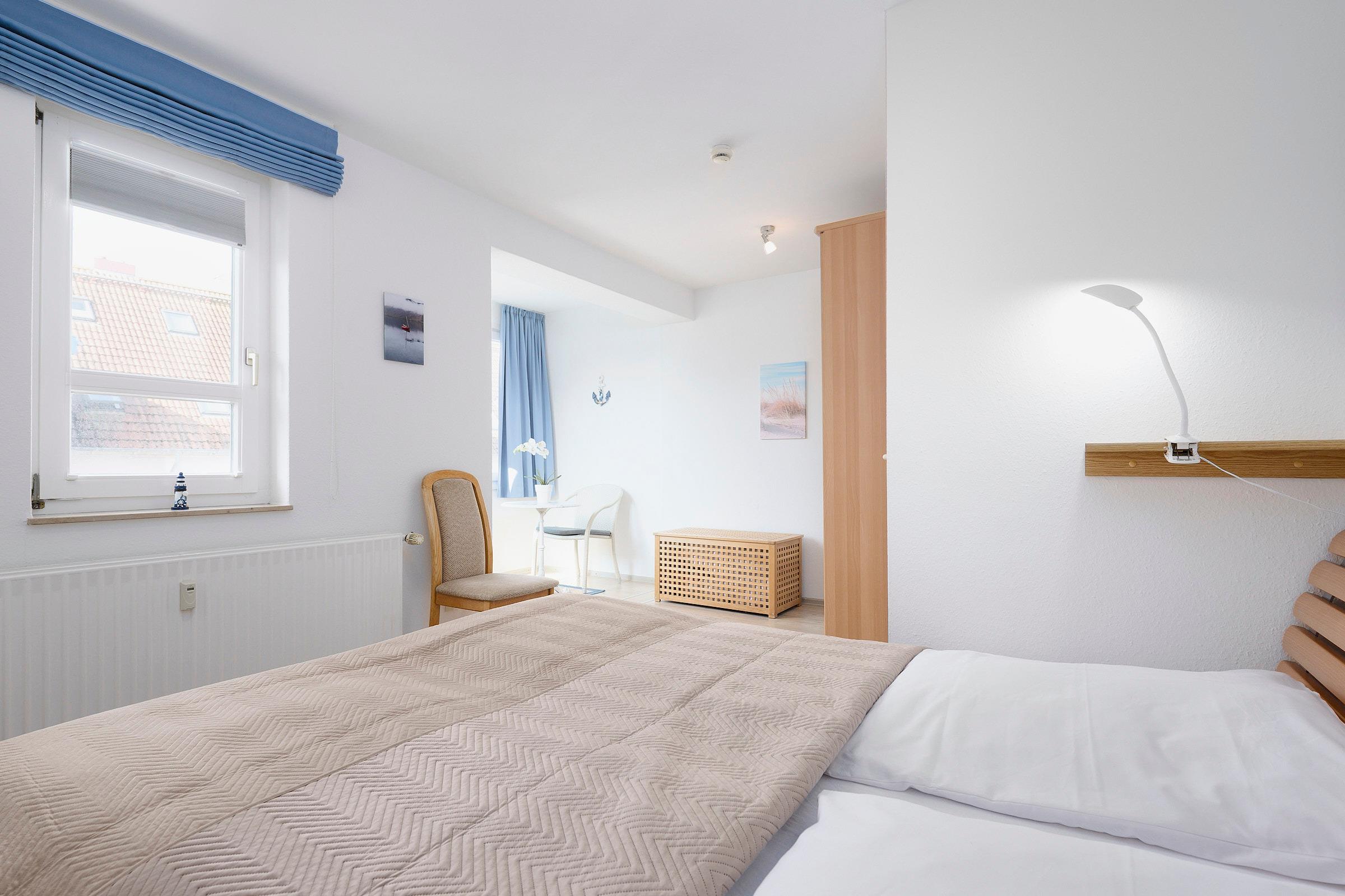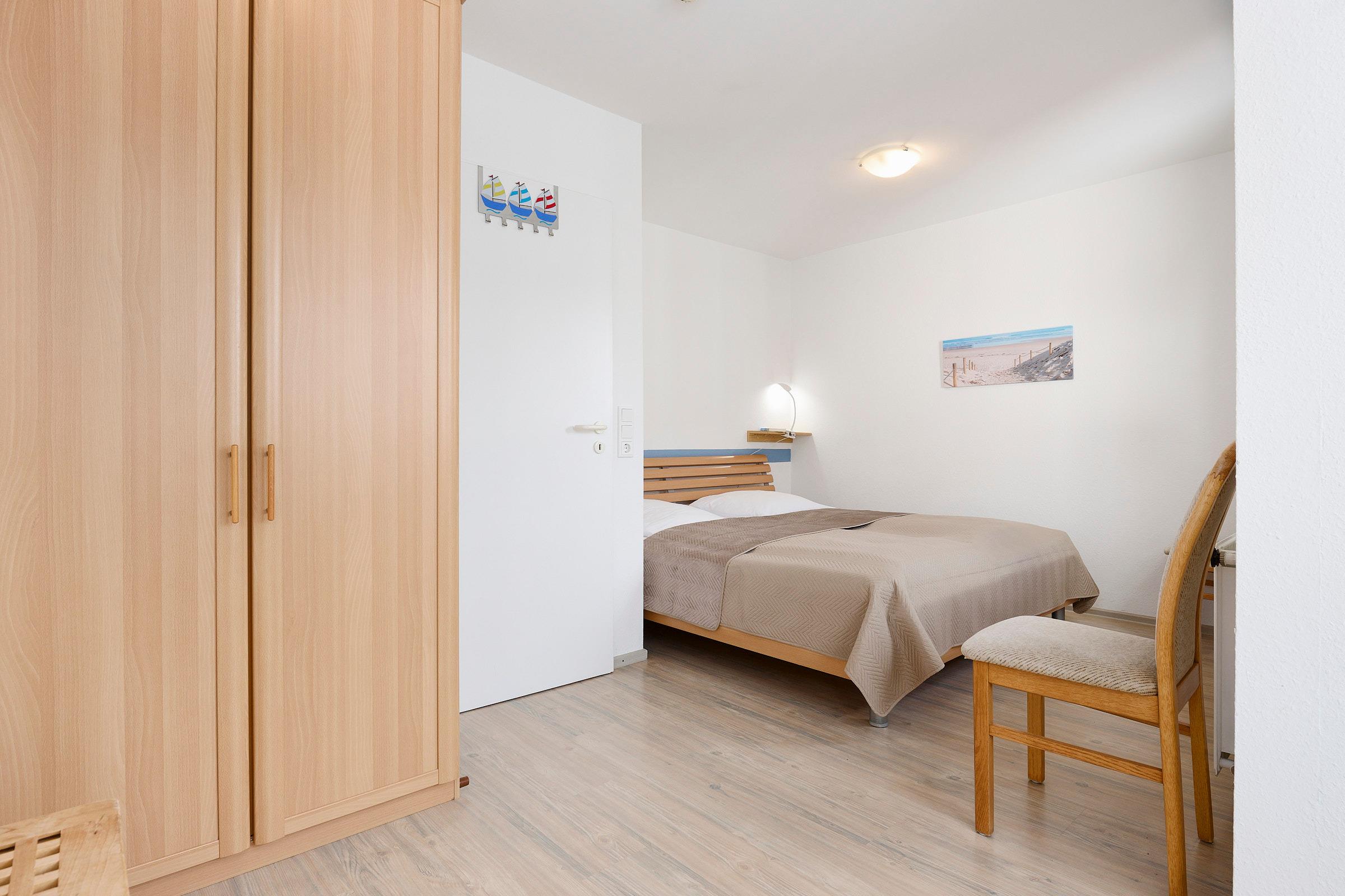 Schlafzimmer: 1 Doppelbett (2x 90x200 cm), Kleiderschrank, TV, Verdunkelung: Raffrollo