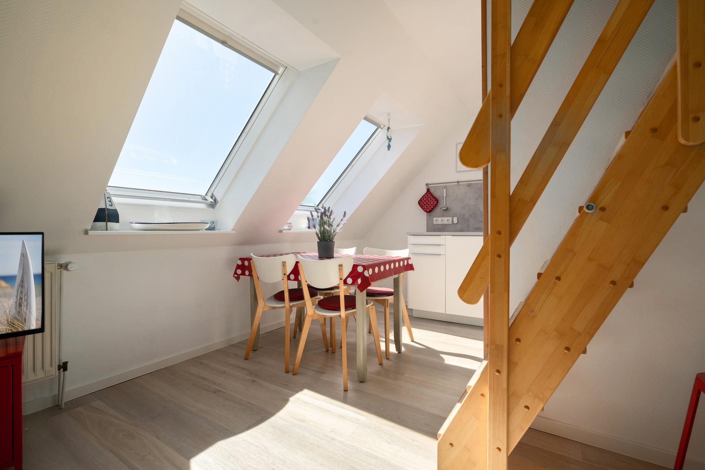 Im 2. Obergeschoss befindet sich das Wohnzimmer mit Südbalkon, Küchenzeile mit Essbereich, ein Duschbad und ein Schlafzimmer mit Doppelbett. In der offenen Galerie im Dachgeschoss befindet sich ein weiteres Schlafzimmer, das mit zwei Einzelbetten ausgestattet ist. Ein kostenloser WLAN–Anschluss verbindet Sie auch im Urlaub mit dem "Rest der Welt".