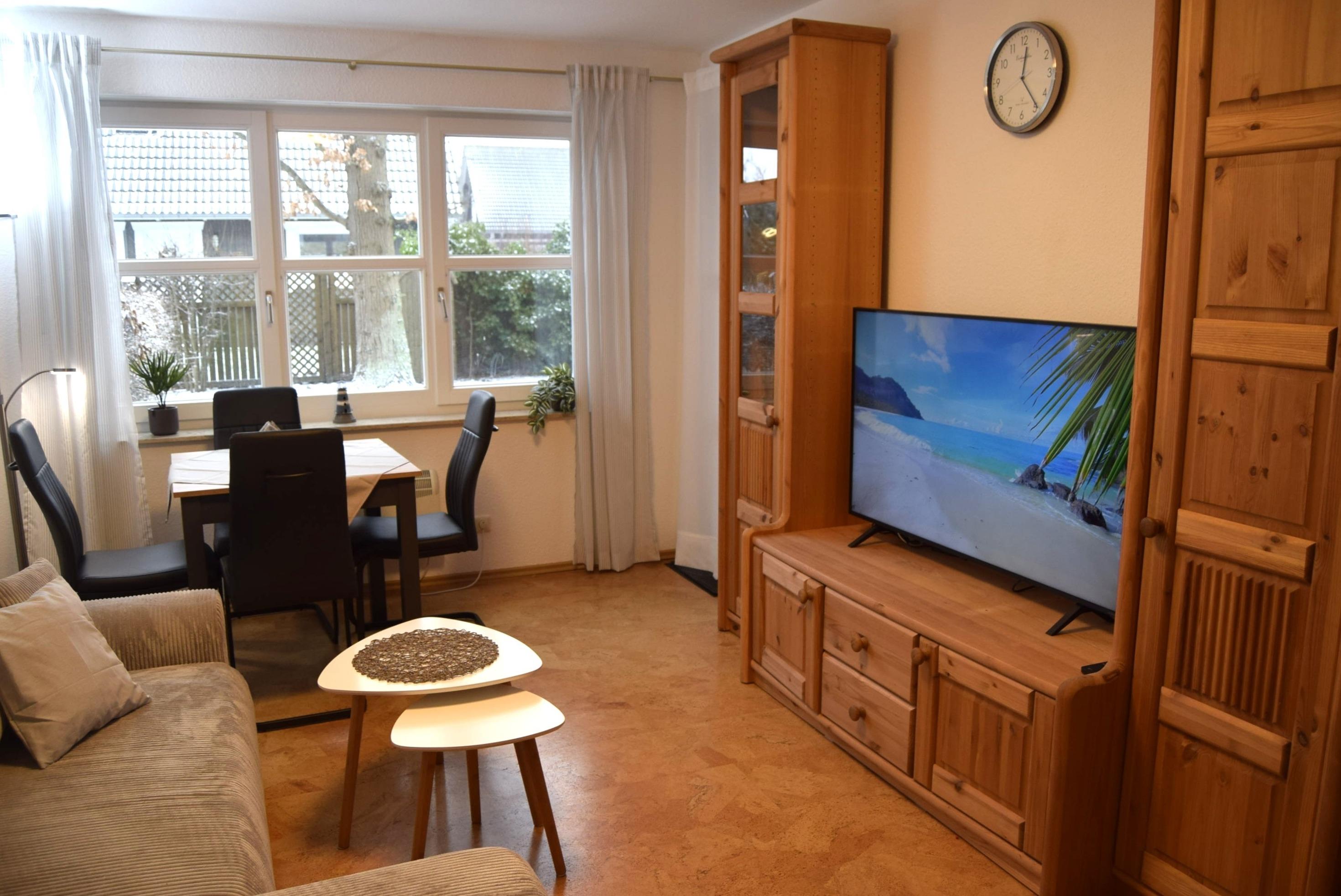 Für entspannte Abende stehen Ihnen eine gemütliche Couchecke, ein großer Esstisch für 4 Personen (erweiterbar) sowie ein 65-Zoll-Flachbild-TV mit Kabelanschluss zur Verfügung. Selbstverständlich nutzen Sie in der gesamten Wohnung kostenfreies Glasfaser-WLAN. Zur Ausstattung gehört außerdem ein Bluetooth-Lautsprecher, der für entspannte Urlaubsstimmung sorgt – ob beim Frühstück auf der Terrasse oder bei gemütlichen Abenden.