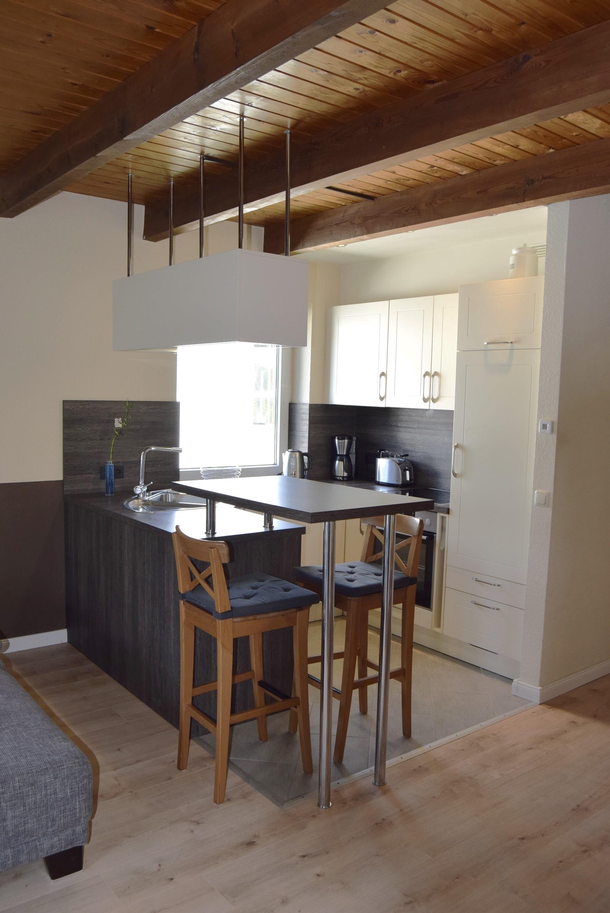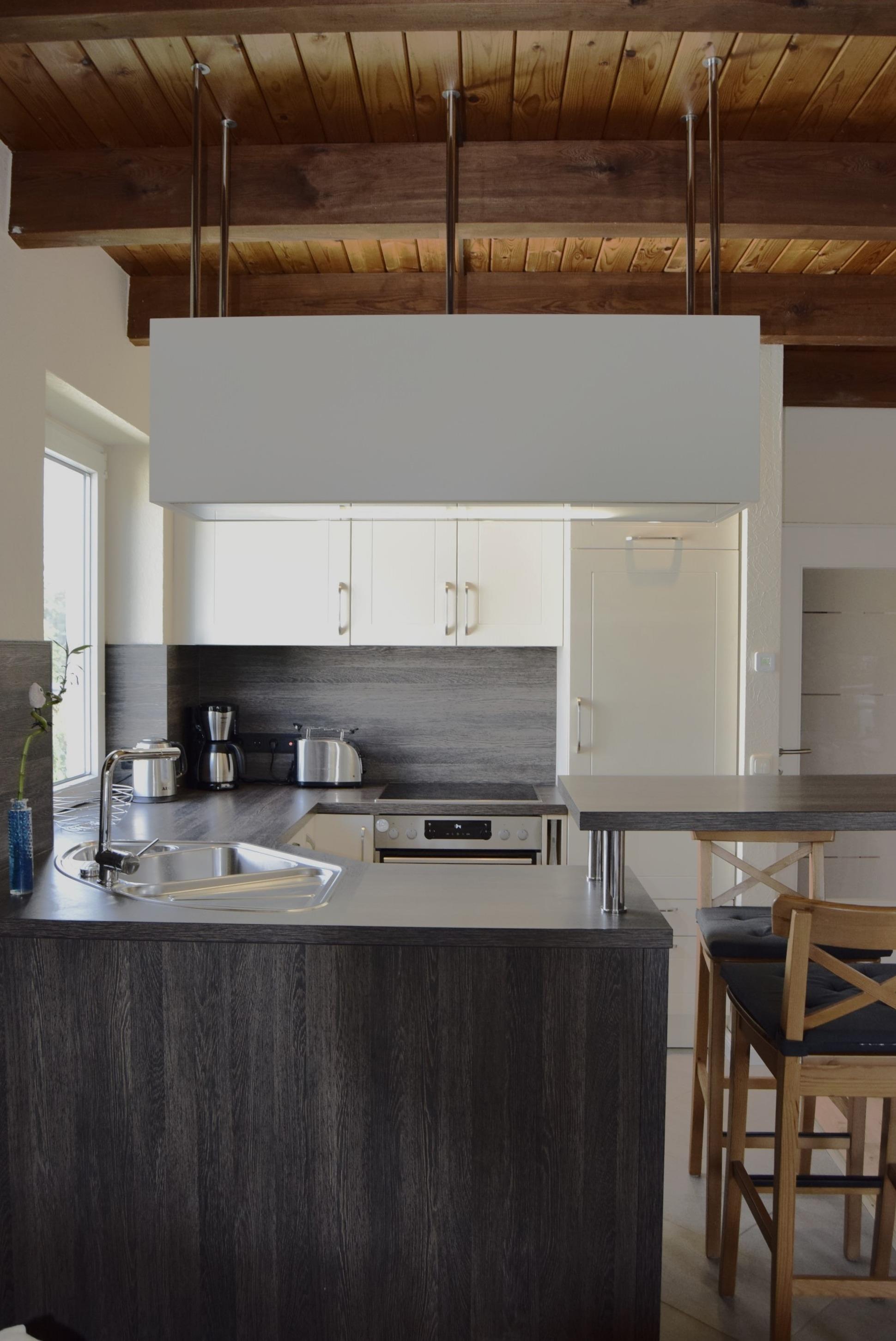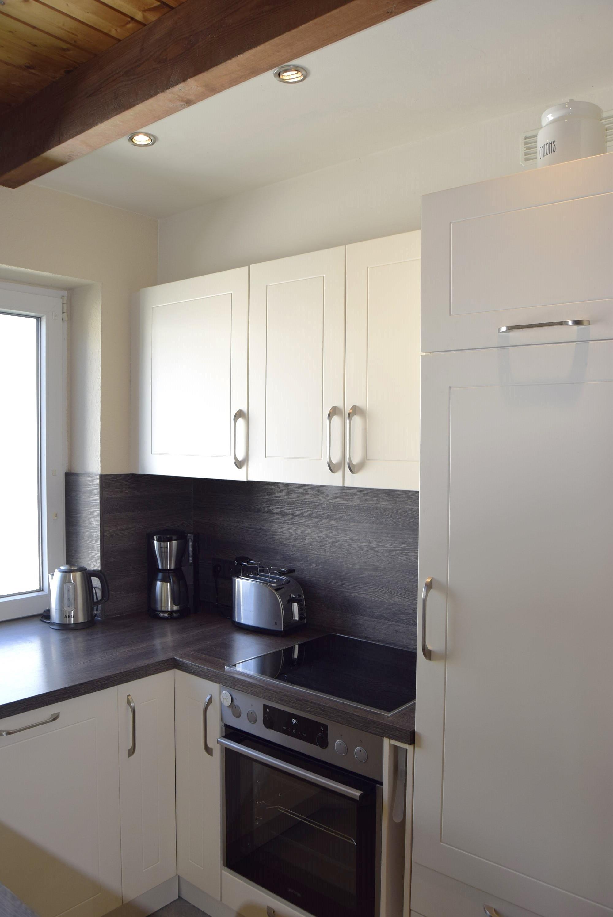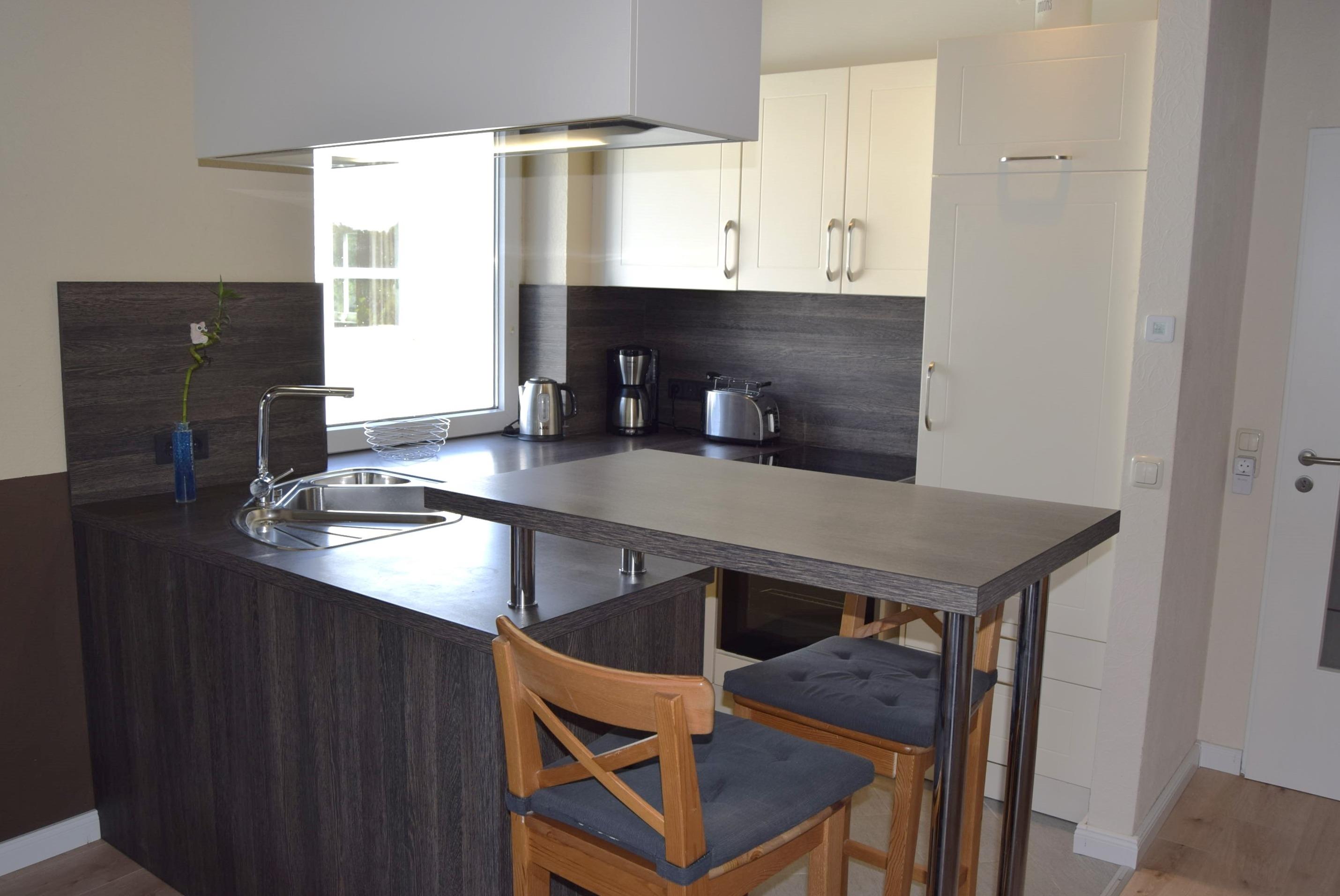 Die gut ausgestattete Küche besitzt unter anderem einen Kühlschrank, einen Herd zum Kochen und sogar eine Spülmaschine.