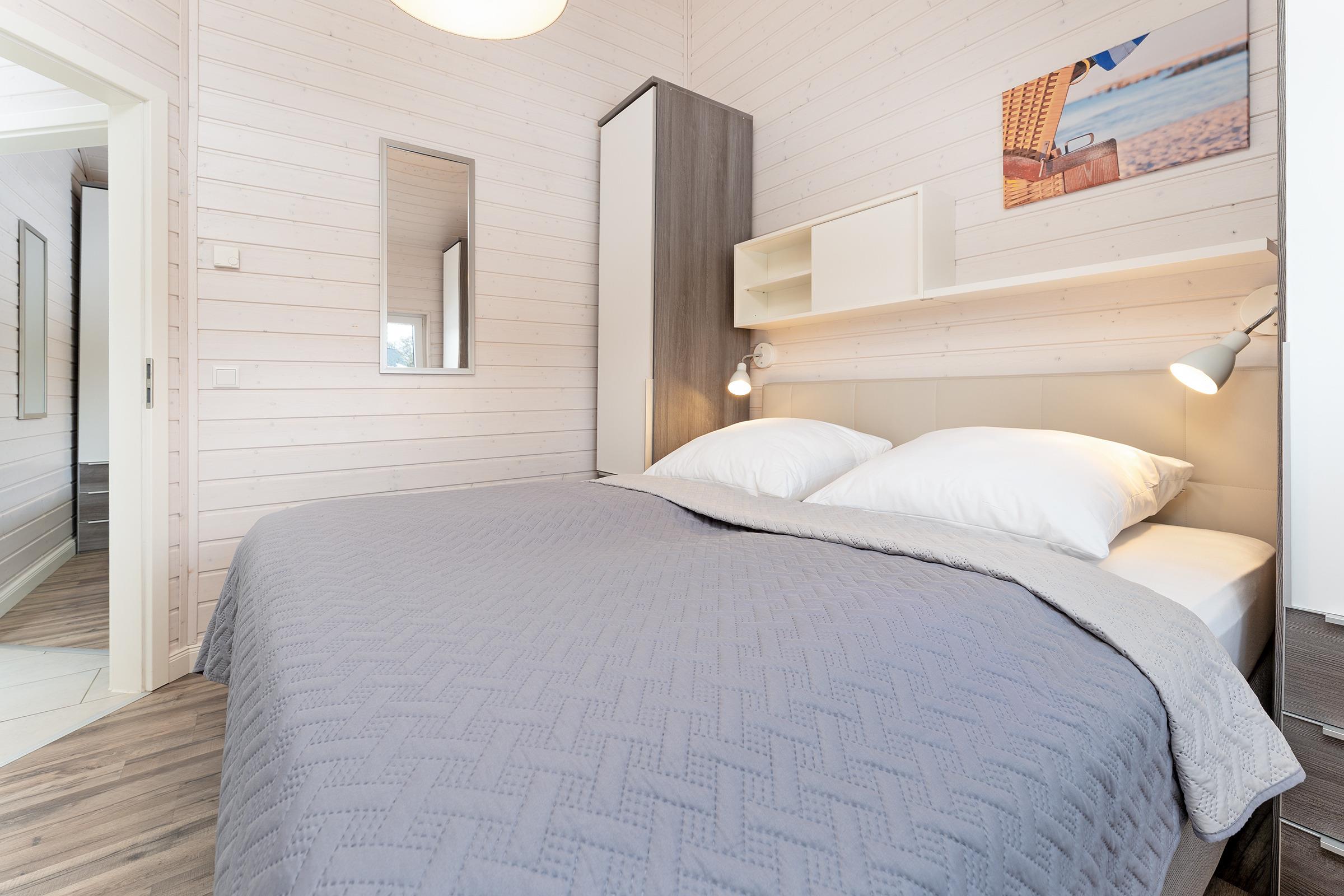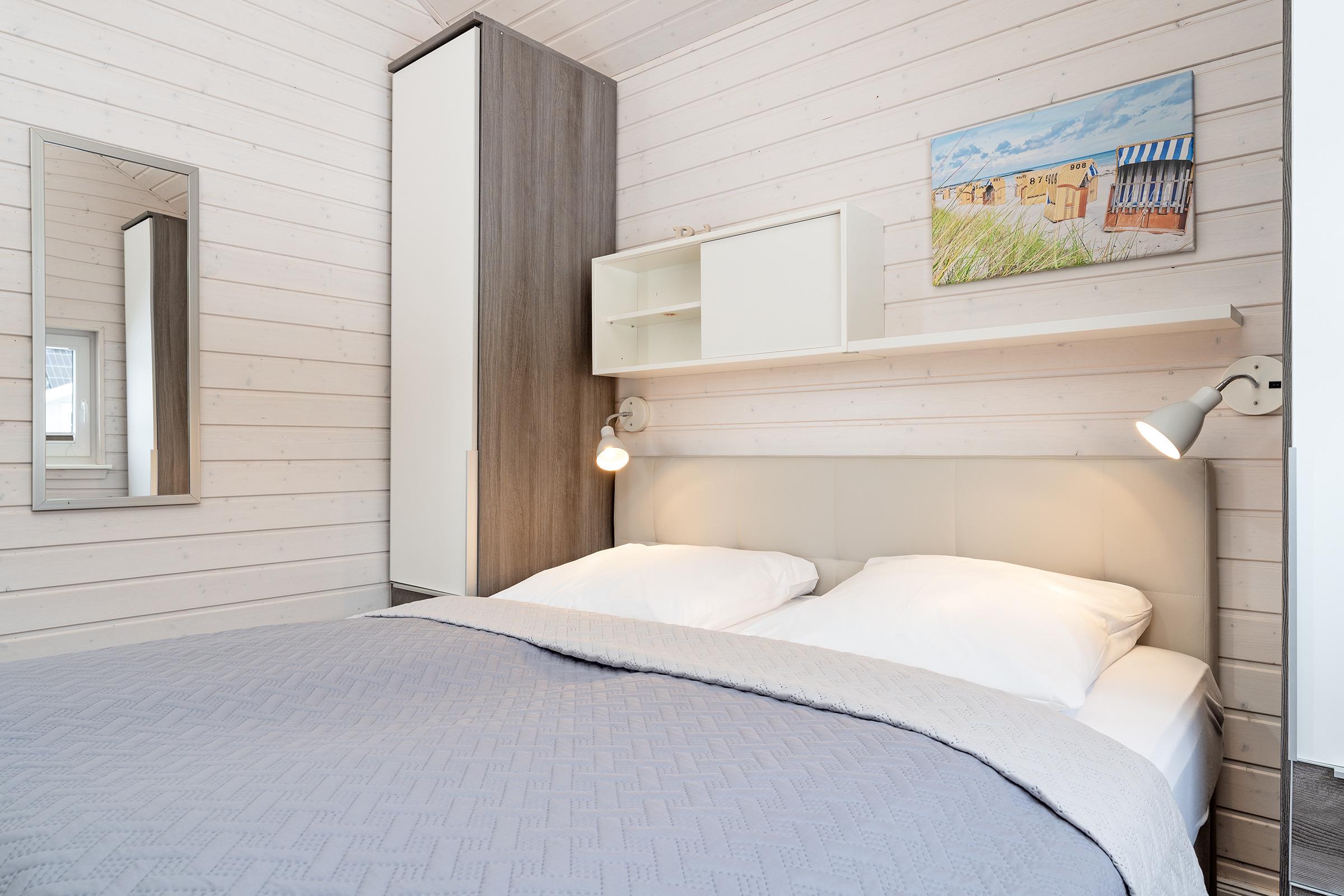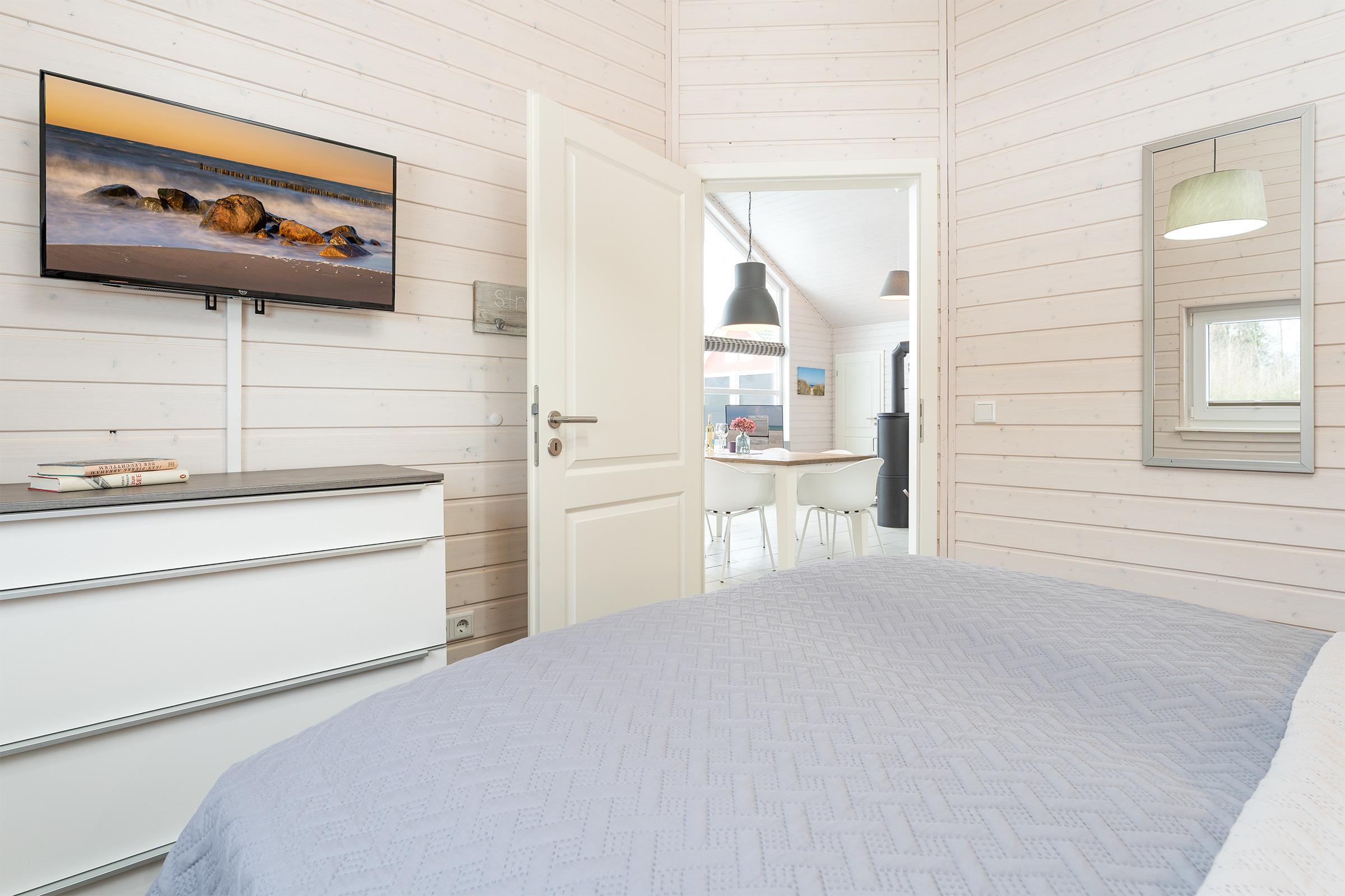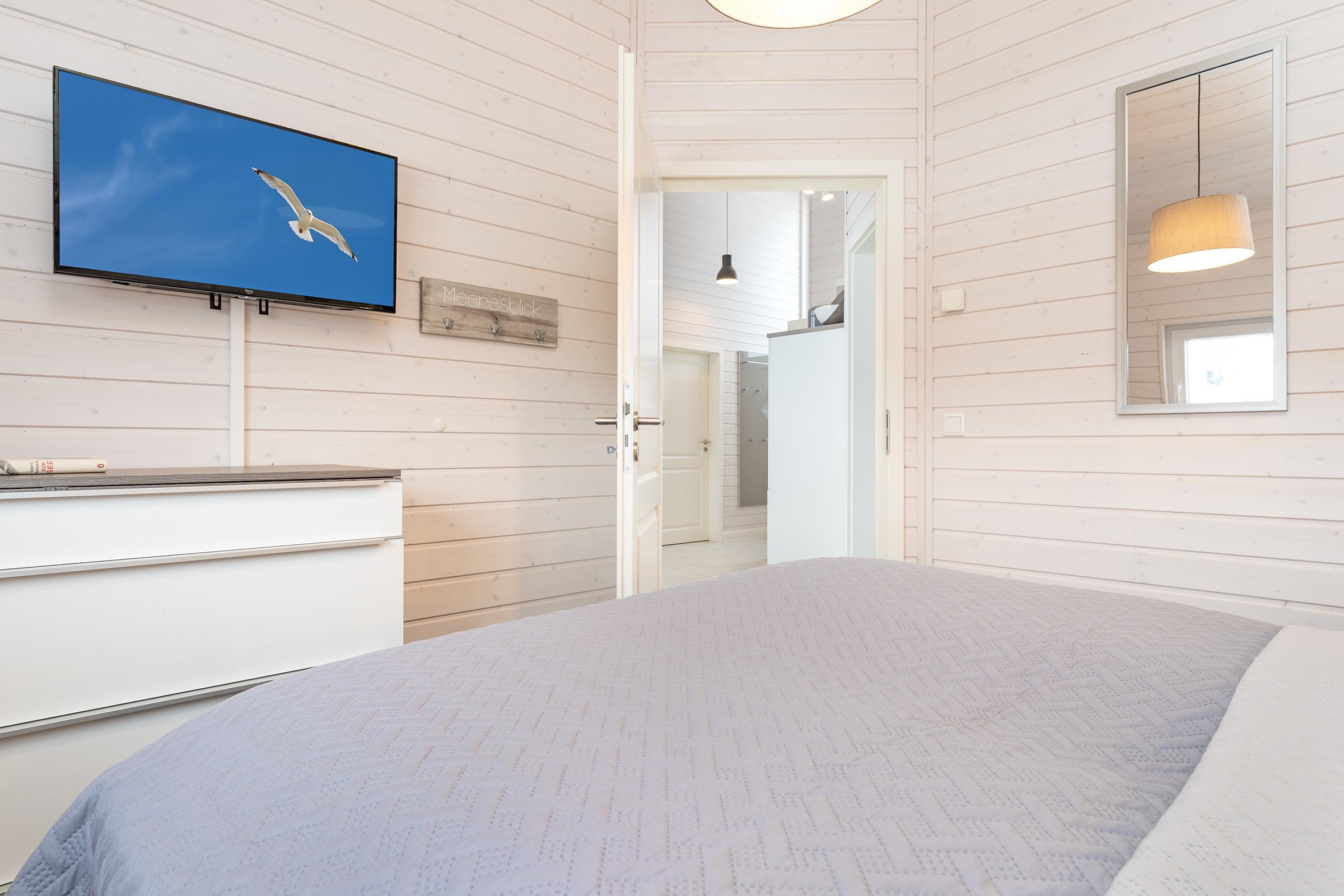Schlafzimmer 2: 1 Boxspringdoppelbett (180x200 cm), Kleiderschrank, TV, Verdunkelung: Plissee, Platz für ein Babybett vorhanden