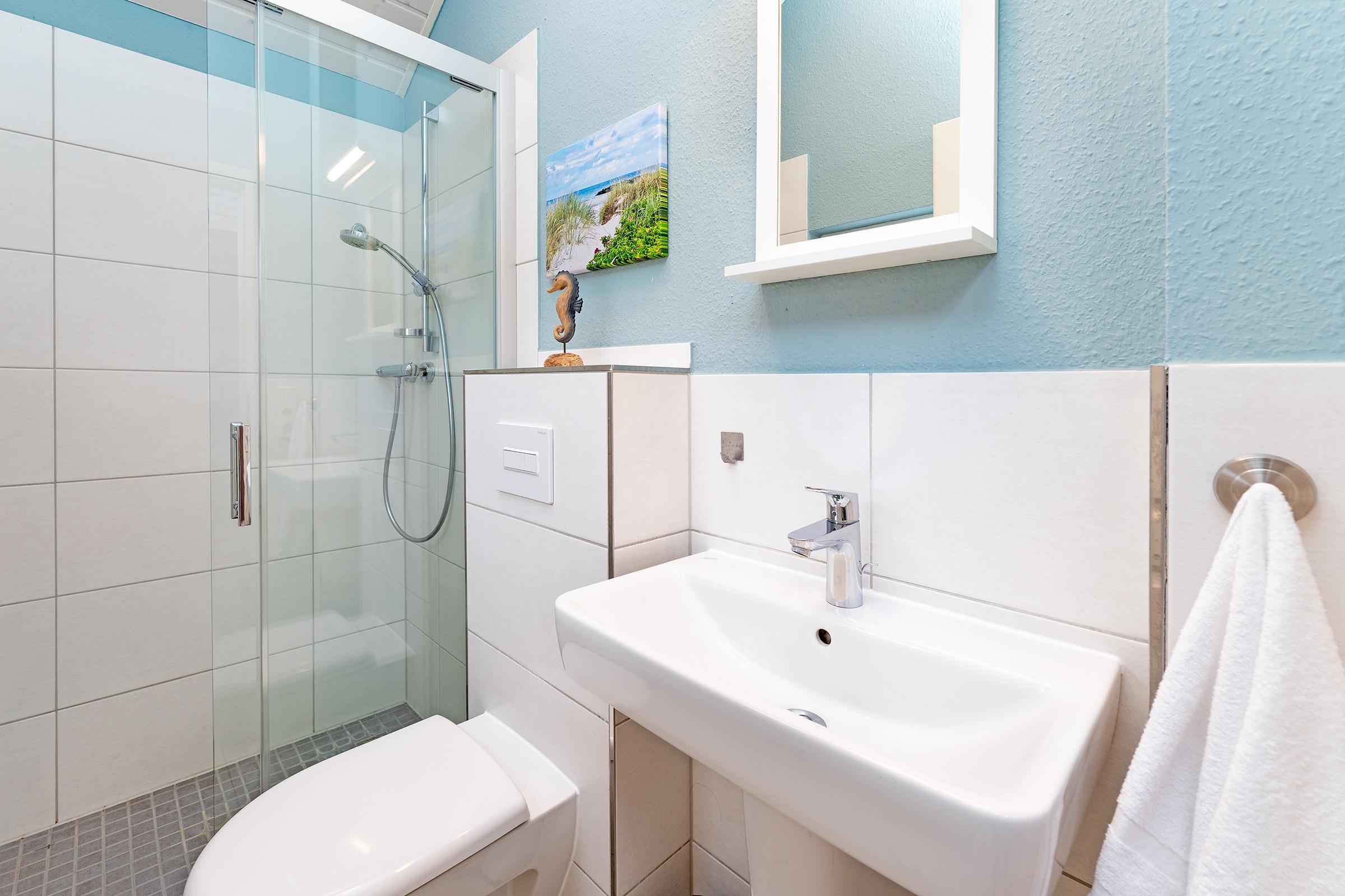 Die beiden Badezimmer runden den Rundgang ab und sind mit Dusche, WC, Haartrockner sowie einem beheizbaren Handtuchhalter ausgestattet. Ein Babybett und ein Kinderhochstuhl stehen zur Verfügung.