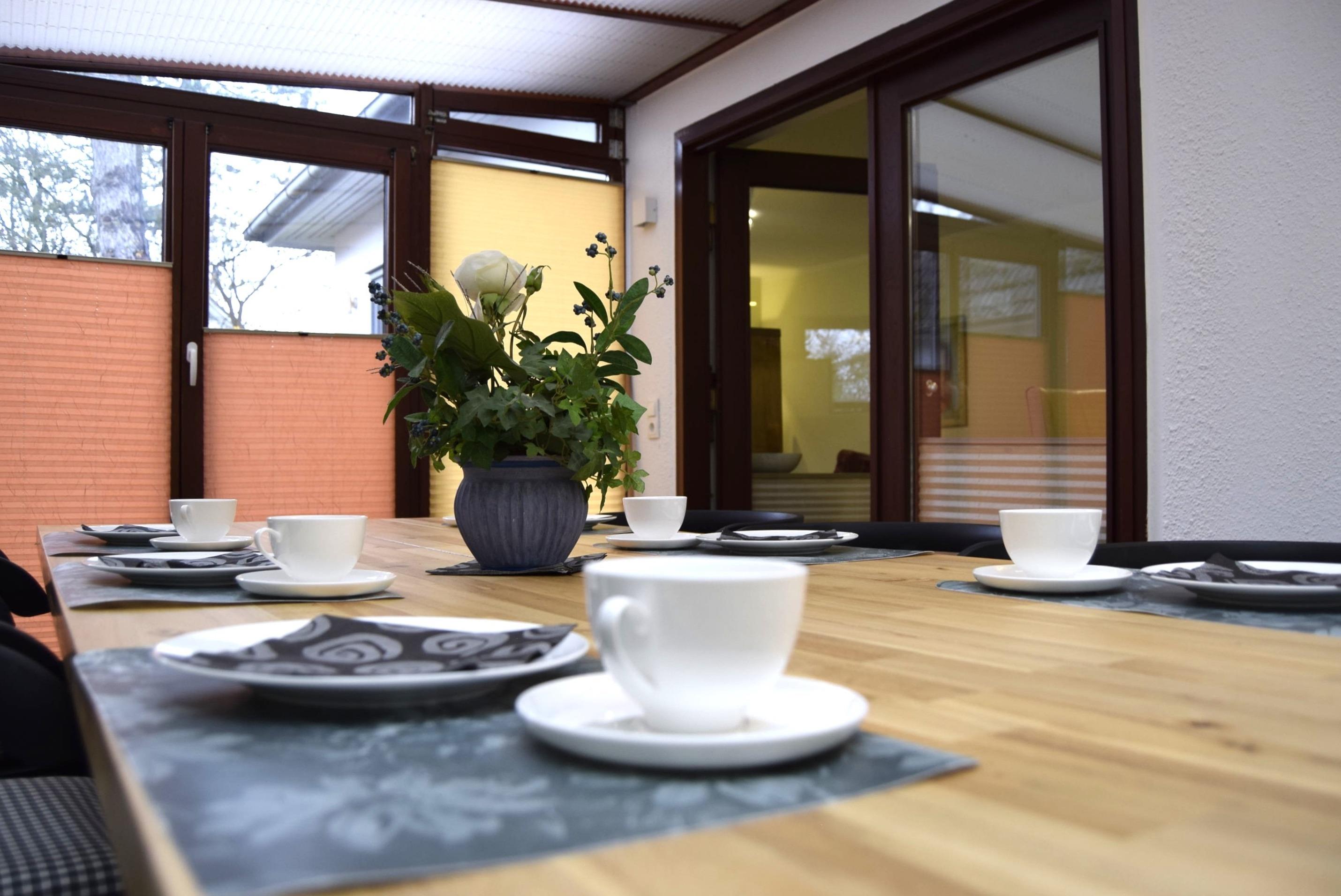 Es verfügt über 2 Bäder (einmal mit Wanne, einmal mit Dusche, jedes mit Fön) mit 2 WCs; Komforteinbauküche; 3 Schlafräume: einer mit einem Doppelbett und Farb-TV, DVD-Player und Leseecke; einer mit 2 Einzelbetten und ein Kinderzimmer mit Etagenbett; einem Wohnzimmer mit Farb-TV, DVD-Player, Stereoanlage und Kaminofen; ein sonniges Esszimmer; einen Wintergarten und großer Südterrasse. Kleines, gemütliches Ruhe- und Lesezimmer mit Schlafsofa. Eine Blockhaussauna findet sich im Garten und für den Weg zum Haus können Bademäntel gemietet werden.