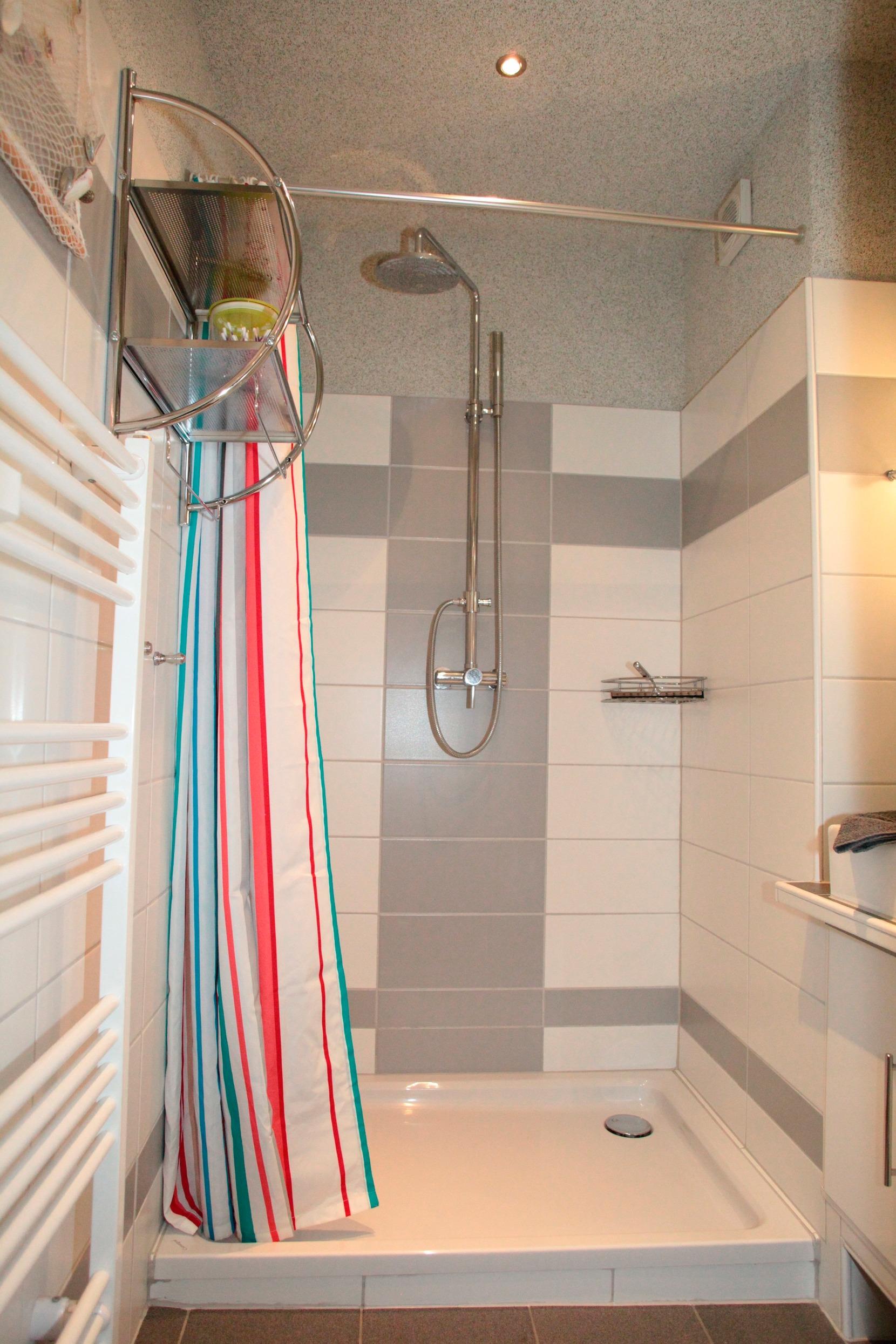 Im Badezimmer gibt es eine Überkopf-Regenschauerdusche mit Handbrause, Waschbecken, WC, eine Handtuchheizung, einen Föhn sowie genügend Ablageflächen.
