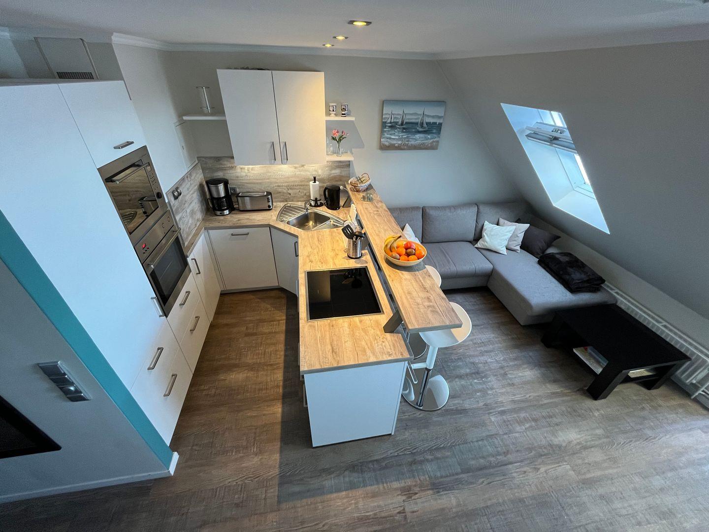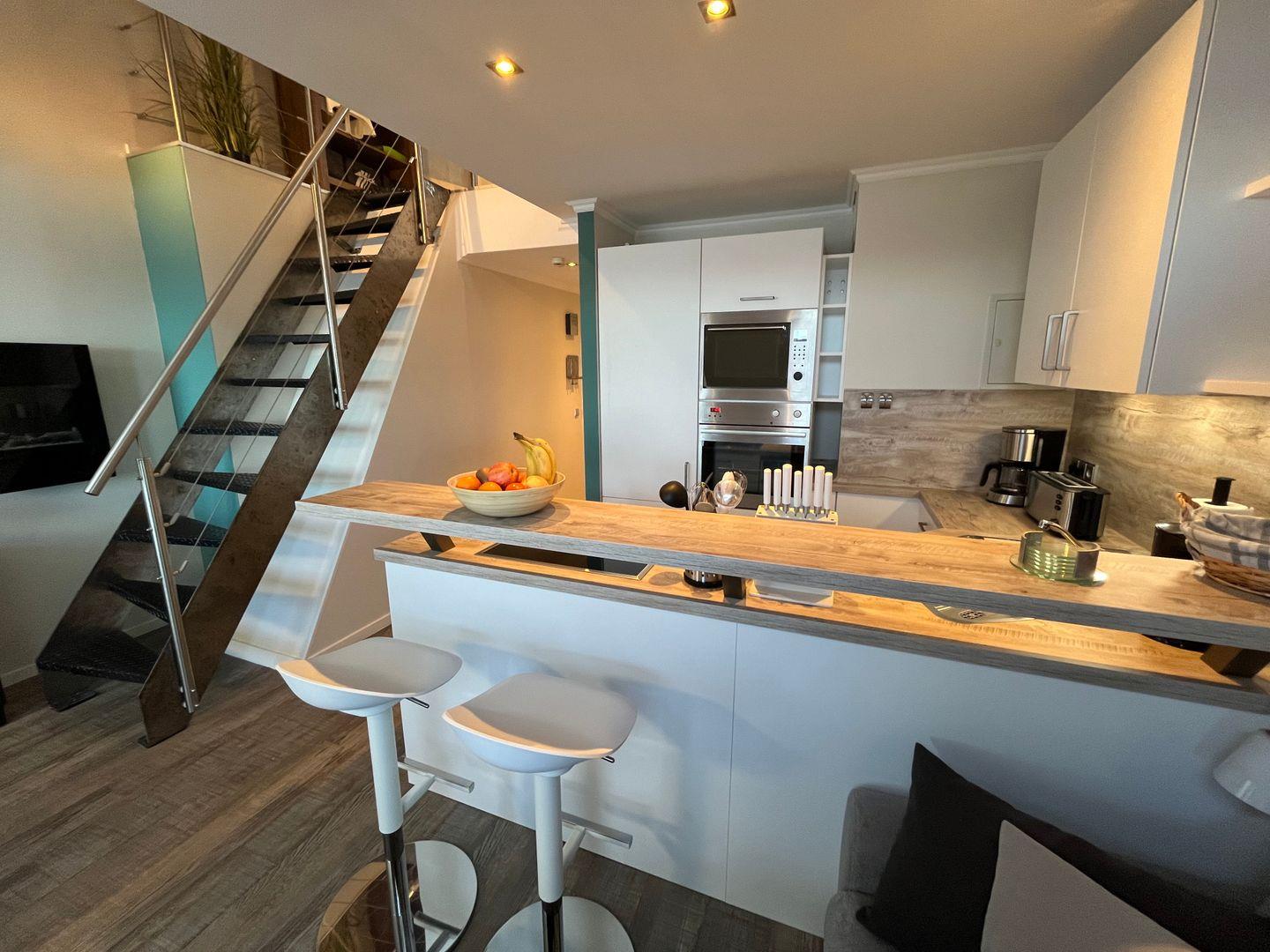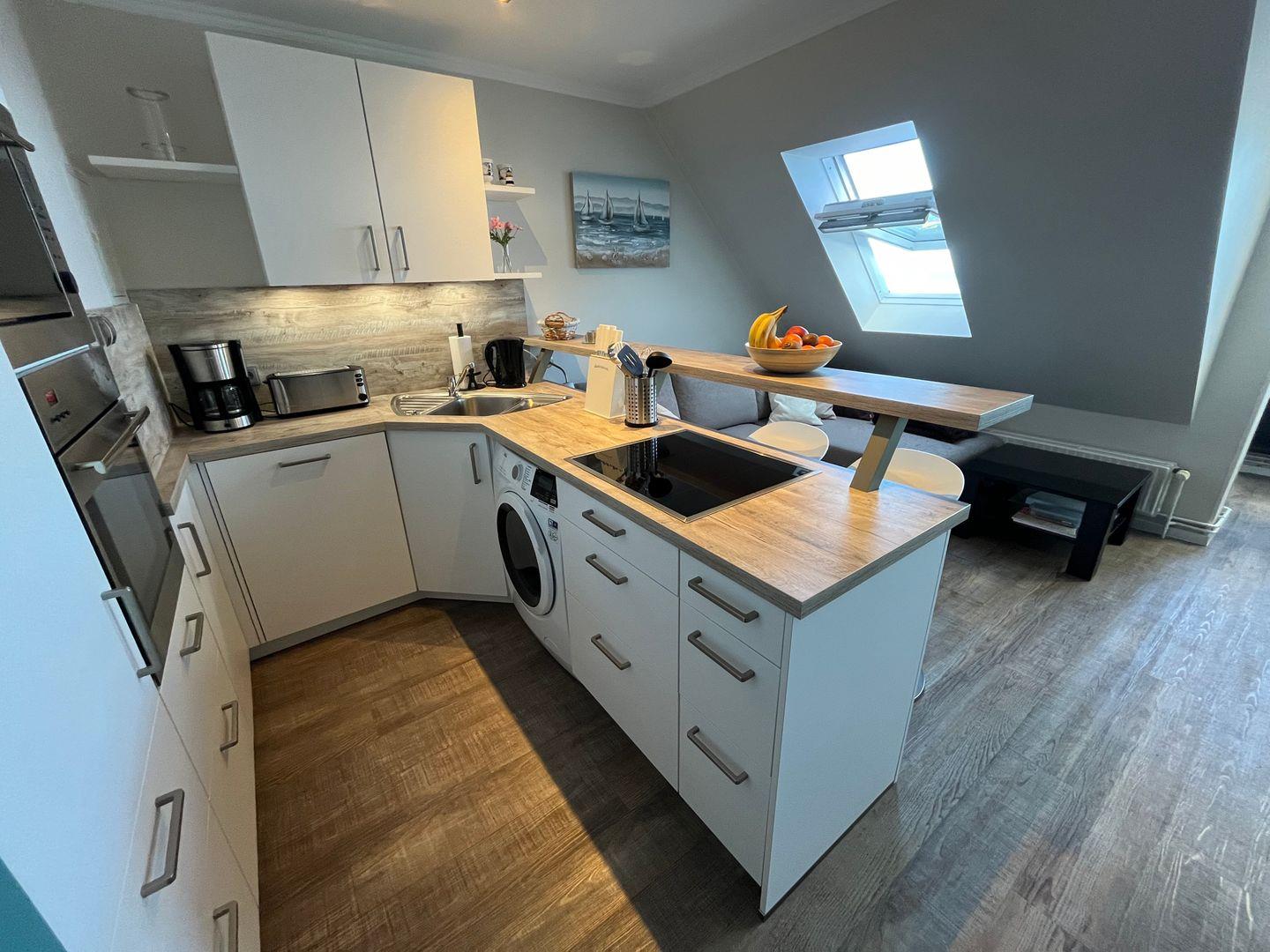 Schon beim Betreten der Ferienwohnung werden Sie von einem atemberaubenden Wintergarten mit Blick auf das glitzernde Meer empfangen. Hier können Sie die frische Meeresbrise genießen und gleichzeitig in einem integrierten Essbereich Ihre Mahlzeiten einnehmen. Die offene Küche (neu Ende 2023) lädt dazu ein, Ihre kulinarischen Fähigkeiten zu entfalten. Sie ist komplett ausgestattet und verfügt über ein Induktions-Kochfeld, eine Mikrowelle, eine Kaffeemaschine, einen Kühlschrank mit Gefrierfach, einen Backofen, einen Wasserkocher und einen Toaster. Alles, was Sie für die Zubereitung köstlicher Speisen benötigen, ist vorhanden. Ein Waschtrockner steht für Sie auch in der Küche zur Verfügung.