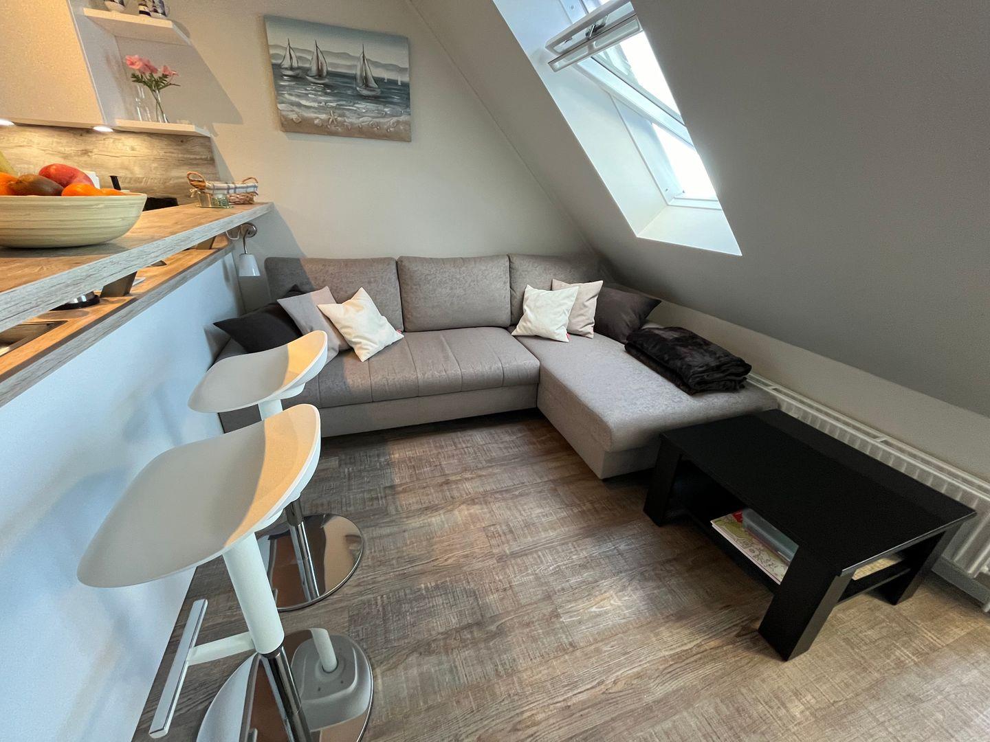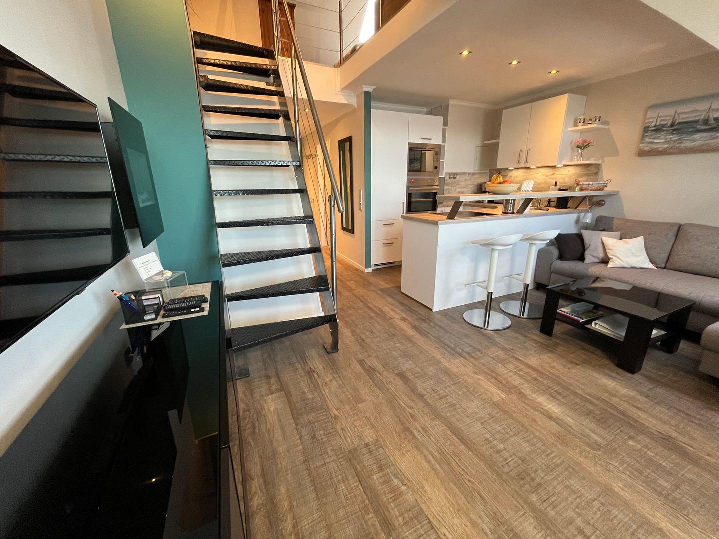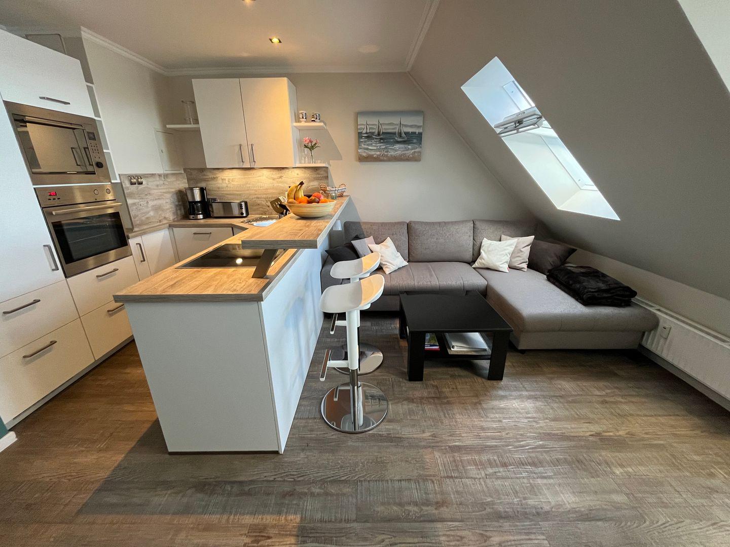 Schon beim Betreten der Ferienwohnung werden Sie von einem atemberaubenden Wintergarten mit Blick auf das glitzernde Meer empfangen. Hier können Sie die frische Meeresbrise genießen und gleichzeitig in einem integrierten Essbereich Ihre Mahlzeiten einnehmen. Die offene Küche (neu Ende 2023) lädt dazu ein, Ihre kulinarischen Fähigkeiten zu entfalten. Sie ist komplett ausgestattet und verfügt über ein Induktions-Kochfeld, eine Mikrowelle, eine Kaffeemaschine, einen Kühlschrank mit Gefrierfach, einen Backofen, einen Wasserkocher und einen Toaster. Alles, was Sie für die Zubereitung köstlicher Speisen benötigen, ist vorhanden. Ein Waschtrockner steht für Sie auch in der Küche zur Verfügung.