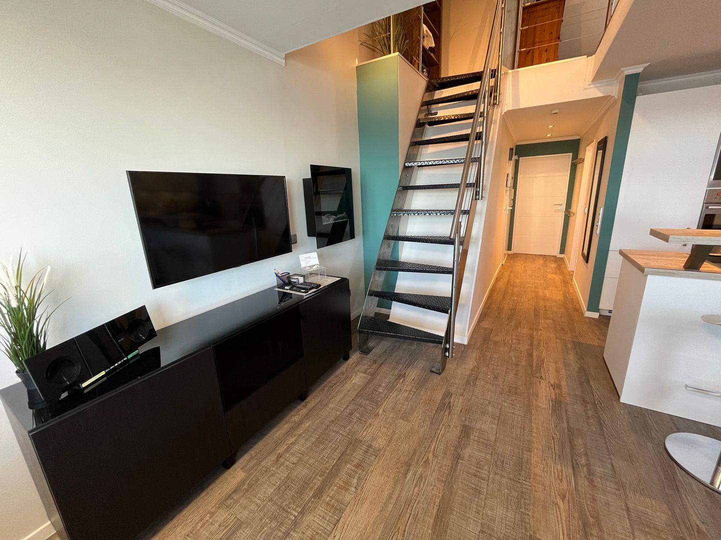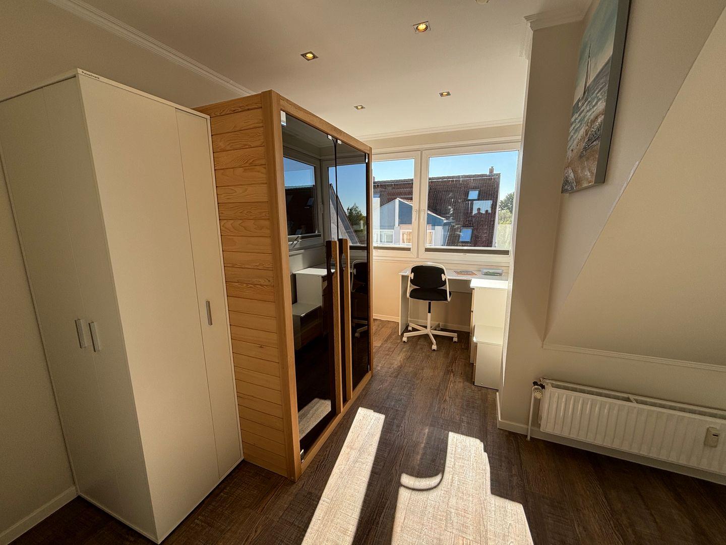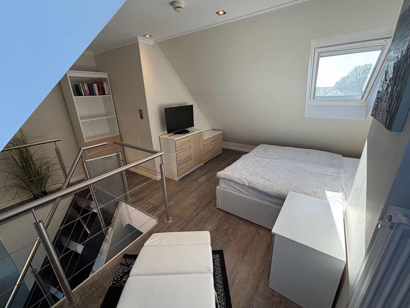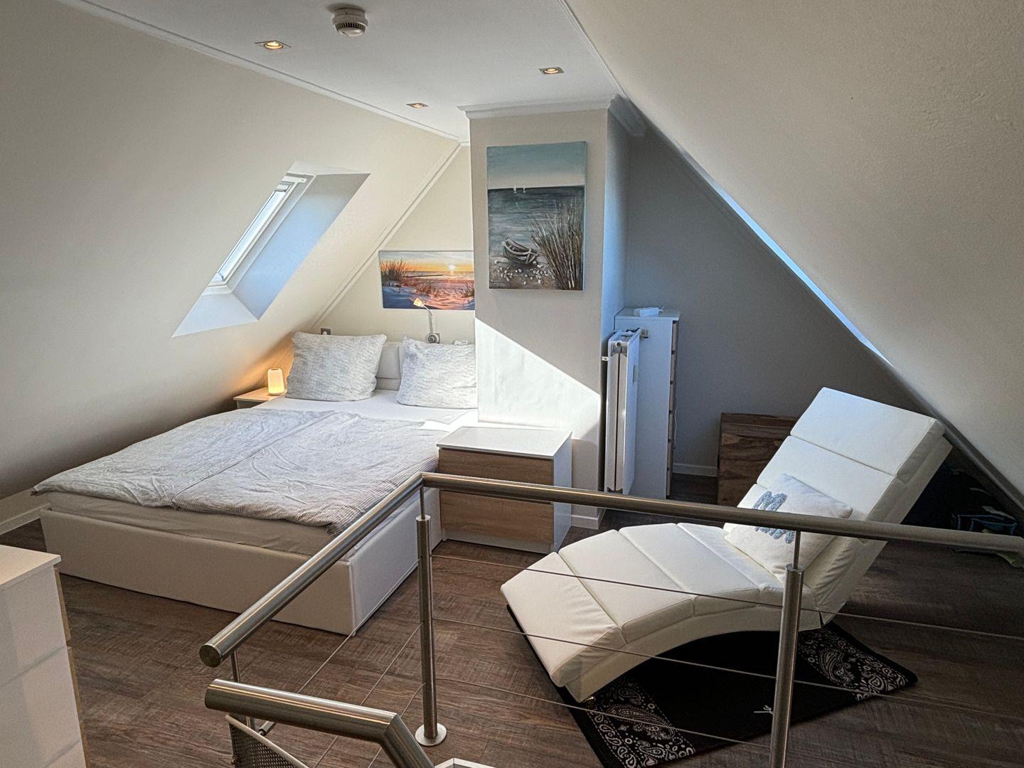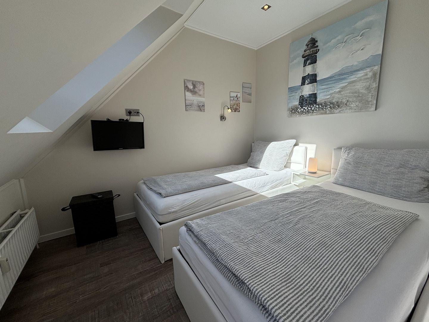Die Ferienwohnung verfügt über zwei einladende Schlafzimmer. Im Dachgeschoss erwartet Sie ein großes Doppelbett mit einer bequemen Matratze (1,60x2,00m), Kommoden, Massageliege und einem eigenen Fernseher. Hier können Sie sich in eine erholsame Nachtruhe fallen lassen und neue Energie für den nächsten Tag tanken. Das zweite Schlafzimmer bietet zwei Einzelbetten, Kommoden, einen eigenen Fernseher und sogar eine Infrarotsauna, in der Sie nach einem Strandspaziergang oder einer Wanderung im nahegelegenen Naturschutzgebiet wunderbar entspannen können.