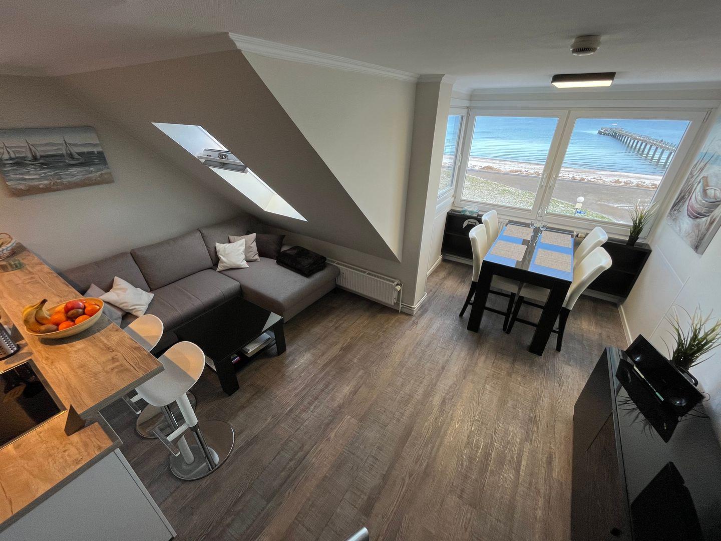 Moderne Ferienwohnung Ostseefee mit WLAN-Internet, Kamin (Elektro) und Infrarotsauna am Schönberger Strand mit direktem Meerblick aus 1. Reihe auf die 40 m entfernte Ostsee und mit Blick auf die Schönberger Seebrücke. Aus Ihrem Logenplatz im 3. Stock können Sie z. B. Schiffen beim Auslaufen aus der Kieler Bucht zusehen oder Surfer und Wellenreiter beobachten. 2 Schlafzimmer, 1 Bad. Für max. 4 Personen.