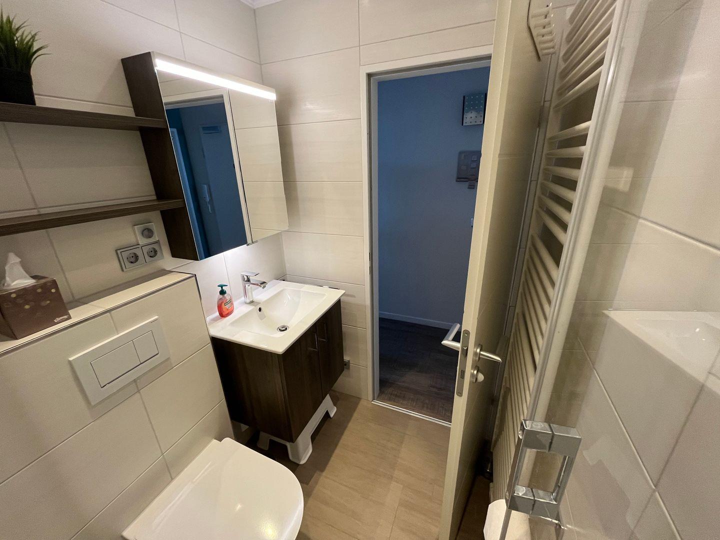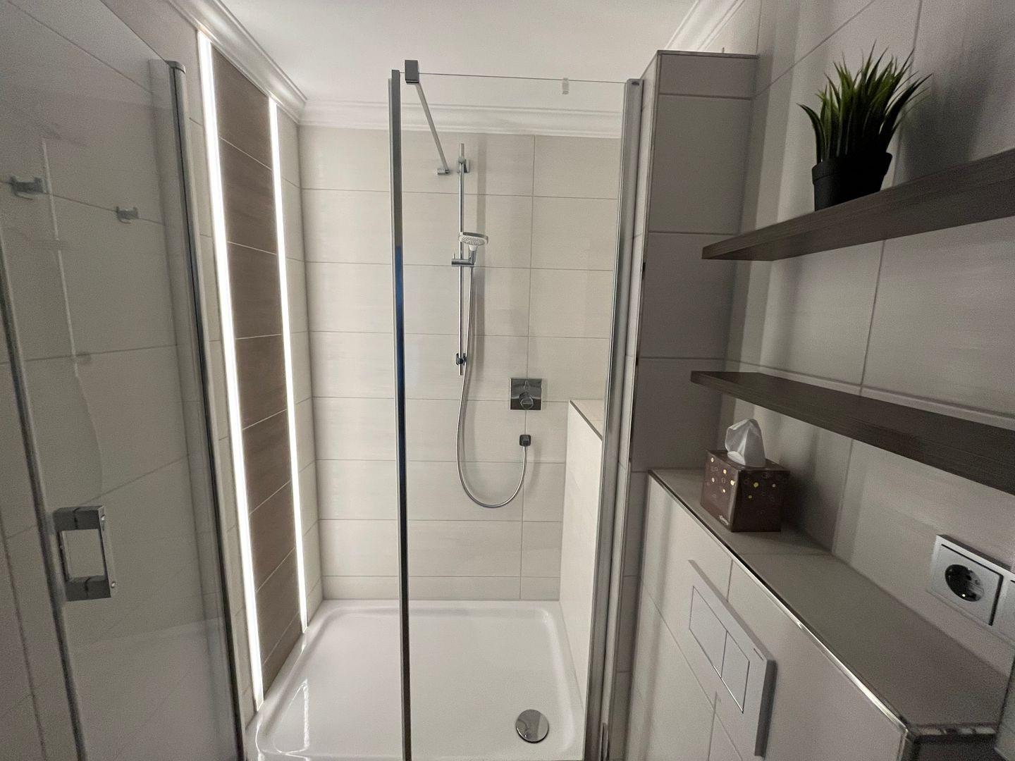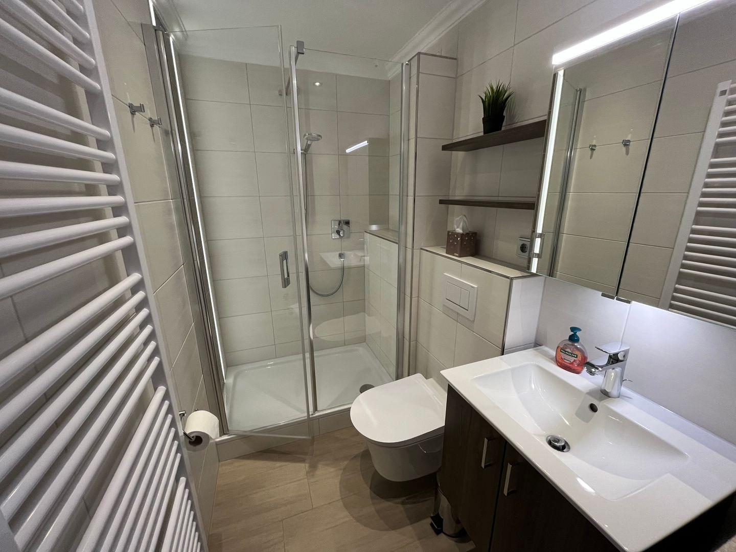 Das Badezimmer (renoviert Ende 2023) ist mit einer erfrischenden Dusche, einem WC und einem Waschbecken mit Unterschrank sowie einem Spiegelschrank ausgestattet, so dass Sie sich jeden Morgen und Abend rundum wohlfühlen können.