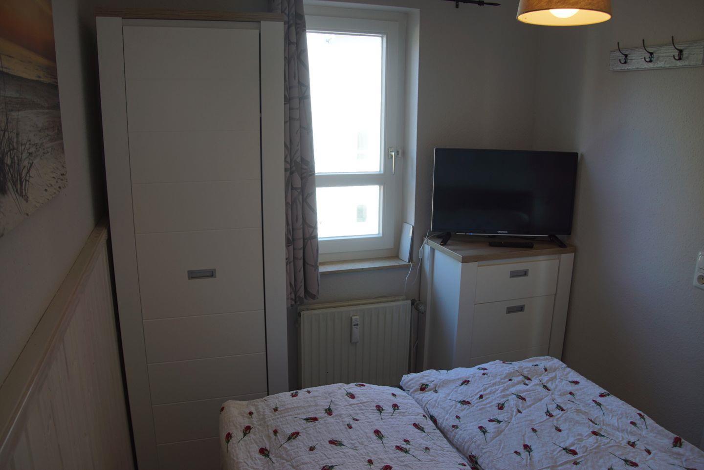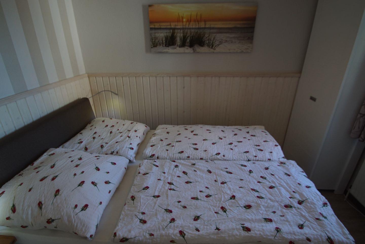 Das gemütliche Schlafzimmer bietet Ihnen einen erholsamen Rückzugsort. Das Doppelbett mit einer Größe von 1,40 x 2 m verspricht eine angenehme Nachtruhe. Der Blick auf die Seebrücke am Morgen wird Ihnen ein Lächeln ins Gesicht zaubern.