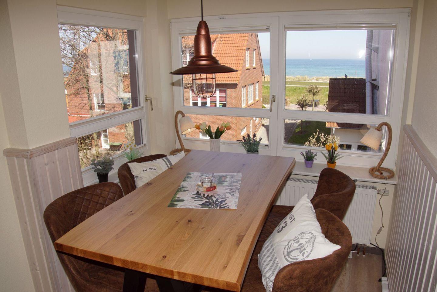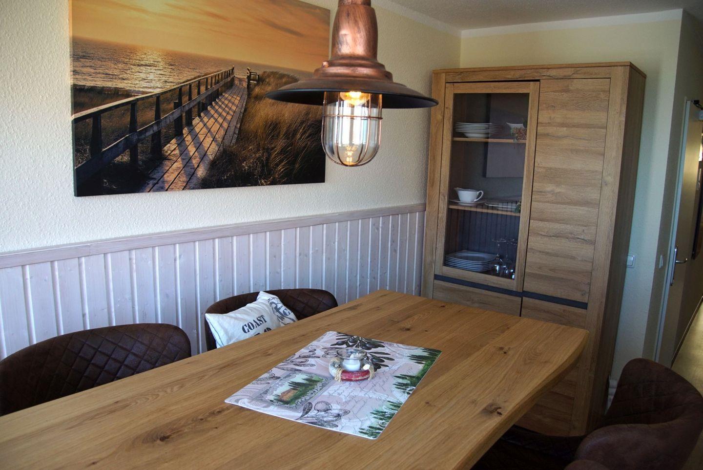 Der Essbereich ist nicht nur ein Ort, an dem Sie Ihre Mahlzeiten einnehmen können, sondern bietet Ihnen auch einen atemberaubenden Blick auf die Ostsee. Der Esstisch mit den vier Stühlen lädt zu geselligen Abenden und gemütlichen Mahlzeiten ein. Ein Kleiderschrank bietet ausreichend Platz, um Ihre Kleidung und persönlichen Gegenstände unterzubringen.