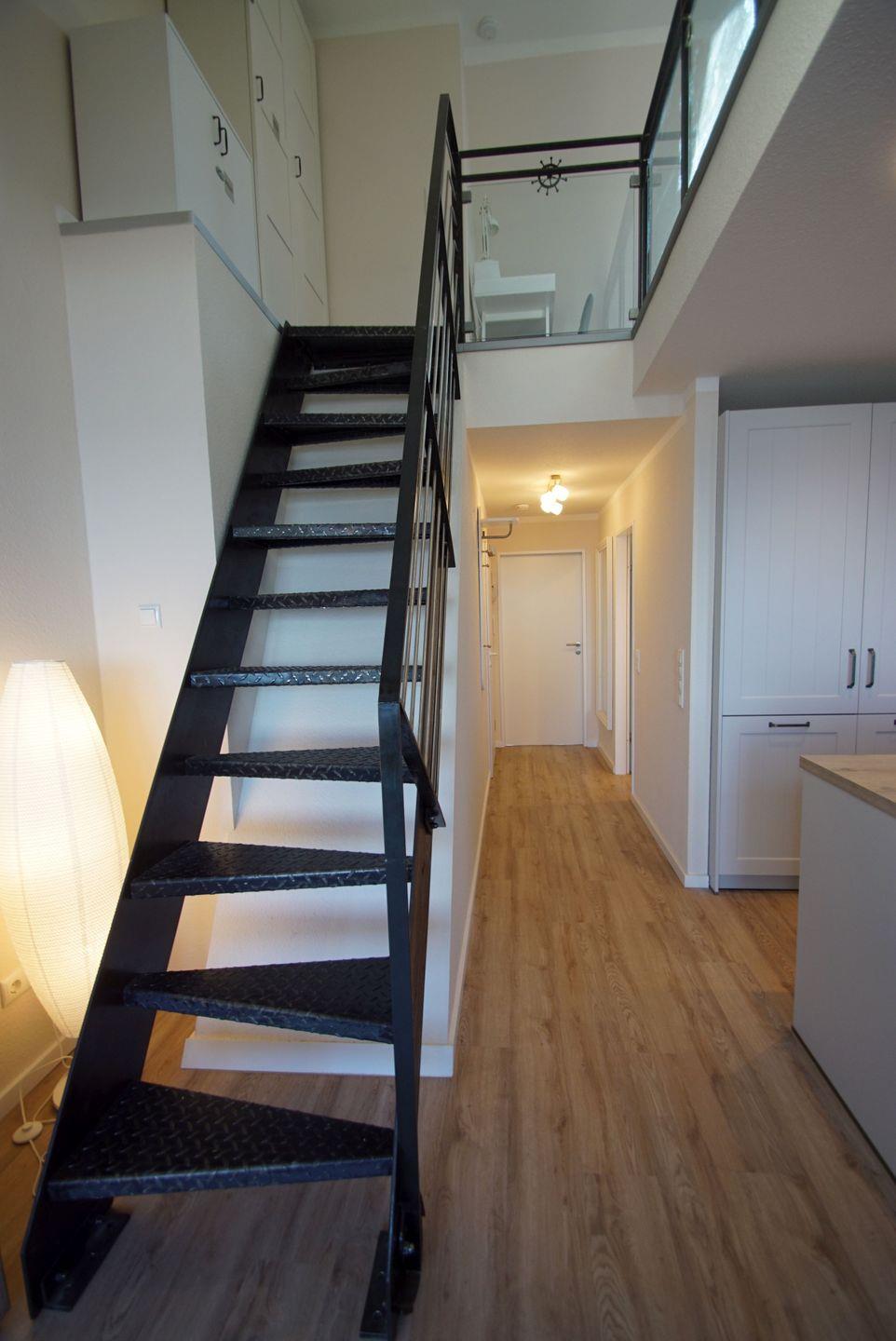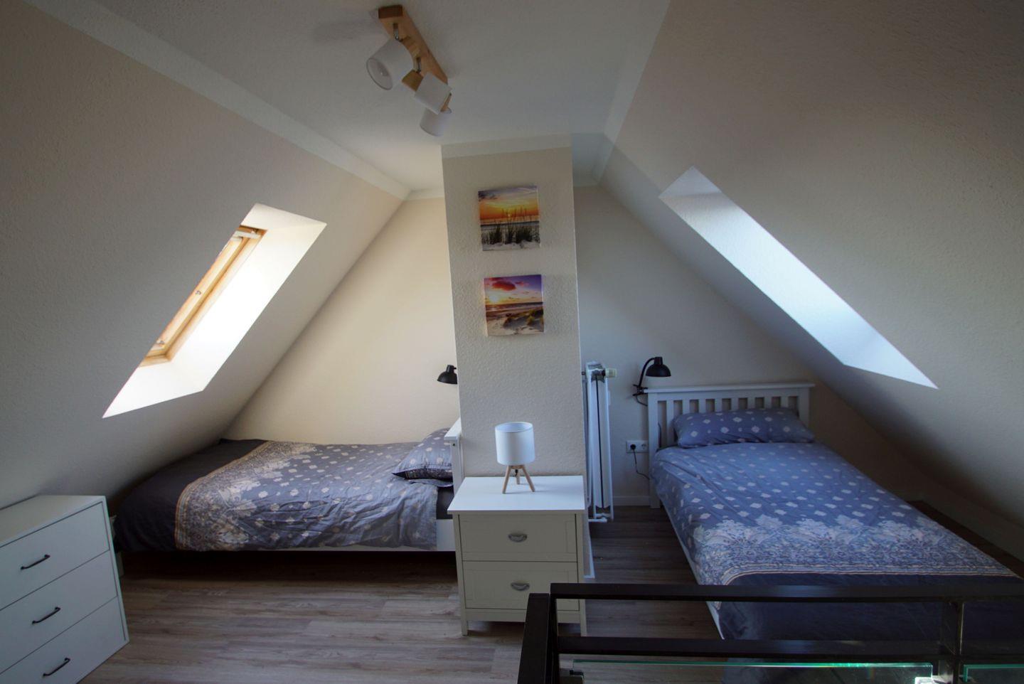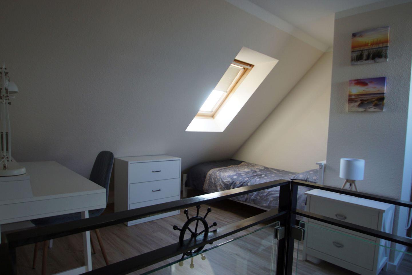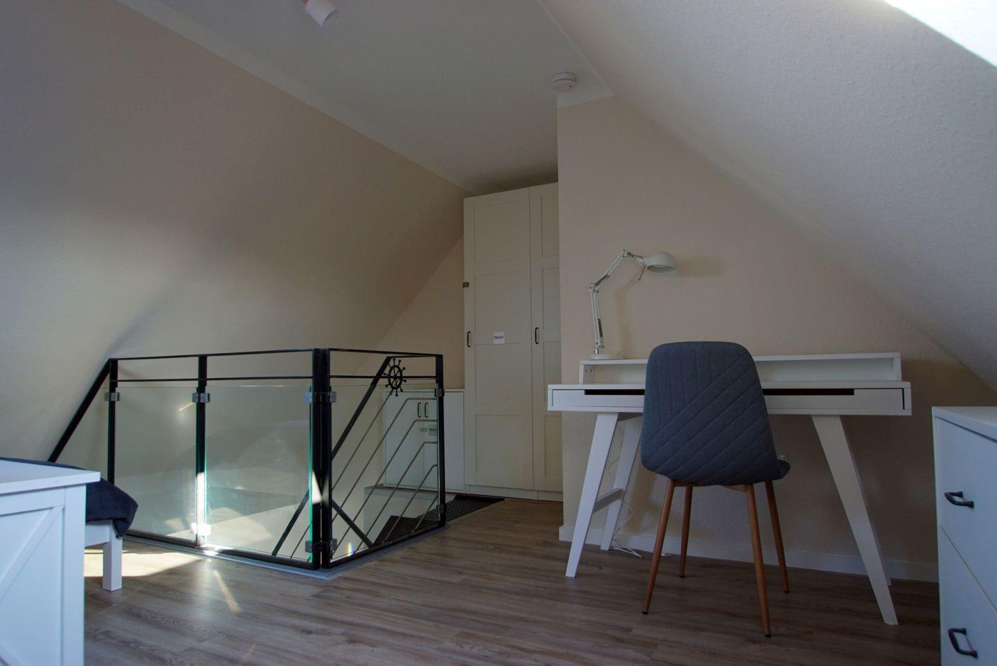 In der Galerie befinden sich zwei weitere Einzelbetten, die sich ideal für Kinder oder zusätzliche Gäste eignen. Ein Kleiderschrank, ein Nachtschrank, eine Kommode und eine Leselampe schaffen ein gemütliches Ambiente. Ein kleiner Arbeitsplatz mit Schreibtisch ermöglicht es Ihnen, auch im Urlaub ein paar wichtige Aufgaben zu erledigen.
