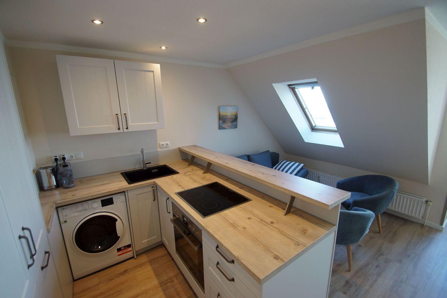Der Innenbereich des Objekts besticht durch seine modern gestaltete und gemütliche Atmosphäre. Die offene Wohnküche mit einem großzügigen Essbereich lädt zum gemeinsamen Kochen und Genießen ein. Die Küche ist komplett ausgestattet und lässt keine Wünsche offen: Ein Ceran-Kochfeld, ein Backofen, eine Mikrowelle, ein Geschirrspüler, ein Kühlschrank mit Gefrierfach, eine Kapselmaschine für Ihren morgendlichen Kaffee und viele weitere praktische Utensilien stehen Ihnen zur Verfügung. Selbst für die kleinen Gäste haben wir Kindergeschirr und -besteck bereitgestellt.