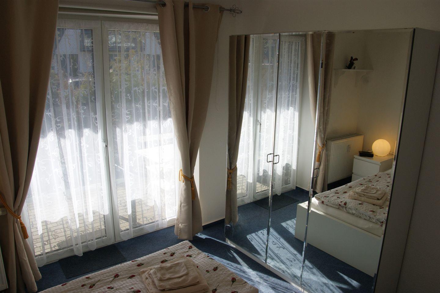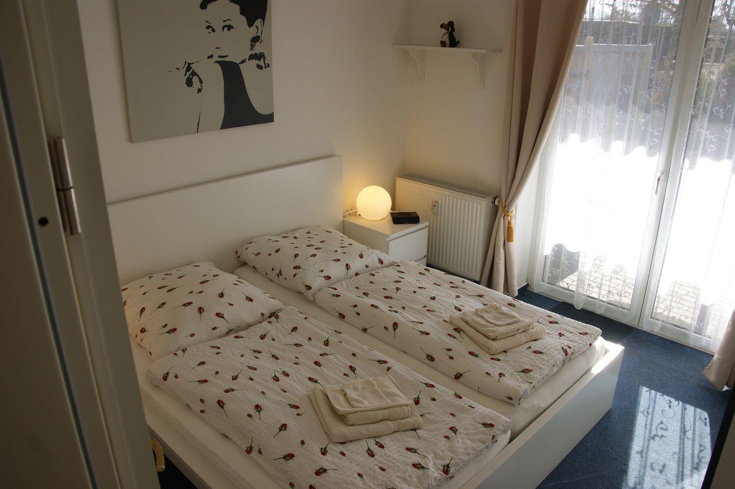 Die Wohnung verfügt über zwei Schlafzimmer, die beide Zugang zur sonnigen Südwest-Terrasse haben. Im ersten Schlafzimmer erwartet Sie ein gemütliches Doppelbett mit zwei Matratzen (1,80 x 2 m) sowie ein großer Einbau-Kleiderschrank. Das helle und freundlich geflieste Ambiente sorgt für eine angenehme Atmosphäre. Das zweite Schlafzimmer bietet ebenfalls ein komfortables Doppelbett mit zwei Matratzen (1,80 x 2 m), einen Spiegel-Kleiderschrank und zwei Nachttische. Hier sorgt der Teppichboden für zusätzlichen Komfort.