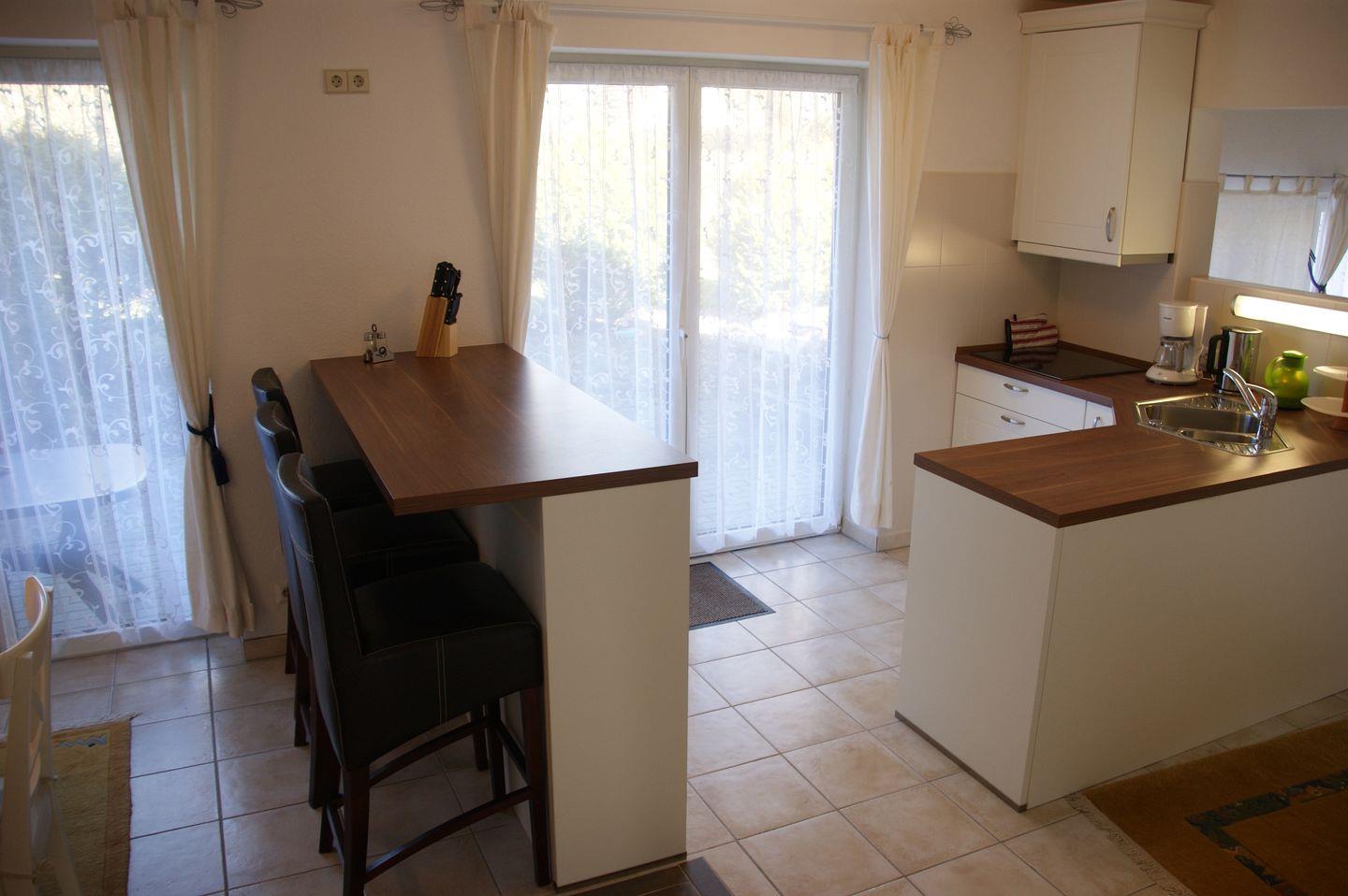 Beim Betreten der Wohnung werden Sie sofort von der geschmackvollen Inneneinrichtung beeindruckt sein. Die Einbauküche ist modern und komplett ausgestattet, mit einem Cerankochfeld, einem Hoch-Backofen, einer Mikrowelle, einer Spülmaschine, einem Kühlschrank mit Gefrierfach und allen weiteren Utensilien, die Sie zum Kochen benötigen. Ein Tresen mit drei Barstühlen lädt zu geselligen Kochabenden ein. Der offene Küchen- und Essbereich bietet einen Esstisch mit vier bequemen Stühlen, an dem Sie gemeinsame Mahlzeiten genießen können.