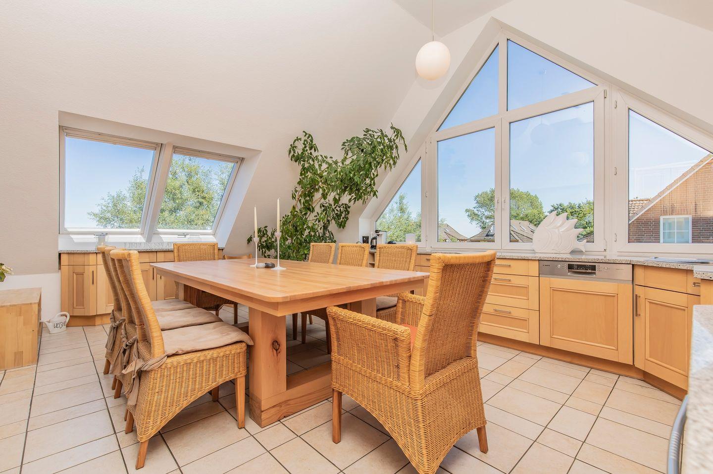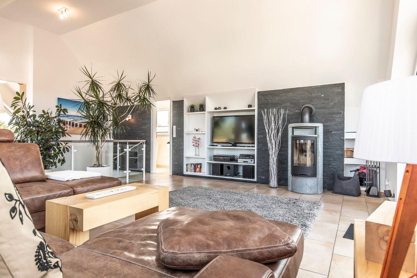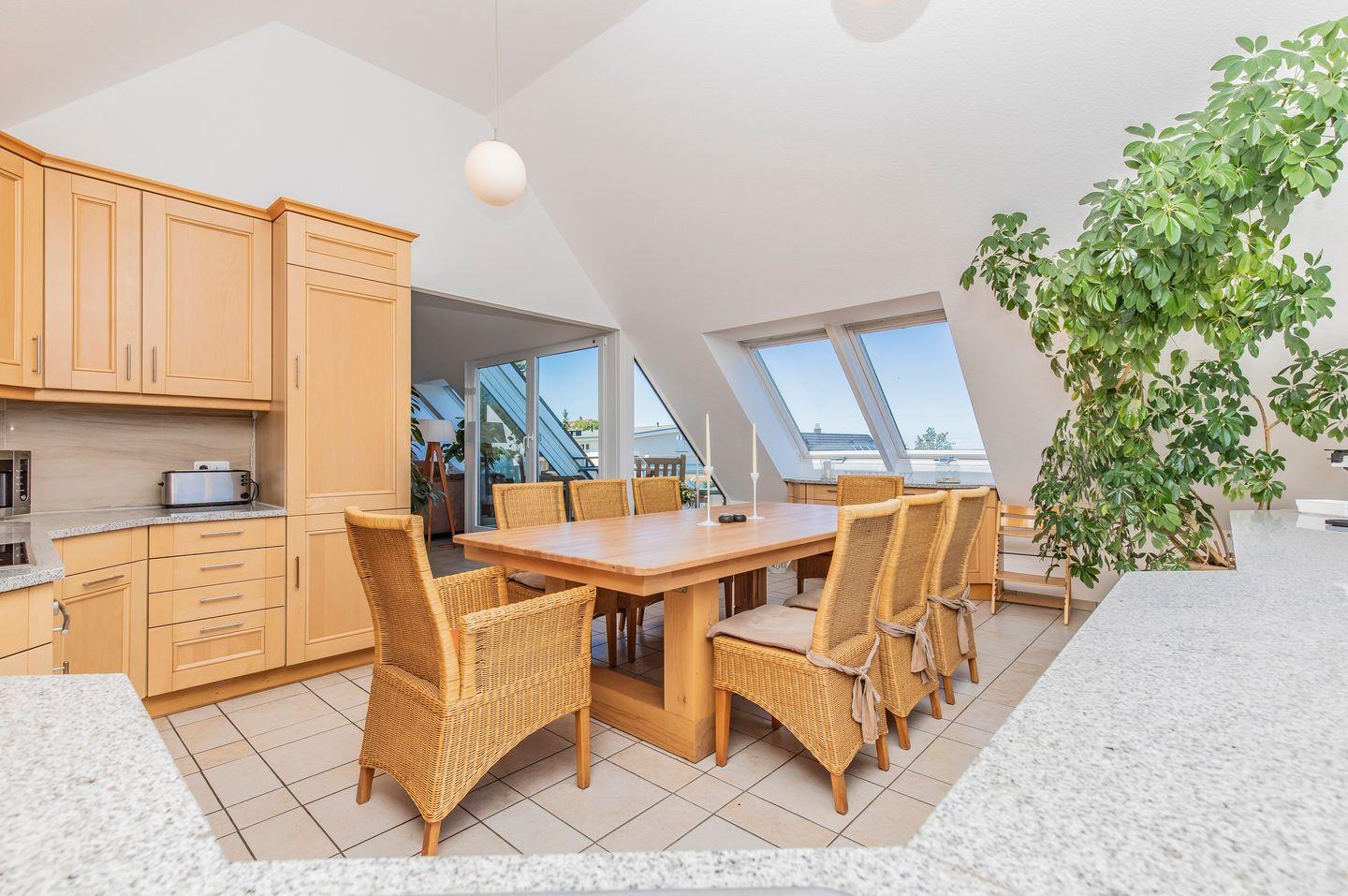 Das Wohnzimmer im Dachgeschoss wird Sie mit seiner Helligkeit und Großzügigkeit beeindrucken. Hier können Sie es sich auf dem luxuriösen Sofa gemütlich machen, den Kamin entfachen und einen Film auf dem Flachbildfernseher mit Dolby-Heimkinoanlage genießen. Der angrenzende Essbereich bietet einen großen Tisch, an dem Sie gemeinsame Mahlzeiten mit Ihren Lieben einnehmen können. Ein Kinderhochstuhl ist ebenfalls vorhanden.