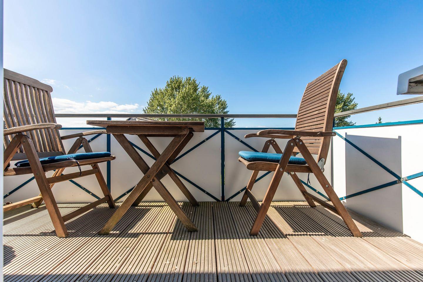 Auf der Dachterrasse erwartet Sie ein Panorama, das Sie sprachlos machen wird. Lehnen Sie sich zurück und lassen Sie Ihren Blick über das glitzernde Meer schweifen. Auf dem angrenzenden Balkon zur Südseite können Sie die warme Sonne und die sanfte Meeresbrise in vollen Zügen genießen. Die Terrassenmöbel mit Sonnenschirmen laden zum Entspannen ein. Ihr Fahrzeug wird sicher im Carport untergebracht, sodass Sie sich keine Sorgen um einen Parkplatz machen müssen.