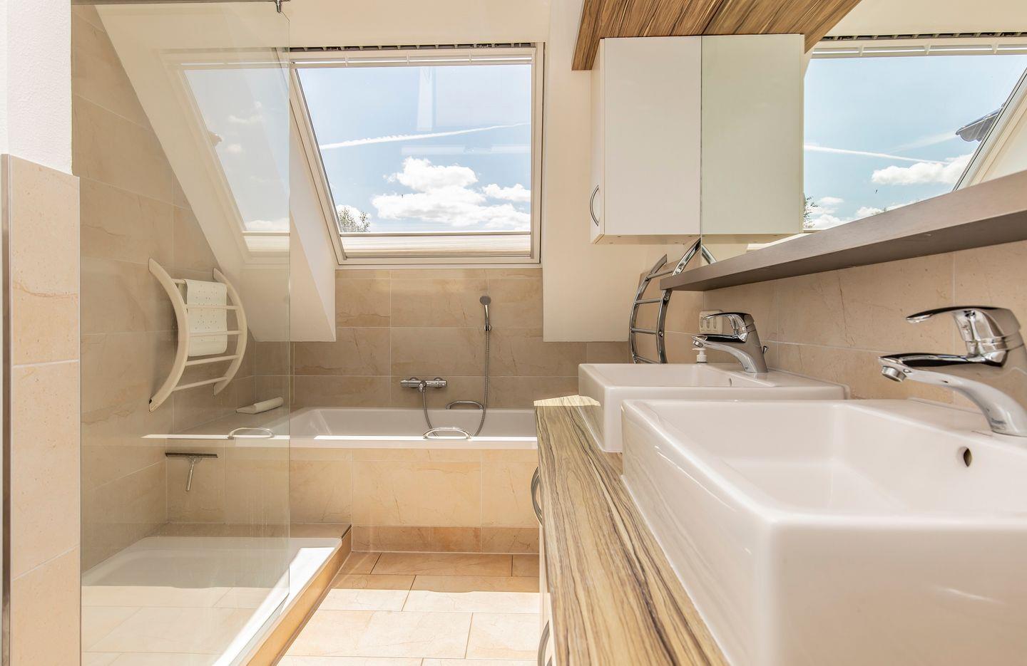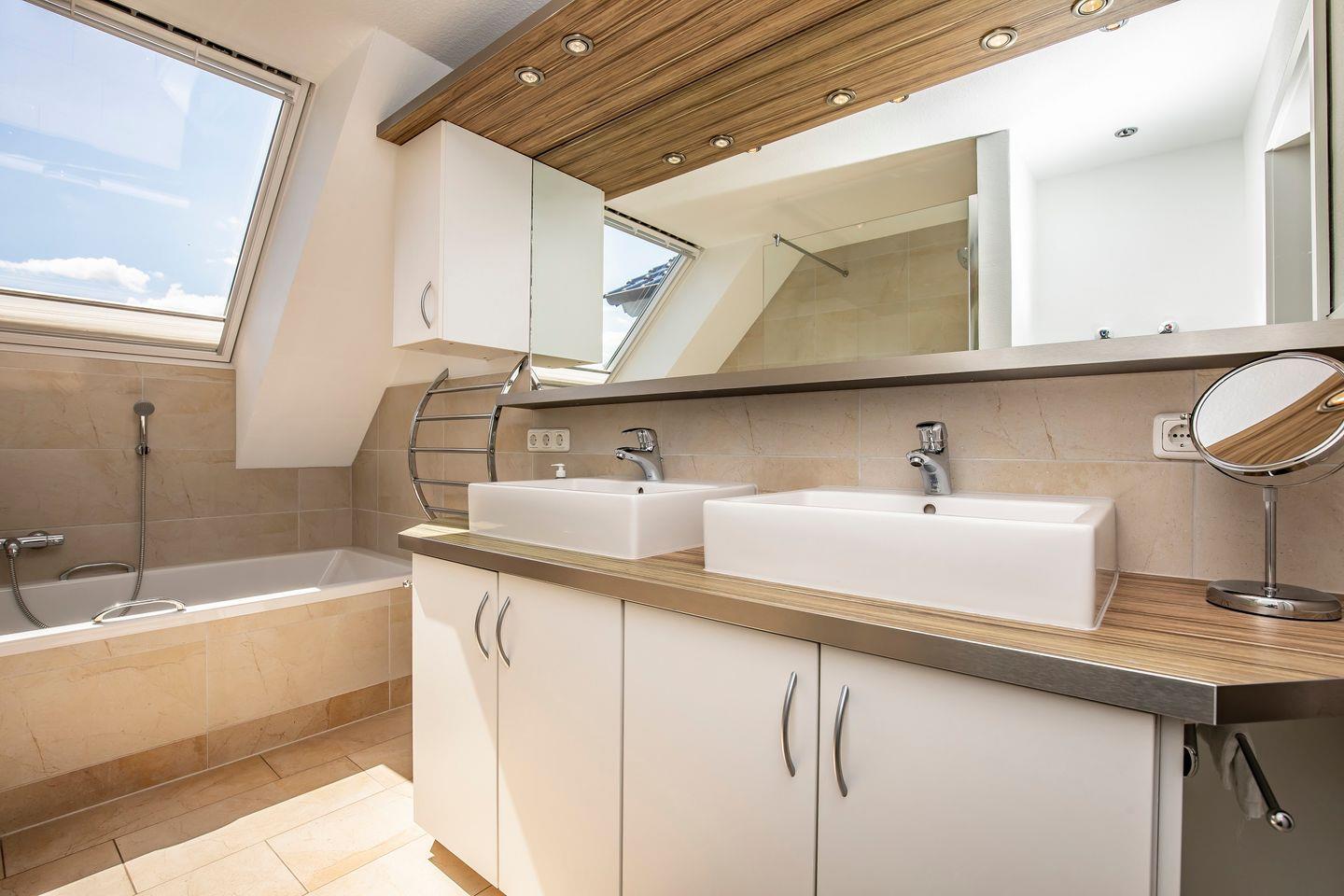 Das Badezimmer ist elegant gestaltet und verfügt über eine Badewanne, eine Dusche, eine Toilette und einen Fön. Zusätzlich gibt es ein Gäste-WC im Dachgeschoss für Ihre Bequemlichkeit.