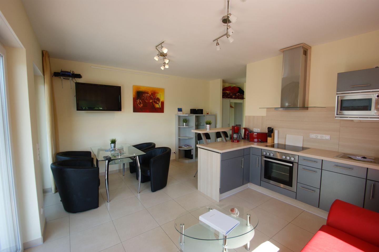 Die Ferienwohnung besteht aus einem hellen und freundlichen Wohnzimmer, das offen zur modernen Küche gestaltet ist. Hier finden Sie alle notwendigen Geräte wie Kühlschrank, Spülmaschine, Mikrowelle und einen Herd mit Ceranfeld. So steht einem gemütlichen Kochabend mit der Familie oder Freunden nichts im Wege. Ein Esstisch und Sofaecke laden zum geselligen Beisammensein ein. Zwei Fernseher sorgen dafür, dass jeder die Möglichkeit hat, seine Lieblingssendungen zu genießen – ideal, wenn Sie nach einem aktiven Tag einfach mal entspannen möchten.