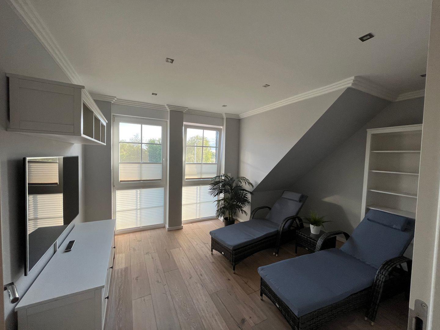 Willkommen in unserem luxuriösen Ferienhaus mit 6 Zimmern und Platz für bis zu 8 Personen (über Weihnachten/Silvester maximal 6 Personen oder nach Absprache). Genießen Sie die ca. 200 m² Wohnfläche, 4 Schlafzimmer und einen großen Fernseher im Wohnzimmer. Entspannen Sie in der Sauna, dem Ruheraum und dem Wellnessbereich im Freien mit Liegen und Außendusche. Ein Whirlpool steht zur Verfügung und dient ausschließlich zum Baden (Frostschutz: Vom November bitte nicht befüllen). Bitte beachten Sie, dass dieser keine Massage- und Heizfunktion hat. Im großen Garten sorgt ein Mähroboter für Pflege, während Sie den Außenbereich mit Tisch, Sonnenschirm, Strandkorb und Gasgrill nutzen können. Waschmaschine, Trockner und Fahrradabstellraum sind vorhanden. Kinder sind durch Treppenschutzgitter geschützt, und der Strand ist nur 300 m entfernt.