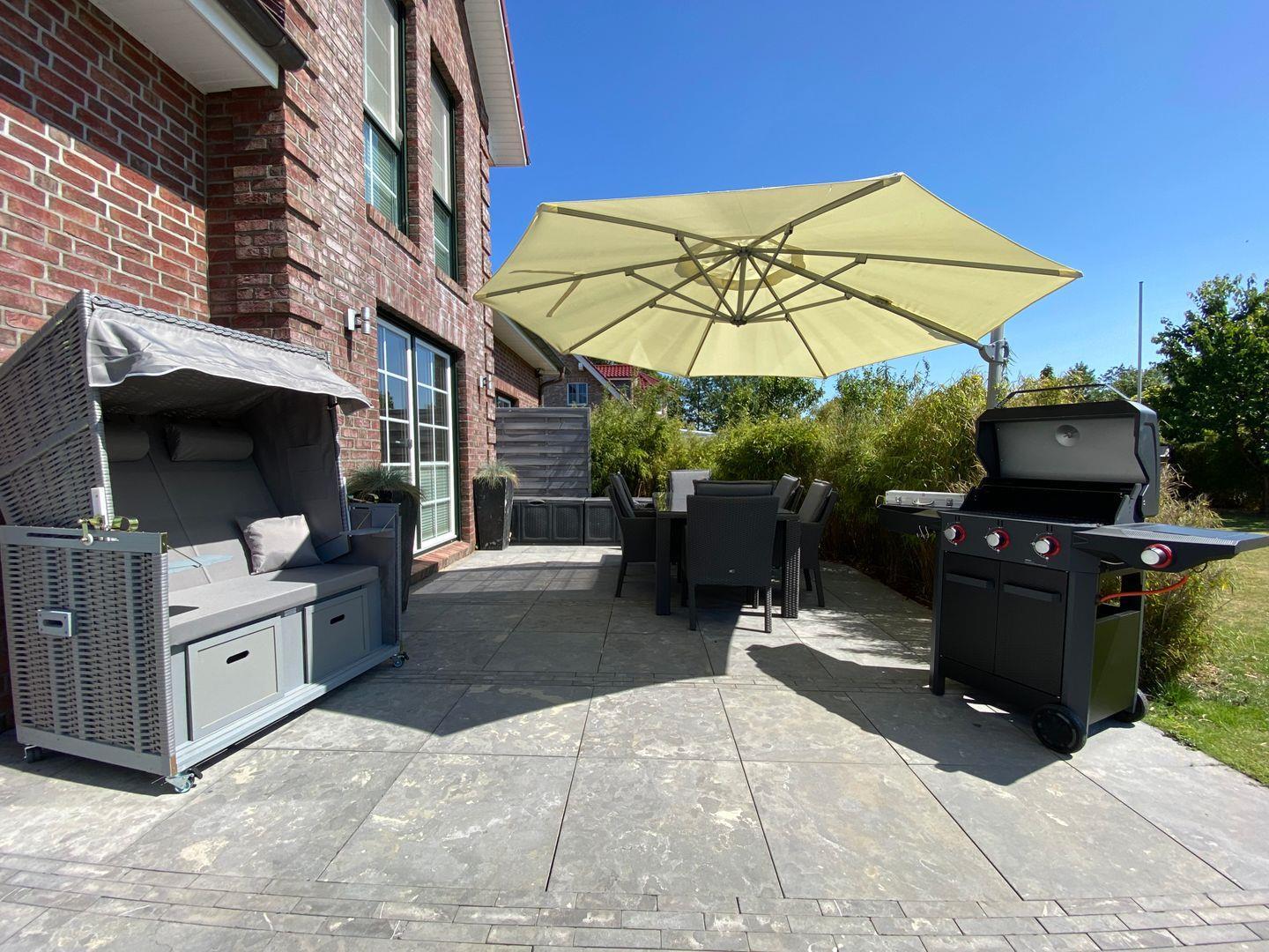 Unser Ferienhaus verfügt über einen großen Garten, der von einem Mähroboter gepflegt wird, sodass Sie die Natur in vollen Zügen genießen können. Der Außenbereich ist mit einem Tisch für 6 Personen, einem Sonnenschirm, einem Strandkorb und einem Gasgrill ausgestattet, sodass Sie im Freien entspannte Mahlzeiten genießen können. Eine Tischtennisplatte (ohne Zubehör) sowie eine Schaukel (nur für Kinder) sind ebenfalls vorhanden.