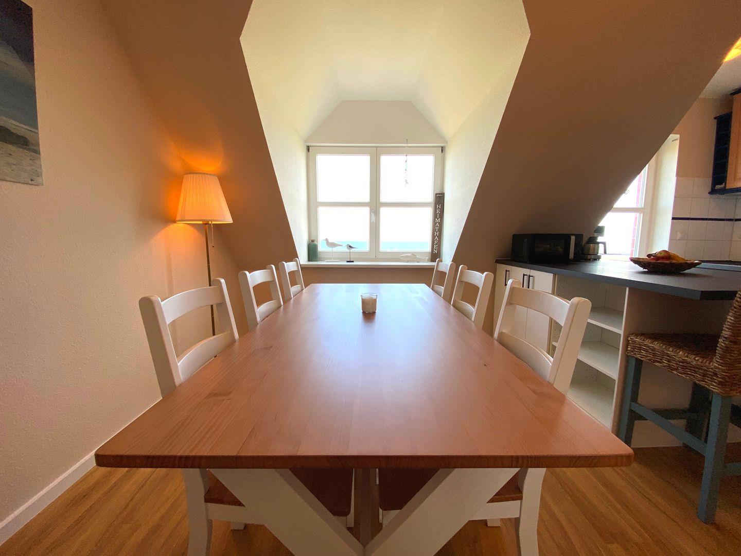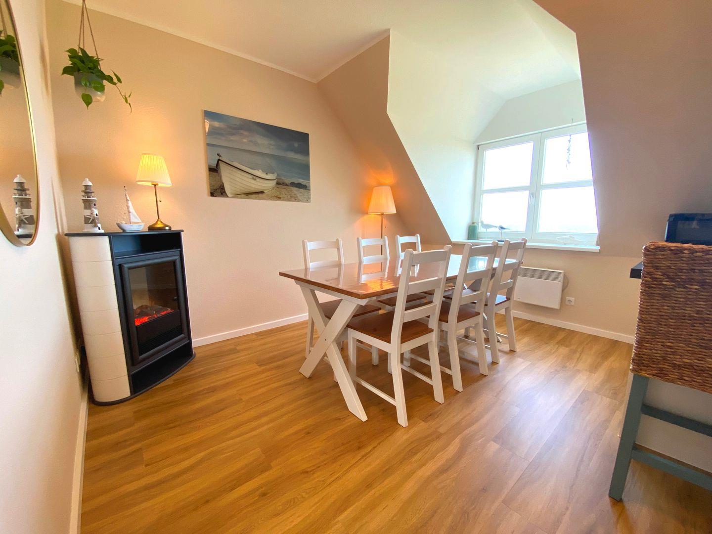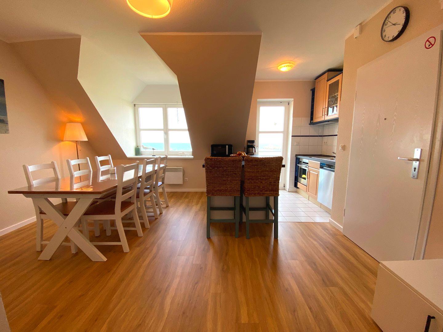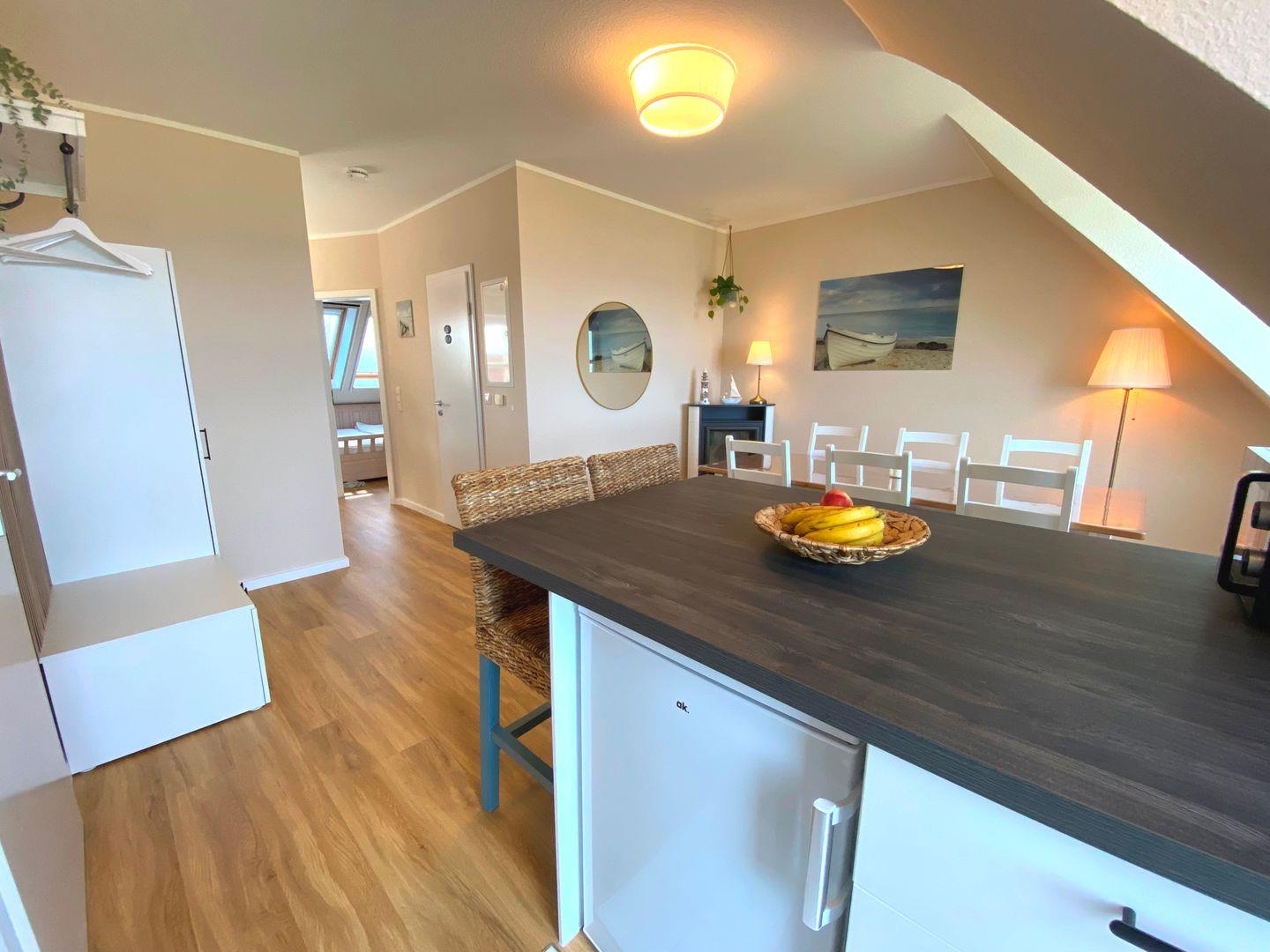 Im vorderen Teil der Wohnung ist das geschmackvoll eingerichtete Esszimmer mit einem charmanten Elektrokamin, der eine warme und einladende Atmosphäre schafft. Angrenzend befindet sich eine große Theke sowie eine komplett ausgestattete Küchenzeile, die keine Wünsche offenlässt: Backofen, Spülmaschine und ein Kühlschrank mit Gefrierfach gehören u.a. zur Ausstattung. Von hier aus gelangen Sie direkt auf den möblierten Balkon, der zum Verweilen und Genießen des Meeresblicks einlädt.