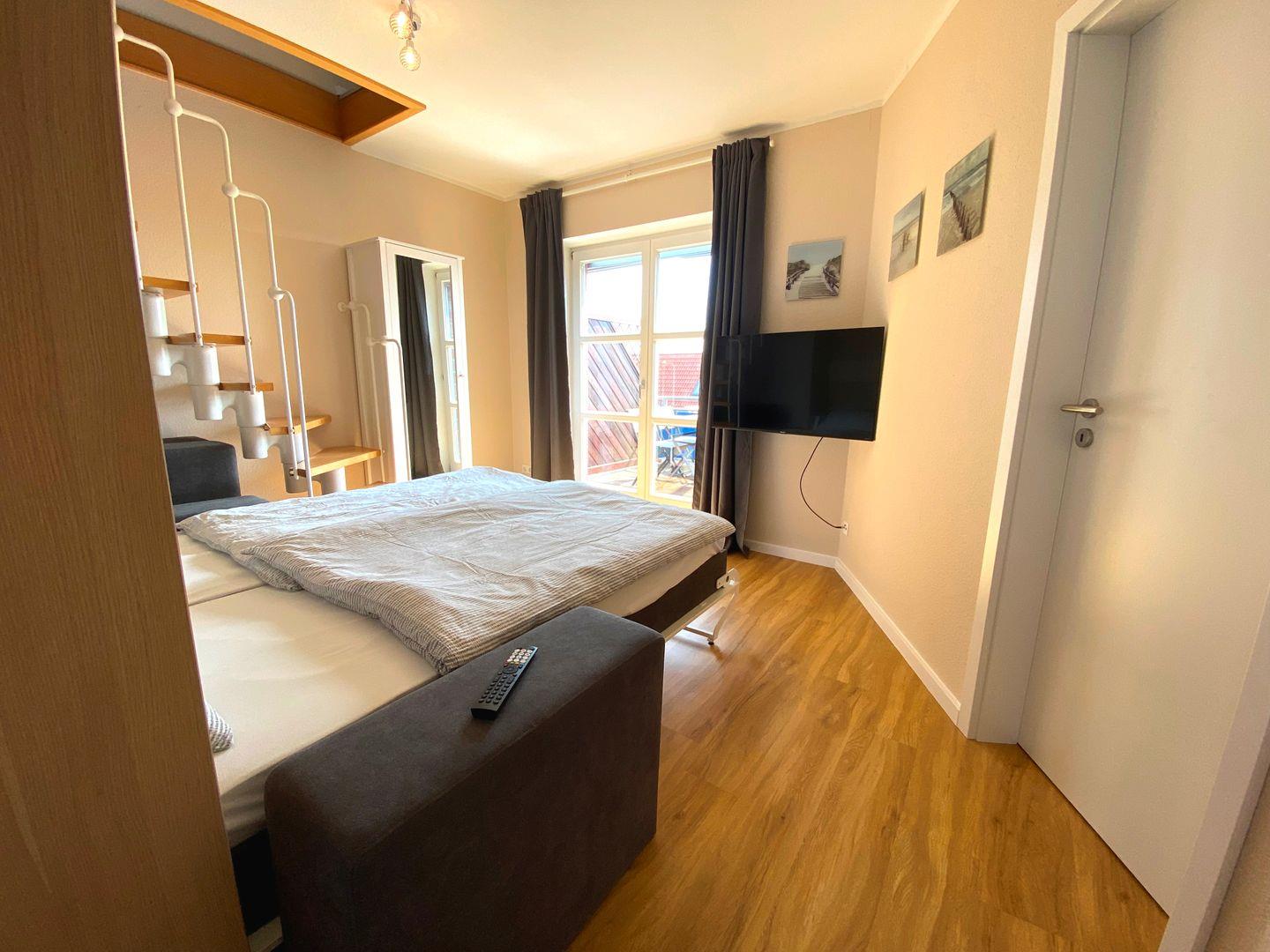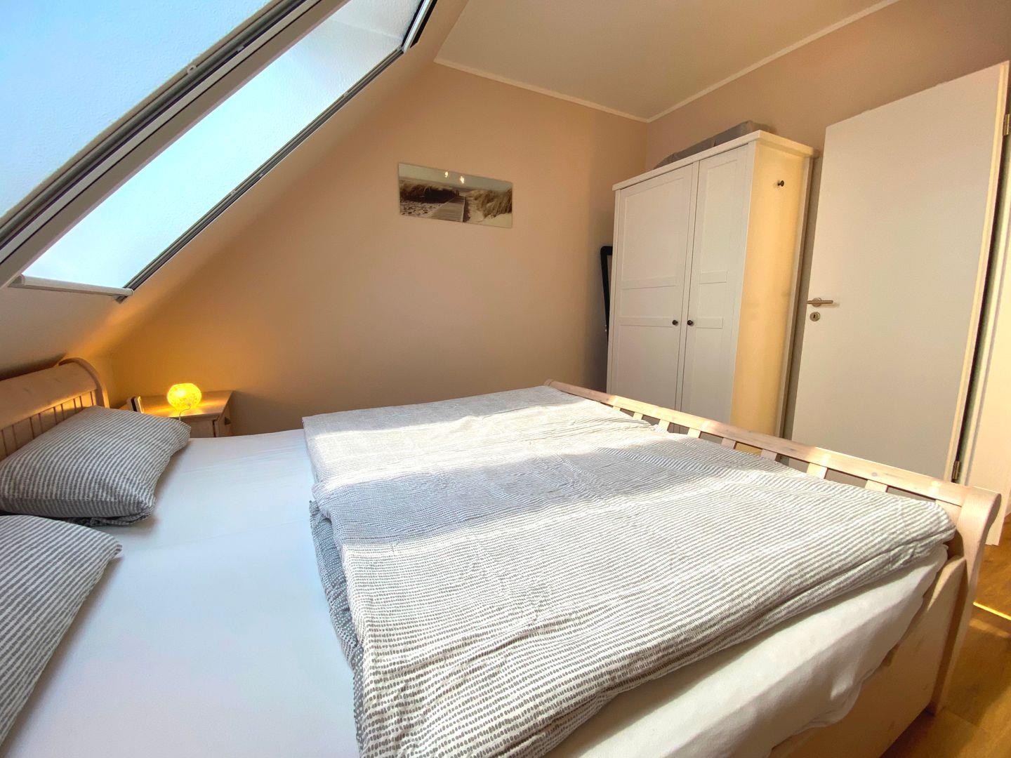Im hinteren Bereich der Wohnung erwartet Sie ein gemütliches Schlafzimmer mit einem bequemen Doppelbett mit Rausfallschutz für Kleinkinder und einem geräumigen Kleiderschrank. Das angrenzende Wohnzimmer kann bei Bedarf mühelos in ein weiteres Schlafzimmer verwandelt werden, sodass auch Familien oder befreundete Paare genügend Platz finden. Das moderne Duschbad mit Fenster bietet die Möglichkeit, sich nach einem langen Tag am Strand zu erfrischen.