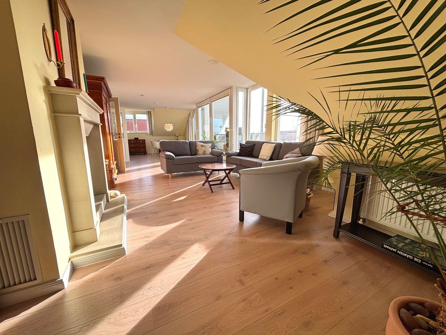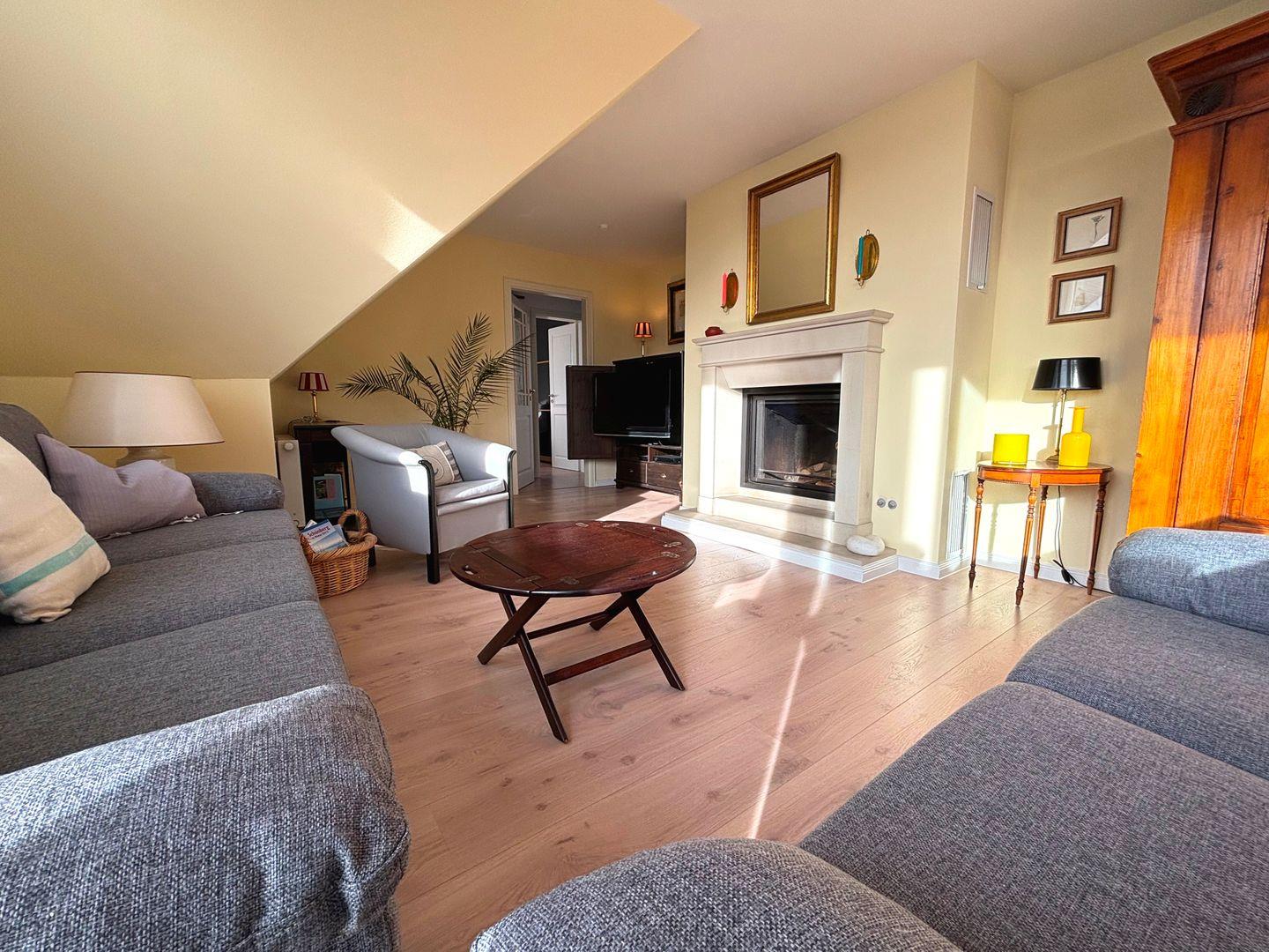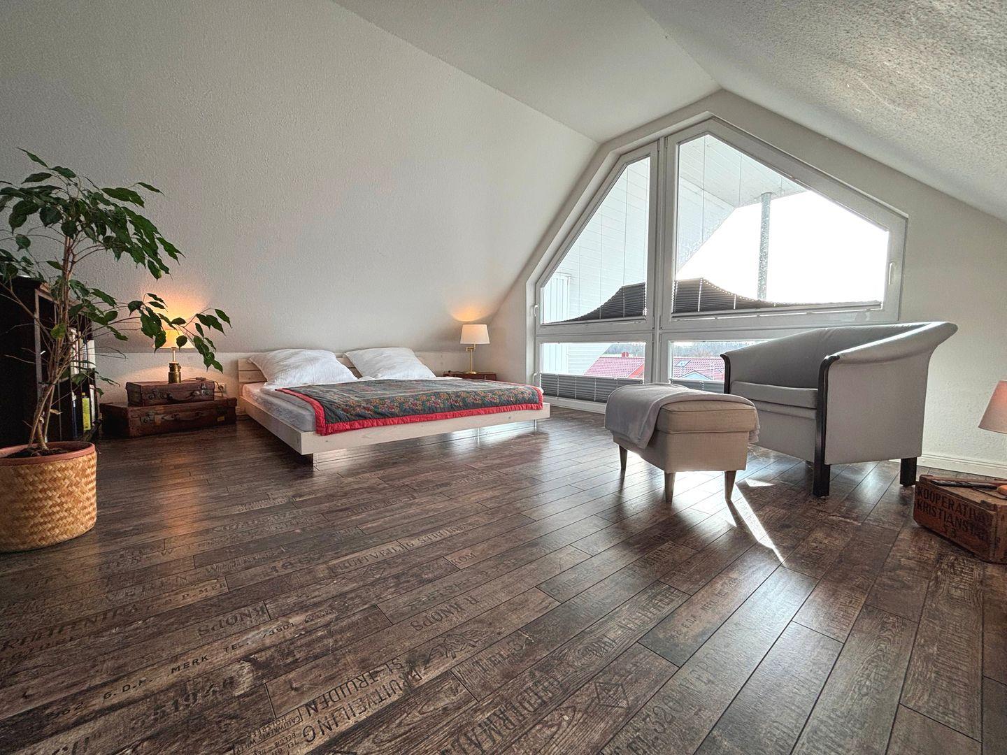 Die Wohnung besticht durch drei stilvolle Schlafzimmer, die alle mit komfortablen Laminatböden ausgestattet sind. Jedes Zimmer lädt zum Träumen und Entspannen ein. Das großzügige Wohn- und Esszimmer ist der ideale Ort, um gemeinsame Zeit zu verbringen oder die Abende stimmig ausklingen zu lassen. Hier finden Sie ein bequemes Sofa, einen großen Esstisch und einen Kamin, der für eine angenehme Atmosphäre sorgt.