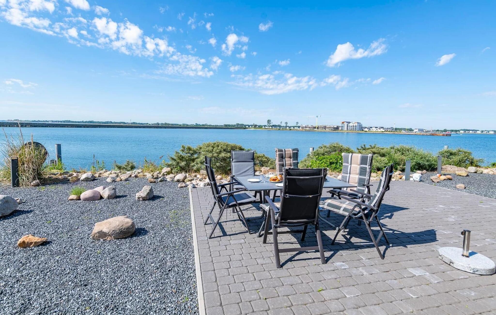Im Norden des Ostseeresorts Olpenitz auf der ins Meer hineinragenden Mole und unmittelbar am Meer liegt die Ferienwohnung Schöne Aussicht auf der Ostsee mit einer großen Sonnenterrasse, die eine herrliche Aussicht auf den Hafen des Resorts und die Hafeneinfahrt bietet.