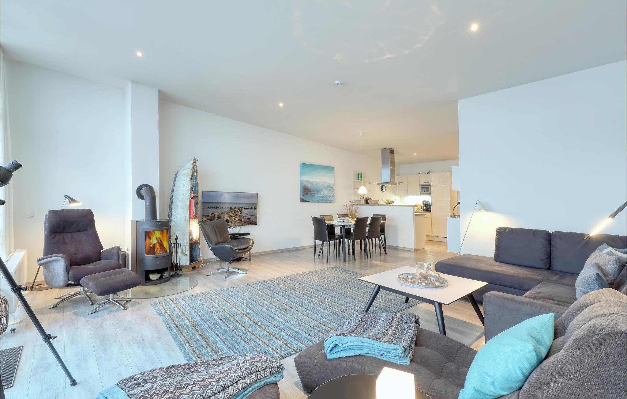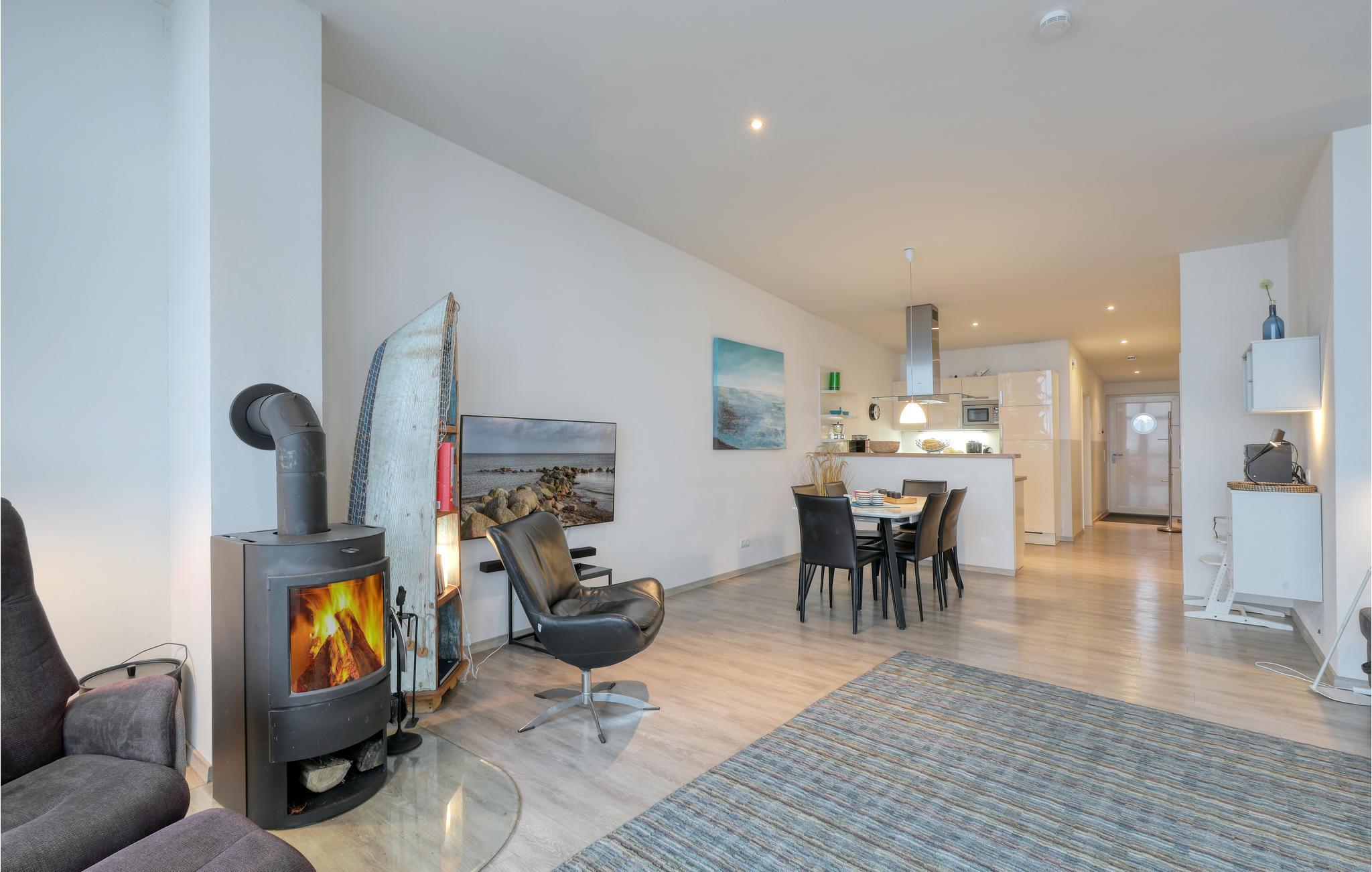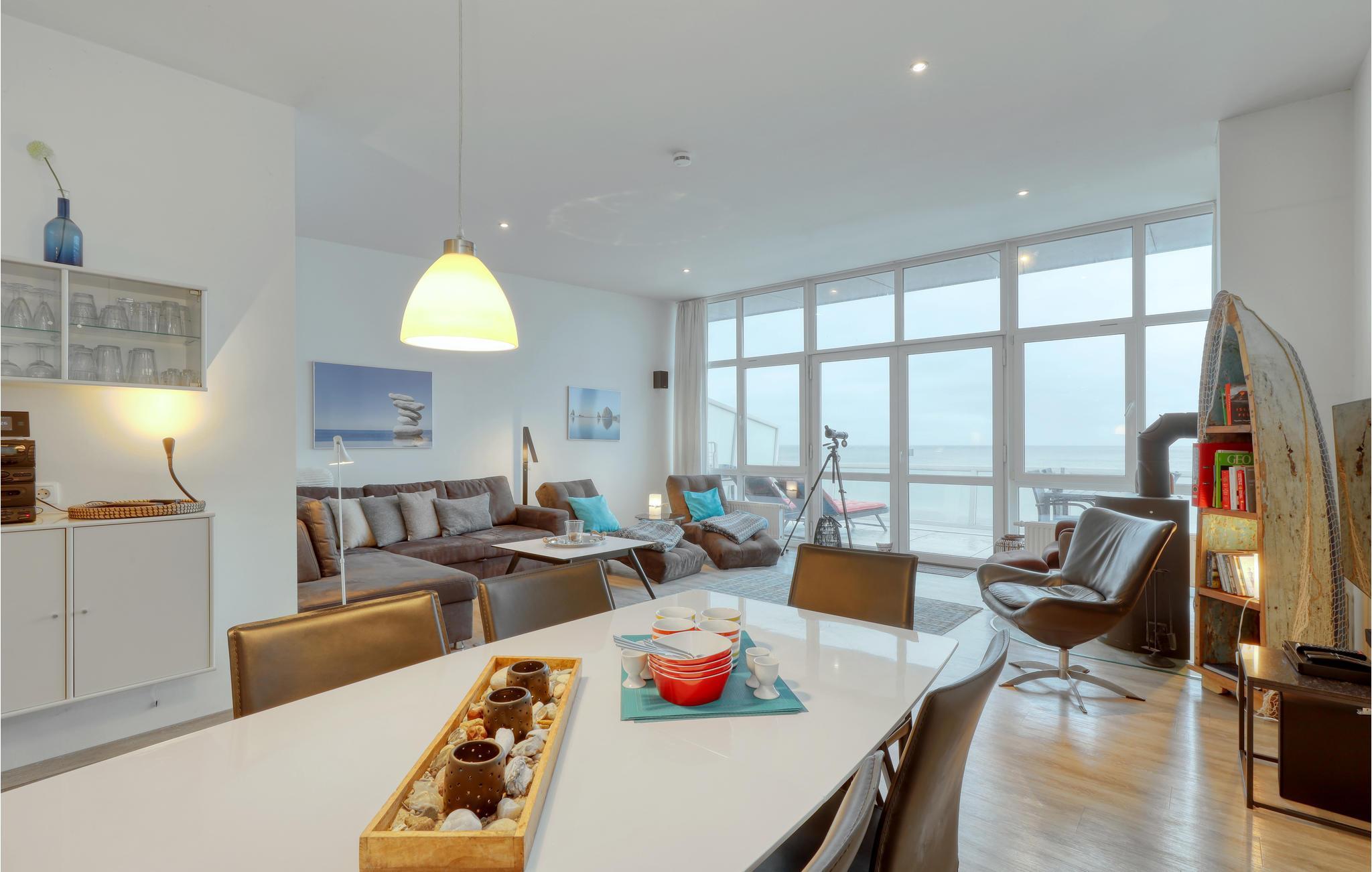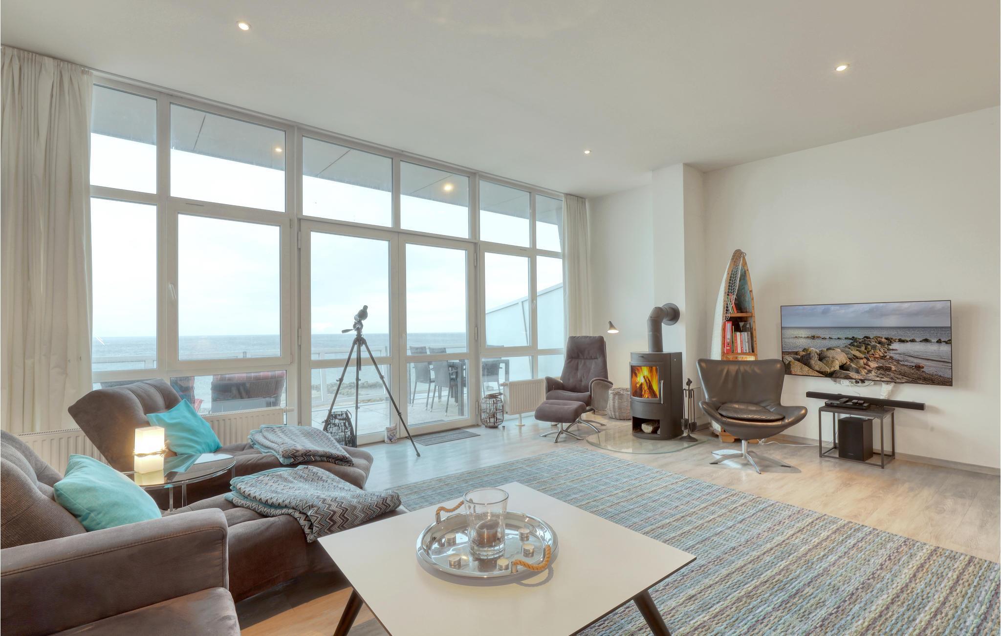 Die Ferienwohnung bietet mit 110 m2 viel Platz für bis zu sechs Personen (zwei Schlafplätze auf dem ausziehbaren Sofa im Wohnbereich) und verfügt über eine eigene, kleine Wellnessoase mit 2-Personen-Whirlpool und Sauna. Im Winter sorgt der skandinavische Kaminofen für eine besonders gemütliche Atmosphäre - hier kann man neben dem knisternden Kaminfeuer die Panoramaaussicht auf die stürmische Ostsee genießen. WLAN mit Glasfaser ist vorhanden.
