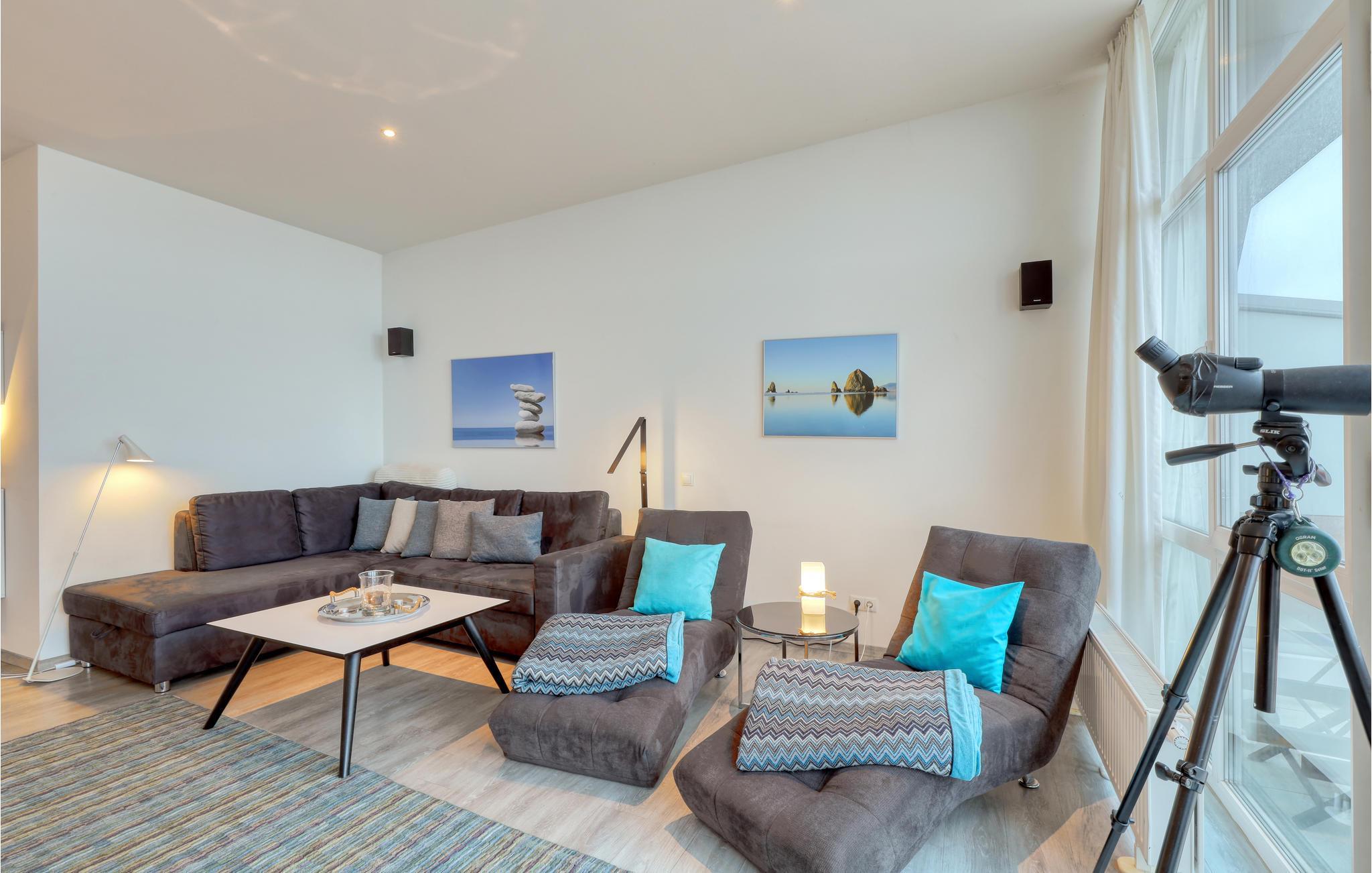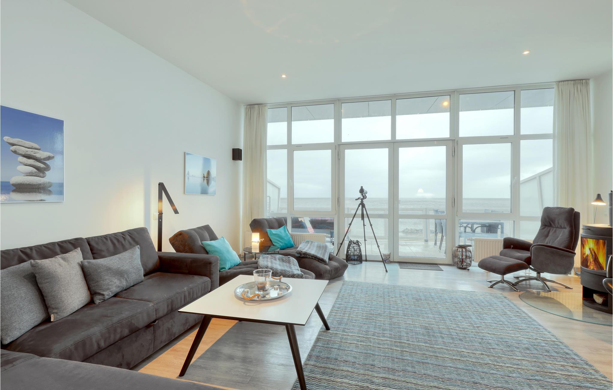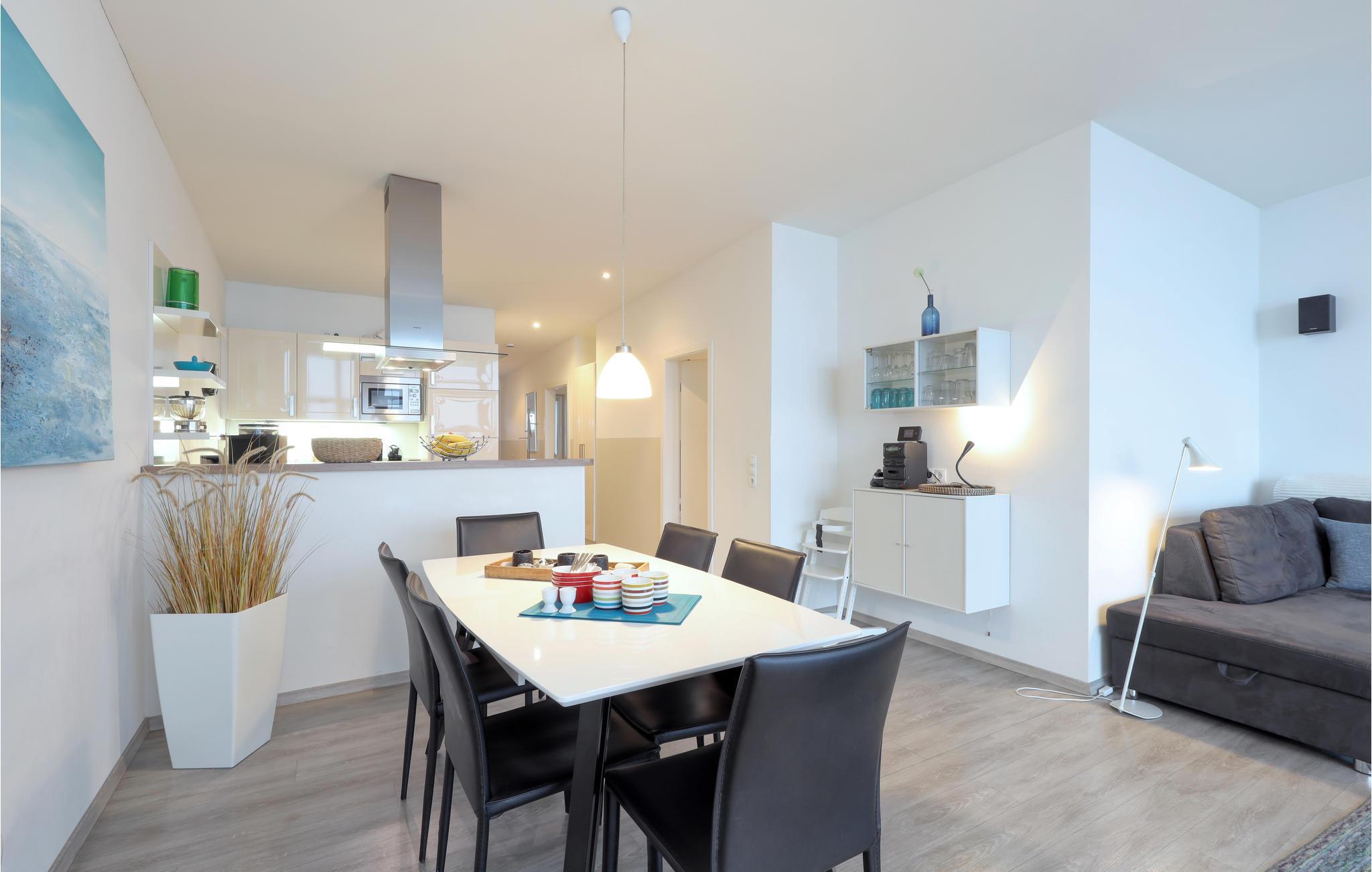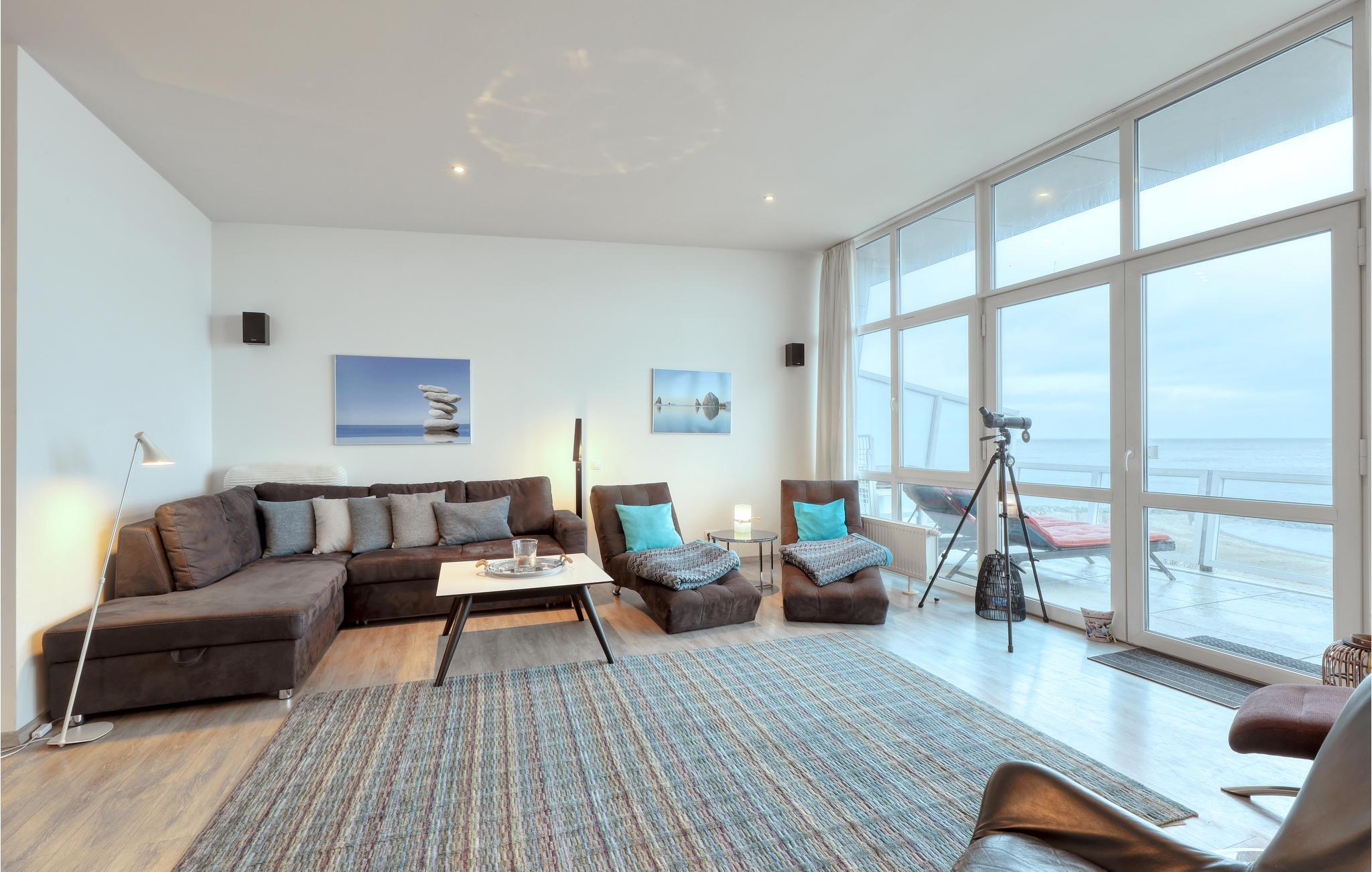 Die Ferienwohnung bietet mit 110 m2 viel Platz für bis zu sechs Personen (zwei Schlafplätze auf dem ausziehbaren Sofa im Wohnbereich) und verfügt über eine eigene, kleine Wellnessoase mit 2-Personen-Whirlpool und Sauna. Im Winter sorgt der skandinavische Kaminofen für eine besonders gemütliche Atmosphäre - hier kann man neben dem knisternden Kaminfeuer die Panoramaaussicht auf die stürmische Ostsee genießen. WLAN mit Glasfaser ist vorhanden.